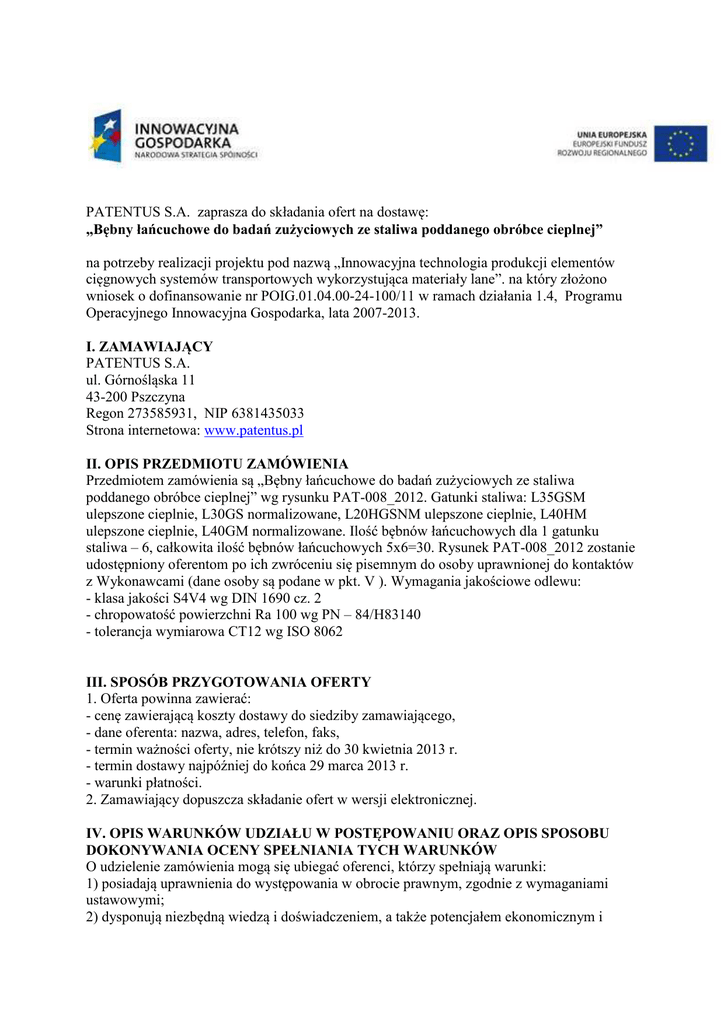 PATENTUS S.A. zaprasza do składania ofert na dostawę: dostaw „Bębny łańcuchowe cuchowe do badań zużyciowych yciowych ze staliwa poddanego obróbce cieplnej” na potrzeby realizacji projektu pod nazwą nazw „Innowacyjna technologia produkcji elementów cięgnowych systemów transportowych wykorzystująca wykorzystuj ca materiały lane”. na który złożono zło wniosek o dofinansowanie nr POIG.01.04.00-24-100/11 POIG.01.04.00 100/11 w ramach działania 1.4, Programu Operacyjnego Innowacyjna Gospodarka, lata 2007-2013. 2007 I. ZAMAWIAJĄCY PATENTUS S.A. ul. Górnośląska 11 43-200 Pszczyna Regon 273585931, NIP 6381435033 Strona internetowa: www.patentus.pl II. OPIS PRZEDMIOTU ZAMÓWIENIA Przedmiotem zamówienia sąą „Bębny „Bę łańcuchowe do badań zużyciowych yciowych ze staliwa poddanego obróbce bce cieplnej” wg rysunku PAT-008_2012. PAT 008_2012. Gatunki staliwa: L35GSM ulepszone cieplnie, L30GS normalizowane, L20HGSNM ulepszone cieplnie, L40HM ulepszone cieplnie, L40GM normalizowane. Ilość Ilo bębnów łańcuchowych dla 1 gatunku staliwa – 6, całkowita ilość bębnów łańcuchowych 5x6=30. Rysunek PAT--008_2012 zostanie udostępniony pniony oferentom po ich zwróceniu się si pisemnym do osoby uprawnionej do kontaktów z Wykonawcami (dane osoby są podane w pkt. V ). Wymagania jakościowe ściowe odlewu: - klasa jakości ci S4V4 wg DIN 1690 cz. 2 - chropowatość powierzchni Ra 100 wg PN – 84/H83140 - tolerancja wymiarowa CT12 wg ISO 8062 III. SPOSÓB PRZYGOTOWANIA OFERTY 1. Oferta powinna zawierać: - cenę zawierającą koszty dostawy do siedziby zamawiającego, zamawiaj - dane oferenta: nazwa, adres, telefon, faks, fa - termin ważności ci oferty, nie krótszy niż ni do 30 kwietnia 2013 r. - termin dostawy najpóźniej źniej do końca ko 29 marca 2013 r. - warunki płatności. 2. Zamawiający cy dopuszcza składanie ofert w wersji elektronicznej. IV. OPIS WARUNKÓW UDZIAŁU W POSTĘPOWANIU POST ORAZ Z OPIS SPOSOBU DOKONYWANIA OCENY SPEŁNIANIA TYCH WARUNKÓW O udzielenie zamówienia mogą się ubiegać oferenci, którzy spełniająą warunki: 1) posiadają uprawnienia do występowania wyst powania w obrocie prawnym, zgodnie z wymaganiami ustawowymi; 2) dysponują niezbędną wiedzą zą i doświadczeniem, a takżee potencjałem ekonomicznym i technicznym oraz pracownikami zdolnymi do wykonania danego zamówienia; Z ubiegania się o udzielenie zamówienia wykluczeni zostaną oferenci, którzy: 1. w odniesieniu, do których wszczęto postępowanie upadłościowe, 2. dostawców lub wykonawców będących osobami fizycznymi lub wspólnikami spółek, o których powzięto informację o prawomocnym skazaniu za przestępstwo popełnione w celu osiągnięcia korzyści majątkowej. Jednocześnie Zamawiający zastrzega sobie prawo wykluczenia z postępowania oferentów, którzy w toku postępowania udzielili nieprawdziwych informacji. Wykluczenie oferenta oraz odrzucenie oferty z powodu nie spełnienia określonych wymagań może nastąpić w każdym stadium postępowania o udzielenie zamówienia. Ocena spełnienia warunków wymaganych od wykonawców zostanie dokonana wg formuły „spełnia – nie spełnia” w oparciu o informacje zawarte w dokumentach i oświadczeniach wymaganych niniejszą specyfikacją. V. INFORMACJE O SPOSOBIE POROZUMIEWANIA SIĘ ZAMAWIAJĄCEGO Z WYKONAWCAMI Osobą uprawnioną do kontaktów z Wykonawcami jest – Jakub Nędza w godz. 7.oo – 15.oo, e.mail [email protected], [email protected] tel.: 322101100 VI. MIEJSCE ORAZ TERMIN SKŁADANIA OFERT 1. Oferty należy składać w siedzibie zamawiającego w sekretariacie w terminie do 22.03.2013 r. do godz. 15.00 lub na adres email: [email protected], [email protected] VII. TRYB OCENY OFERT Zamawiający udzieli zamówienia Wykonawcy, którego oferta spełnia wszystkie wymagania zawarte w niniejszej Specyfikacji i zostanie oceniona jako najkorzystniejsza w oparciu o podane poniżej kryterium: Kryterium: Cena – 80 % Referencje– 20% VIII. INFORMACJE O FORMALNOŚCIACH, JAKIE POWINNY ZOSTAĆ DOPEŁNIONE PO WYBORZE OFERTY W CELU ZAWARCIA UMOWY Oferent, który wygrał przetarg, zobowiązany będzie do zawarcia umowy w terminie i miejscu oraz na warunkach określonych przez zamawiającego. IX. ISTOTNE DLA STRON POSTANOWIENIA, KTÓRE ZOSTANĄ WPROWADZONE DO TREŚCI ZAWIERANEJ UMOWY 1. Zamawiający podpisze umowę z Oferentem, który przedłoży najkorzystniejszą ofertę. 2. Umowa zostanie zawarta z uwzględnieniem postanowień wynikających z treści niniejszej Specyfikacji. Pszczyna, 20.03.2013 J. Duda Prezes Zarządu PATENTUS S.A.