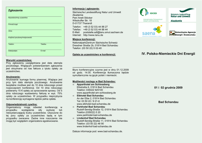 Zgłoszenie _________________________________________________________ Nazwisko/imię uczestnika _________________________________________________________ Firma/Urząd _________________________________________________________ Ulica _________________________________________________________ Kraj/kod pocztowy/miejscowość _________________________________________________________ Telefon Telefax _________________________________________________________ Data/podpis E-mail Informacja i zgłoszenie: Sächsische Landesstiftung Natur und Umwelt Akademie Pani Anett Stöcker Wilsdruffer Str. 18 D-01737 Tharandt Telefon: +49 (3 52 03) 44 88 27 Telefax: +49 (3 52 03) 44 88 44 E-Mail: [email protected] Internet: http://www.lanu.de Miejsce konferencji: NationalparkZentrum Sächsische Schweiz Dresdner Straße 2b, 01814 Bad Schandau Telefon: (03 50 22) 5 02-40 Opłata za uczestnictwo w konferencji: Warunki uczestnictwa: Przy zgłoszeniu uwzględniana jest data stempla pocztowego. WiąŜącym potwierdzeniem zgłoszenia jest otrzymana od nas faktura z tytułu opłaty za uczestnictwo. Anulowanie: Anulowanie wymaga formy pisemnej. WiąŜąca jest przy tym data stempla pocztowego. Anulowanie bezpłatne moŜliwe jest do 10 dnia roboczego przed rozpoczęciem konferencji. Od 10 dnia roboczego pobieramy 15 € opłaty za opracowanie sprawy. Od 5 dnia roboczego wystawiamy fakturę w wys. 75% opłaty za uczestnictwo. W przypadku nieprzybycia na konferencję wymagana będzie pełna opłata. Odpowiedzialność cywilna: Organizatorzy mogą odwołać konferencję w przypadku wystąpienia siły wyŜszej lub niewystarczającej liczby uczestników. Uiszczone do tej pory opłaty za uczestnictwo będą w tym przypadku zwracane. śadne inne roszczenia nie mogą być względem organizatora egzekwowane. IV. Polsko-Niemieckie Dni Energii Biuro konferencyjne czynne jest w dniu 01.12.2009 od godz. 14:30. Konferencja tłumaczona będzie symultanicznie na język polski i niemiecki. MoŜliwości noclegu w Bad Schandau: • Apparthotel am Schlossberg Elbstraße 6, 01814 Bad Schandau Telefon: 035022 925100 www.apparthotel-am-schlossberg.de • Elbhotel Bad Schandau An der Elbe 2, 01814 Bad Schandau Tel: 03 50 22 / 9 21-0 www.elbhotel-bad-schandau.de • Parkhotel Bad Schandau Rudolf-Sendig-Straße 12, 01814 Bad Schandau Telefon (035022) 5 20 www.parkhotel-bad-schandau.de • Lindenhof Bad Schandau Rudolf-Sendig-Straße 11, 01814 Bad Schandau Telefon: (03 50 22) 48 90 www.lindenhof-bad-schandau.de Dalsze informacje pod: www.bad-schandau.de. 01 i 02 grudnia 2009 Bad Schandau 1 dzień wtorek, 01.12.2009 Osadzone w dobrej tradycji Polsko-Niemieckie Dni Energii stały się dla gospodarki i administracji waŜnym forum wymiany doświadczeń i nawiązywania kontaktów, sięgającym daleko poza region Niemiec środkowych i Dolnego Śląska. W dniu otwarcia polscy i niemieccy referenci zaprezentują programy i regionalne strategie wdraŜania działań na rzecz ochrony klimatu poprzez wykorzystanie odnawialnych nośników energii i poprawę efektywności energetycznej. godz. 15.00 Bernd Kammerschen; LaNU Drezno godz. 15.05 Dr Hans-Peter Barkenthien; IDCED e. V. godz. 15.15 Agnieszka Cena-Soroko; Dolnośląska Agencja Energii i Środowiska, Wrocław godz. 15.20 Dr Hartmut Schwarze; Saksońskie Ministerstwo ds. Środowiska i Rolnictwa Bezpieczeństwo energetyczne i ochrona klimatu – Koncepcje na rzecz zabezpieczenia przyszłości godz. 15.30 godz. 16.00 Strategia rozwoju na rzecz wykorzystania lokalnych odnawialnych potencjałów energetycznych na Dolnym Śląsku Dr Mieczysław Ciurla; Urząd Marszałkowski Województwa Dolnośląskiego* Modelowy land energii odnawialnych: wykorzystanie lokalnych regeneratywnych nośników energii, jako wkład w bezpieczeństwo zaopatrzenia i ochronę klimatu w Saksonii-Anhalt Armin Forker; Ministerstwo Gospodarki i Pracy w Saksonii-Anhalt 2 dzień środa, 02.12.2009 Po przedstawieniu w pierwszym dniu warunków ramowych dla inicjatyw ochrony klimatu na szczeblu regionalnym, a takŜe strategii wdraŜania na rzecz wykorzystania odnawialnych nośników energii i poprawy efektywności energii, drugi dzień konferencji - dzielący się na trzy bloki tematyczne - poświęcony jest konkretnym przykładom i doświadczeniom zdobytym podczas realizacji projektów indywidualnych. godz. 09.00 godz. 09.10 godz. 09.30 godz. 09.50 Wprowadzenie do tematu Agnieszka Cena-Soroko; Dolnośląska Agencja Energii i Środowiska, Wrocław Audyt energetyczny w gminach – doświadczenia saksońskiej sieci współpracy na rzecz efektywności energetycznej Björn Wagner, Saksońska Agencja Energii Audyt energetyczny i rozporządzenie w sprawie działań termomodernizacyjnych gwarantujących poprawę stanu budynków w Polsce; Jerzy śurawski, Dolnośląska Agencja Energii i Środowiska, Wrocław Budownictwo efektywne energetycznie i ekologiczne od samego początku – Przykłady zrównowaŜonego planowania i realizacji przedsięwzięć budowlanych w Niemczech; Mgr-inŜ. Oliver Jirka, Jirka + Nadansky biuro architektów, Borgsdorf Budownictwo efektywne energetycznie i ekologiczne od samego początku – wymagania w stosunku do planowania w Polsce Agnieszka Cena-Soroko; Dolnośląska Agencja Energii i Środowiska, Wrocław godz. 10.30 Dyskusja Oczekiwania w stosunku do Rozporządzenia o ochronie energii 2009, jako wkład w osiągnięcie celów ochrony klimatu w Niemczech Werner Sommer; Saksońskie Ministerstwo ds. Środowiska i Rolnictwa, Drezno godz. 11.00 Przerwa na kawę godz. 11.30 Wprowadzenie do tematu Dr Karsten Fritzsche; IDCED e. V. godz. 17.30 Koniec pierwszego dnia konferencji godz. 11.40 godz. 18.00 Bankiet wieczorny Saksoński paszport energetyczny dla branŜy przemysłowej – nowy instrument na rzecz efektywności energetycznej w MŚP Martin Reiner; Saksońska Agencja Energii godz. 17.00 ZałoŜenia mające na celu poprawę efektywności energetycznej, jako klucz do osiągnięcia celów ochrony klimatu z perspektywy polskiej Ag