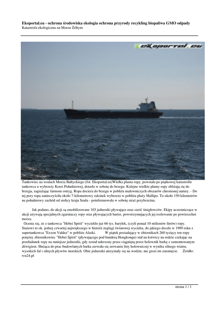 Ekoportal.eu - ochrona środowiska ekologia ochrona przyrody recykling biopaliwa GMO odpady Katastrofa ekologiczna na Morzu Żółtym Tankowiec na wodach Morza Bałtyckiego (fot. Ekoportal.eu)Wielka plama ropy, powstała po piątkowej katastrofie tankowca u wybrzeży Korei Południowej, dotarła w sobotę do brzegu. Kolejne wielkie plamy ropy zbliżają się do brzegu, zagrażając farmom ostryg. Ropa dociera do brzegu w pobliżu malowniczych obszarów chronionej natury. - Do tej pory ropa zanieczyściła około 7-kilometrowy odcinek wybrzeża w pobliżu plaży Mallipo. To około 150 kilometrów na południowy zachód od stolicy kraju Seulu - poinformowała w sobotę straż przybrzeżna. Jak podano, do akcji są zmobilizowane 103 jednostki pływające oraz sześć śmigłowców. Ekipy uczestniczące w akcji używają specjalnych zgarniaczy ropy oraz pływających barier, powstrzymujących jej rozlewanie po powierzchni morza. Ocenia się, że z tankowca "Hebei Spirit" wyciekło już 66 tys. baryłek, (czyli ponad 10 milionów litrów) ropy. Stanowi to ok. jednej czwartej największego w historii żeglugi światowej wycieku, do jakiego doszło w 1989 roku z supertankowca "Exxon Valdez" w pobliżu Alaski. W piątek posiadający w zbiornikach 260 tysięcy ton ropy potężny zbiornikowiec "Hebei Spirit" (pływającego pod banderą Hongkongu) stał na kotwicy na redzie czekając na przeładunek ropy na mniejsze jednostki, gdy został uderzony przez ciągniętą przez holownik barkę z zamontowanym dźwigiem. Służąca do prac budowlanych barka zerwała się zerwaniu liny holowniczej w wyniku silnego wiatru, wysokich fal i silnych pływów morskich. Obie jednostki utrzymały się na wodzie, nie grozi im zatonięcie. Źródło: tvn24.pl strona 1 / 1