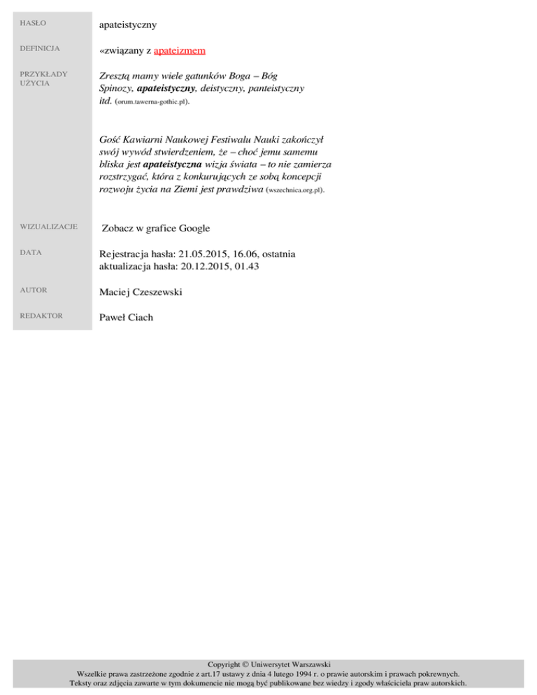 HASŁO apateistyczny DEFINICJA «związany z apateizmem» PRZYKŁADY UŻYCIA Zresztą mamy wiele gatunków Boga – Bóg Spinozy, apateistyczny, deistyczny, panteistyczny itd. (orum.tawerna-gothic.pl). Gość Kawiarni Naukowej Festiwalu Nauki zakończył swój wywód stwierdzeniem, że – choć jemu samemu bliska jest apateistyczna wizja świata – to nie zamierza rozstrzygać, która z konkurujących ze sobą koncepcji rozwoju życia na Ziemi jest prawdziwa (wszechnica.org.pl). WIZUALIZACJE Zobacz w grafice Google DATA Rejestracja hasła: 21.05.2015, 16.06, ostatnia aktualizacja hasła: 20.12.2015, 01.43 AUTOR Maciej Czeszewski REDAKTOR Paweł Ciach Copyright © Uniwersytet Warszawski Wszelkie prawa zastrzeżone zgodnie z art.17 ustawy z dnia 4 lutego 1994 r. o prawie autorskim i prawach pokrewnych. Teksty oraz zdjęcia zawarte w tym dokumencie nie mogą być publikowane bez wiedzy i zgody właściciela praw autorskich. Powered by TCPDF (www.tcpdf.org)