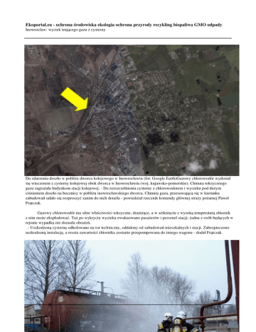 Ekoportal.eu - ochrona środowiska ekologia ochrona przyrody recykling biopaliwa GMO odpady Inowrocław: wyciek trującego gazu z cysterny Do zdarzenia doszło w pobliżu dworca kolejowego w Inowrocławiu (fot. Google Earth)Gazowy chlorowodór wydostał się wieczorem z cysterny kolejowej obok dworca w Inowrocławiu (woj. kujawsko-pomorskie). Chmura toksycznego gazu zagrażała budynkom stacji kolejowej. - Do rozszczelnienia cysterny z chlorowodorem i wycieku pod dużym ciśnieniem doszło na bocznicy w pobliżu inowrocławskiego dworca. Chmurę gazu, przesuwającą się w kierunku zabudowań udało się rozproszyć zanim do nich dotarła - powiedział rzecznik komendy głównej straży pożarnej Paweł Frątczak. Gazowy chlorowodór ma silne właściwości toksyczne, drażniące, a w zetknięciu z wysoką temperaturą zbiornik z nim może eksplodować. Tuż po wykryciu wycieku ewakuowano pasażerów i personel stacji; żadna z osób będących w rejonie wypadku nie doznała obrażeń. - Uszkodzoną cysternę odholowano na tor techniczny, oddalony od zabudowań mieszkalnych i stacji. Zabezpieczono uszkodzoną instalację, a reszta zawartości zbiornika zostanie przepompowana do innego wagonu - dodał Frątczak. strona 1 / 2 Ekoportal.eu - ochrona środowiska ekologia ochrona przyrody recykling biopaliwa GMO odpady Inowrocław: wyciek trującego gazu z cysterny Rzecznik prasowy PKP Krzysztof Łańcucki poinformował, że przerwa w ruchu kolejowym spowodowana wypadkiem trwała niecałe pół godziny; od godz. 21.22 ruch odbywa się normalnie. Na miejscu wypadku działa dziesięć jednostek straży pożarnej, w tym trzy zespoły z Bydgoszczy, wyspecjalizowane w ratownictwie chemicznym. Źródło: PAP strona 2 / 2