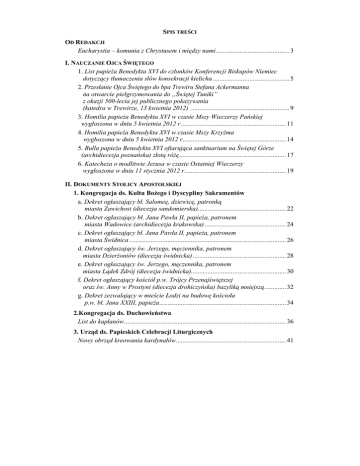 SPIS TREŚCI OD REDAKCJI Eucharystia – komunia z Chrystusem i między nami ............................................3 I. NAUCZANIE OJCA ŚWIĘTEGO 1. List papieża Benedykta XVI do członków Konferencji Biskupów Niemiec dotyczący tłumaczenia słów konsekracji kielicha ..............................................5 2. Przesłanie Ojca Świętego do bpa Trewiru Stefana Ackermanna na otwarcie pielgrzymowania do „Świętej Tuniki” z okazji 500-lecia jej publicznego pokazywania (katedra w Trewirze, 13 kwietnia 2012) ...........................................................9 3. Homilia papieża Benedykta XVI w czasie Mszy Wieczerzy Pańskiej wygłoszona w dniu 5 kwietnia 2012 r ...............................................................11 4. Homilia papieża Benedykta XVI w czasie Mszy Krzyżma wygłoszona w dniu 5 kwietnia 2012 r..............................................................14 5. Bulla papieża Benedykta XVI ofiarująca sanktuarium na Świętej Górze (archidiecezja poznańska) złotą różę................................................................17 6. Katecheza o modlitwie Jezusa w czasie Ostatniej Wieczerzy wygłoszona w dniu 11 stycznia 2012 r.............................................................19 II. DOKUMENTY STOLICY APOSTOLSKIEJ 1. Kongregacja ds. Kultu Bożego i Dyscypliny Sakramentów a. Dekret ogłaszający bł. Salomeę, dziewicę, patronką miasta Zawichost (diecezja sandomierska).....................................................22 b. Dekret ogłaszający bł. Jana Pawła II, papieża, patronem miasta Wadowice (archidiecezja krakowska) .................................................24 c. Dekret ogłaszający bł. Jana Pawła II, papieża, patronem miasta Świdnica ..............................................................................................26 d. Dekret ogłaszający św. Jerzego, męczennika, patronem miasta Dzierżoniów (diecezja świdnicka) ........................................................28 e. Dekret ogłaszający św. Jerzego, męczennika, patronem miasta Lądek Zdrój (diecezja świdnicka).........................................................30 f. Dekret ogłaszający kościół p.w. Trójcy Przenajświętszej oraz św. Anny w Prostyni (diecezja drohiczyńska) bazyliką mniejszą.............32 g. Dekret zezwalający w mieście Łodzi na budowę kościoła p.w. bł. Jana XXIII, papieża............................................................................34 2.Kongregacja ds. Duchowieństwa List do kapłanów.................................................................................................36 3. Urząd ds. Papieskich Celebracji Liturgicznych Nowy obrzęd kreowania kardynałów..................................................................41 III. NAUCZANIE BISKUPÓW O LITURGII Bp Andrzej F. Dziuba List Biskupa Łowickiego na Niedzielę Chrystusa Dobrego Pasterza „Jezus Chrystus Dobry Pasterz gromadzi nas w swojej Owczarni” ...............47 Konferencja Episkopatu Polski Spotkanie z Jezusem Chrystusem. List biskupów polskich do kapłanów na Wielki Czwartek 2012 r ....................50 Bp Tadeusz Rakoczy Słowo Pasterskie z okazji dwudziestolecia istnienia Diecezji Bielsko-Żywieckiej..............................................................................54 Jorge kard. Medina Estévez Dlaczego muszę iść w niedziele na Mszę?........................................................57 Abp Edward Ozorowski Wczoraj i dziś Eucharystii................................................................................65 André Kardynał Vingt-Trois Homilia wygłoszona w czasie Mszy świętej z udzielaniem święceń prezbiteratu (Paryż, Katedra Notre-Dame, 25.06.2011) .................................68 IV. FORMACJA LITURGICZNA Ks. Kazimierz Matwiejuk Nowa ewangelizacja potrzebuje świadków wiary ............................................73 V. DUSZPASTERSTWO LITURGICZNE Bp Stefan Cichy Uwagi dotyczące redakcji kalendarza liturgicznego na rok 2013 ...................79 Odpowiedzi na szereg pytań skierowanych do Komisji 1. Przyjmowanie Komunii świętej pod obiema postaciami...............................80 2. Czy można wystawić Najświętszy Sakrament dla jednej osoby? ..................81 3. Sprawa łączenia czasie Mszy palców przez kapłanów i całowania ręki.......82 4. Czy istnieją jakieś prawne uregulowania dotyczące możliwości sprawowania liturgii przy głównym ołtarzu? ...............................................83 5. Pytanie o to, jaki dokument Episkopatu Polski reguluje pełnienie funkcji ministranta przez dziewczynki .......................................................................84 6. Czy w piątek oktawy Wielkanocy nakazana jest wstrzemięźliwość od pokarmów mięsnych?................................................................................85 7. Litania przed Sanctissimum, a Okres Wielkanocny ......................................86 8. Pytania o okadzenia......................................................................................88 9. Formularz Mszy św. wieczornej w przeddzień uroczystości .........................89 Łukasz Wolański Recenzja „Kompendium dla ceremoniarza” (cz. 1 i 2)....................................91 VI. INFORMACJE 1. Konferencja naukowa o liturgii na Wydziale Teologicznym Uniwersytetu Śląskiego w Katowicach ...........................................................98 2. Katechezy bp. Z. Kiernikowskiego dostępne na CD .......................................98 3. List Papieża do biskupów niemieckich w sprawie tłumaczenia słów konsekracji kielicha ................................................................................98 4. Niemcy: nabożeństwa na facebooku? .............................................................99 5. Konferencja naukowa „Tajemnica Boga i człowieka w roku liturgicznym” (cz. III) na UKSW w Warszawie .....................................