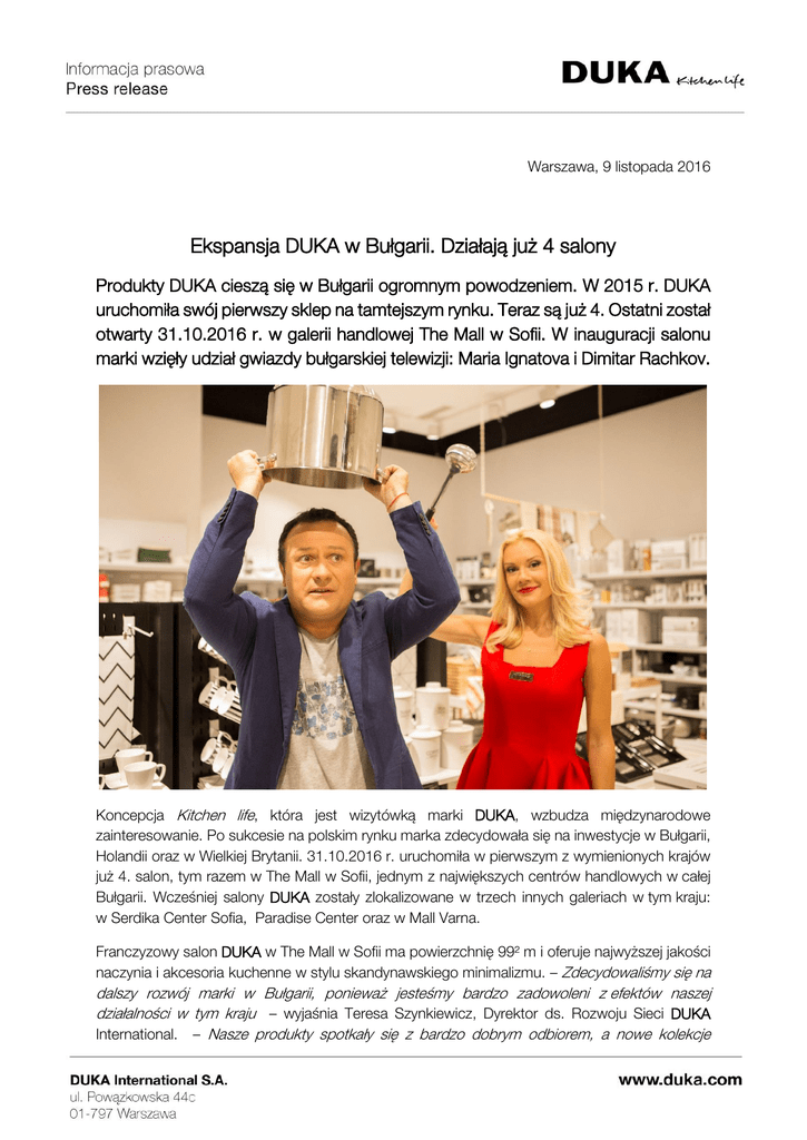 Warszawa, 9 listopada 2016 Ekspansja DUKA w Bułgarii. Działają już 4 salony Produkty DUKA cieszą się w Bułgarii ogromnym powodzeniem. W 2015 r. DUKA uruchomiła swój pierwszy sklep na tamtejszym rynku. Teraz są już 4. Ostatni został otwarty 31.10.2016 r. w galerii handlowej The Mall w Sofii. W inauguracji salonu marki wzięły udział gwiazdy bułgarskiej telewizji: Maria Ignatova i Dimitar Rachkov. Koncepcja Kitchen life, która jest wizytówką marki DUKA, wzbudza międzynarodowe zainteresowanie. Po sukcesie na polskim rynku marka zdecydowała się na inwestycje w Bułgarii, Holandii oraz w Wielkiej Brytanii. 31.10.2016 r. uruchomiła w pierwszym z wymienionych krajów już 4. salon, tym razem w The Mall w Sofii, jednym z największych centrów handlowych w całej Bułgarii. Wcześniej salony DUKA zostały zlokalizowane w trzech innych galeriach w tym kraju: w Serdika Center Sofia, Paradise Center oraz w Mall Varna. Franczyzowy salon DUKA w The Mall w Sofii ma powierzchnię 99² m i oferuje najwyższej jakości naczynia i akcesoria kuchenne w stylu skandynawskiego minimalizmu. – Zdecydowaliśmy się na dalszy rozwój marki w Bułgarii, ponieważ jesteśmy bardzo zadowoleni z efektów naszej działalności w tym kraju – wyjaśnia Teresa Szynkiewicz, Dyrektor ds. Rozwoju Sieci DUKA International. – Nasze produkty spotkały się z bardzo dobrym odbiorem, a nowe kolekcje wzbudzają ogromne zainteresowanie, dlatego z wielką chęcią otworzyliśmy kolejny salon w Bułgarii we współpracy z partnerem franczyzowym. Dowodem na to, że marka odniosła sukces jest stworzony dla bułgarskiej telewizji spot reklamowy prezentujący produkty DUKA oraz samą markę, w którym wzięli udział Maria Ignatova i Dimitar Rachkov. Ten duet to gospodarze niezwykle popularnego komediowego show Lords of the air, który jest emitowany w telewizji już od 13 lat i wciąż cieszy się ogromną popularnością. Cenione i lubiane gwiazdy uświetniły swoją obecnością inaugurację salonu. DUKA dynamicznie rozwija działalność i planuje inwestycje w kraju i zagranicą. Już wkrótce będą miały miejsce kolejne otwarcia sklepów marki. Dodatkowych informacji z przyjemnością udzielą Państwu: Paulina Tomczyk Public Bridge Sp. z o.o. [email protected] +48 71 377 52 81 w. 22 +48 783 783 278 Magdalena Tokarska DUKA International S.A. [email protected] +48 22 276 02 55 Historia marki DUKA sięga 1920 roku, kiedy to Hjalmar Blomkvist otworzył swój pierwszy sklep ze szkłem, porcelaną i naczyniami kuchennymi w szwedzkim mieście Linköping. W 1962 połączył firmę z 16 innymi sklepami sprzedającymi szkło oraz porcelanę, tworząc wspólnie sieć DUKA. Niektóre z zaprojektowanych wówczas, klasycznych produktów są dostępne w sprzedaży do dziś. DUKA stała się siecią kojarzoną w całej Szwecji z dobrą obsługą oraz jakością - silna skandynawska marka zaczęła nabierać wyraźnych kształtów. DUKA w Polsce to obecnie sieć ponad 50 sklepów zlokalizowanych w największych centrach handlowych oraz sklep internetowy: www.duka.com. Kitchen life to miejsce wspaniałych doświadczeń, którymi z radością dzielimy się z innymi ludźmi. Umacniamy więzi tworząc wspólne chwile dawania i dzielenia się, autentycznego wyrażania siebie poprzez to, kim jesteśmy, czyli to, co w nas najlepsze. Dlatego w DUKA dokładamy wszelkich starań, aby nasze wysokiej jakości produkty były inspiracją dla coraz to nowych pomysłów na spędzanie czasu ze sobą. Słuchamy ludzi i ich potrzeb, aby nasze propozycje naturalnie odpowiadały ich oczekiwaniom w zakresie bezpieczeństwa, jakości i wyjątkowego wzornictwa. Wszystko to pod hasłem Kitchen life, które jest wizytówką i jednocześnie zobowiązaniem marki DUKA.