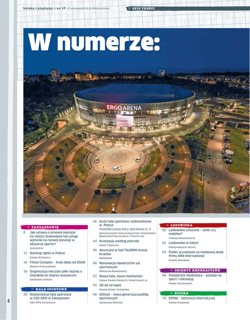 boiska i stadiony ∷ nr 17// półrocznik dla profesjonalistów ∷ SPIS TREŚCI FOTO: Archiwum Ergo Arena W numerze: ∷ ZARZĄDZANIE 8 Jak ustawa o umowie koncesji na roboty budowlane lub usługi wpłynie na rozwój koncesji w obszarze sportu? Jakub Kot Departament Infrastruktury Sportowej Ministerstwa Sportu i Turystyki 44 Aranżacja według potrzeb Anna Tomczyk 12 Naming rights w Polsce 46 Akustyka w hali TAURON Arena Kraków ROCKFON Kamil Kukułka 16 Fitnet Complex – krok dalej niż ESOK Marcin Piaskowski 48 Renowacja nawierzchni sal sportowych 18 Organizacja meczów piłki nożnej o charakterze imprez masowych Wiesław Borkowicz Firma Tamex Obiekty Sportowe S.A. Grzegorz Górski ∷ HALE SPORTOWE 6 28 Duże hale sportowo-widowiskowe w Polsce Inwentaryzacja bazy sportowej cz. II 52 Nowa hala, nowe możliwości 54 Od lat na topie Firma Sport Transfer ∷ LODOWISKA 60 Lodowisko sztuczne – stałe czy mobilne? Tomasz Bukowiecki 62 Lodowisko w Gdyni Urząd Miasta Gdyni 64 Polski wynalazek na światową skalę firmy WM International Paweł Doliński ∷ OBIEKTY REKREACYJNE 66 Pumptrack modułowy – postaw na sport i rekreację Firma Techramps ∷ BOISKA 26 Nowoczesna hala sportowa w COS-OPO w Zakopanem 58 Stilmat – nowa generacja podłóg sportowych 70 EPDM – zdrowsza alternatywa Grzegorz Winter Firma Stargum COS-OPO Zakopane FOTO: Archiwum firmy Techramps 72 Recykling opon a sport Orzeł S.A. 74 Dbaj o sztuczną murawę Kacper Prościak 76 Jak zapobiegać, jak naprawiać? Wymiana nawierzchni ze sztucznej trawy Paweł Niemiec 80 Nowe boiska ACT Global w 2016 r. Firma ACT Global 82 Długowieczne obiekty sportowe Firma Sandmaster 86 Zima – czas podsumowań i... zakupów 102Powrót do korzeni Mateusz Zdrojewski 106Rider Husqvarna w służbie obiektom sportowym 88 R ewitalizacja stadionu lekkoatletycznego w Pile Miejski Ośrodek Sportu i Rekreacji w Pile 92 Mehgies – materiał na zadaszenia obiektów sportowych Firma LOW & BONAR Poland ∷ STADION Y PIŁKARSKIE 94 Koszenie – najważniejszy z zabiegów Kamil Prokopiuk ∷ STADION Y LA 84 Nowy Gdański Stadion Lekkoatletyczny i Rugby Miejski Ośrodek Sportu i Rekreacji w Gdańsku 99 Wszystko zaczyna się od dobrej murawy Firma Perfetto Firma Husqvarna 108Życica RPR Piotr Krzywicki ∷ W YDARZENIA 112Relacja z V Ogólnopolskiego Forum Dyrektorów OSiR Instytut Rozwoju Infrastruktury Sportowej 116I Krajowy Kongres Infrastruktury Sportowej IAKS IAKS Polska 100Systemy nawadniające Rain Bird 119Zaproszenie na Targi Sport Invest 2017 Jacek Molenda 120Zaproszenie na Targi Świat Piłki 2017 Jecek Kulpeksza 7