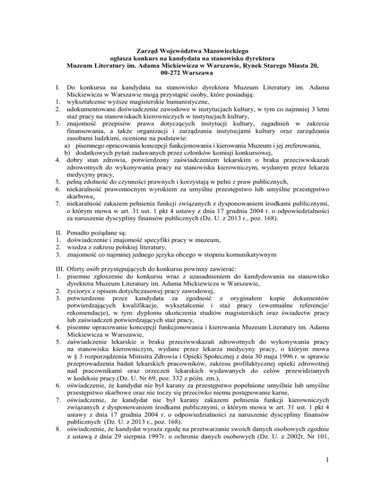Zarząd Województwa Mazowieckiego ogłasza konkurs na kandydata na stanowisko dyrektora Muzeum Literatury im. Adama Mickiewicza w Warszawie, Rynek Starego Miasta 20, 00-272 Warszawa I. 1. 2. 3. 4. 5. 6. 7. II. 1. 2. 3. Do konkursu na kandydata na stanowisko dyrektora Muzeum Literatury im. Adama Mickiewicza w Warszawie mogą przystąpić osoby, które posiadają: wykształcenie wyższe magisterskie humanistyczne, udokumentowane doświadczenie zawodowe w instytucjach kultury, w tym co najmniej 3 letni staż pracy na stanowiskach kierowniczych w instytucjach kultury, znajomość przepisów prawa dotyczących instytucji kultury, zagadnień w zakresie finansowania, a także organizacji i zarządzania instytucjami kultury oraz zarządzania zasobami ludzkimi, ocenione na podstawie: a) pisemnego opracowania koncepcji funkcjonowania i kierowania Muzeum i jej zreferowania, b) dodatkowych pytań zadawanych przez członków komisji konkursowej, dobry stan zdrowia, potwierdzony zaświadczeniem lekarskim o braku przeciwwskazań zdrowotnych do wykonywania pracy na stanowisku kierowniczym, wydanym przez lekarza medycyny pracy, pełną zdolność do czynności prawnych i korzystają w pełni z praw publicznych, niekaralność prawomocnym wyrokiem za umyślne przestępstwo lub umyślne przestępstwo skarbowe, niekaralność zakazem pełnienia funkcji związanych z dysponowaniem środkami publicznymi, o którym mowa w art. 31 ust. 1 pkt 4 ustawy z dnia 17 grudnia 2004 r. o odpowiedzialności za naruszenie dyscypliny finansów publicznych (Dz. U. z 2013 r., poz. 168). Ponadto pożądane są: doświadczenie i znajomość specyfiki pracy w muzeum, wiedza z zakresu polskiej literatury, znajomość co najmniej jednego języka obcego w stopniu komunikatywnym III. Oferty osób przystępujących do konkursu powinny zawierać: 1. pisemne zgłoszenie do konkursu wraz z uzasadnieniem do kandydowania na stanowisko dyrektora Muzeum Literatury im. Adama Mickiewicza w Warszawie, 2. życiorys z opisem dotychczasowej pracy zawodowej, 3. potwierdzone przez kandydata za zgodność z oryginałem kopie dokumentów potwierdzających kwalifikacje, wykształcenie i staż pracy (ewentualne referencje/ rekomendacje), w tym: dyplomu ukończenia studiów magisterskich oraz świadectw pracy lub zaświadczeń potwierdzających staż pracy, 4. pisemne opracowanie koncepcji funkcjonowania i kierowania Muzeum Literatury im. Adama Mickiewicza w Warszawie, 5. zaświadczenie lekarskie o braku przeciwwskazań zdrowotnych do wykonywania pracy na stanowisku kierowniczym, wydane przez lekarza medycyny pracy, o którym mowa w § 3 rozporządzenia Ministra Zdrowia i Opieki Społecznej z dnia 30 maja 1996 r. w sprawie przeprowadzenia badań lekarskich pracowników, zakresu profilaktycznej opieki zdrowotnej nad pracownikami oraz orzeczeń lekarskich wydawanych do celów przewidzianych w kodeksie pracy.(Dz. U. Nr 69, poz. 332 z późn. zm.), 6. oświadczenie, że kandydat nie był karany za przestępstwo popełnione umyślnie lub umyślne przestępstwo skarbowe oraz nie toczy się przeciwko niemu postępowanie karne, 7. oświadczenie, że kandydat nie był karany zakazem pełnienia funkcji kierowniczych związanych z dysponowaniem środkami publicznymi, o którym mowa w art. 31 ust. 1 pkt 4 ustawy z dnia 17 grudnia 2004 r. o odpowiedzialności za naruszenie dyscypliny finansów publicznych (Dz. U. z 2013 r., poz. 168). 8. oświadczenie, że kandydat wyraża zgodę na przetwarzanie swoich danych osobowych zgodnie z ustawą z dnia 29 sierpnia 1997r. o ochronie danych osobowych (Dz. U. z 2002r. Nr 101, 1 poz. 926, z późn. zm.) w celach przeprowadzenia konkursu na stanowisko dyrektora tej instytucji. IV. Na żądanie komisji konkursowej kandydat zobowiązany jest okazać do wglądu oryginały dokumentów, których kopie zostały złożone w ofercie konkursowej. Przez złożenie dokumentów kandydat wyraża zgodę na poddanie się procedurze konkursowej. V. Kandydat ma możliwość zapoznania się z warunkami organizacyjno – finansowymi działalności instytucji, w oparciu o dokumenty dostępne w wersji elektronicznej lub w wersji papierowej. Osoby zainteresowane otrzymaniem ww. dokumentów w wersji elektronicznej, proszone są o zwrócenie się z prośbą o powyższe, na następujące adresy e-mail: [email protected], [email protected]. Ponadto, dokumenty dostępne są w Urzędzie Marszałkowskim Województwa Mazowieckiego w Warszawie, Departament Organizacji, Wydział Kadr i Szkoleń, ul. Jagiellońska 26, 03-719 Warszawa, pokój 434, tel. /22/ 59 07 741 lub 59 07 656, w dniach od poniedziałku do piątku w godz. 10:00 – 14:00. VI. Oferty należy składać w zamkniętych kopertach z podanym imieniem i nazwiskiem kandydata, adresem zwrotnym, numerem telefonu, adresem mailowym i dopiskiem „Konkurs na kandydata na stanowisko dyrektora Muzeum Literatury im. Adama Mickiewicza w Warszawie”, w terminie do dnia 15 sierpnia 2014 r. (do godz. 1600), na adres: Urząd Marszałkowski Województwa Mazowieckiego w Warszawie, Kancelaria Ogólna, ul. Jagiellońska 26, 03-719 Warszawa. Dzień 15 sierpnia 2014 r. jest ostatecznym terminem składania ofert. Termin uważa się za zachowany, jeżeli oferta wpłynie do Urzędu najpóźniej w dniu 15 sierpnia 2014 r. do godziny 1600. VII. O terminie i miejscu przeprowadzenia postępowania konkursowego kandydaci zostaną powiadomieni indywidualnie. VIII. Rozpatrzenie ofert nastąpi w ciągu 10 tygodni po upływie terminu wyznaczonego dla ich składania. 2