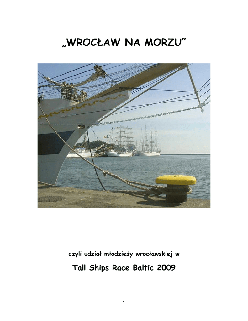 „WROCŁAW NA MORZU” czyli udział młodzieży wrocławskiej w Tall Ships Race Baltic 2009 1 “THE TALL SHIPS RACE” – popularnie zwany Operacją Żagiel to kolejne z cyklicznych spotkań flotylli starych żaglowców szkolnych i jachtów oraz pływających na nich młodych ludzi w wieku od 16 do 25 lat, którzy w ramach wspólnego żeglowania i imprez towarzyszących mają okazję do zacieśniania więzi łączących „ludzi morza” (http://www.sailtraininginternational.org/page.asp?partid=6). W tym roku „Operacja Żagiel 2009” odbywa się na Morzu Bałtyckim. Regaty żaglowców i jachtów odbywają się w 2 etapach na trasie: Gdynia - Sankt Petersburg i Turku - Kłajpeda. Natomiast na trasie Sankt Petersburg - Turku następuje częściowa wymiana załóg i uczestnicy rejsu mają wyjątkową okazję spędzić kilka dni na wybranych żaglowcach i jachtach poznając łodzie i załogi z różnych krajów (http://www.sailtraininginternational.org/page.asp?partid=462 ). To również okazja do pokazania polskich jachtów ich sprawności i gościnności polskich załóg. Postoje w portach i liczne wspólne imprezy są okazją do międzynarodowych spotkań, wymiany doświadczeń, nawiązywania przyjaźni. To również możliwość promocji Wrocławia i jego hasła „Wrocław miasto spotkań” wpisującego się w ideę przewodnią „Operacji Żagiel” Celem imprezy jest propagowanie wychowania morskiego w środowisku młodzieżowym Wrocławia, pokazanie młodym ludziom możliwych, innych form spędzania wolnego czasu poprzez pracę przy sprzęcie w klubach i ośrodkach żeglarskich oraz harcerskich drużynach wodnych, którzy stanowić będą trzon załogi rejsu. Organizatorem imprezy jest Wrocławskie Stowarzyszenie Żeglarskie „PORT STANICA”, którego członkami są doświadczeni instruktorzy żeglarstwa, kapitanowie 2 jachtowi z długoletnim stażem żeglarskim mający niezbędne doświadczenie w realizacji tego typu imprez (www.portstanica.org). Uczestnikami imprezy będzie młodzież wrocławska w wieku 16 do 25 lat z różnych środowisk żeglarskich ale też osoby młode nie związane z żeglarstwem, które będą miały okazję wziąć osobiście udział w wielkim „święcie żagli”. W całej imprezie weźmie udział ok. 50 osobowa „załoga wrocławska” wchodząc w skład załogi dwóch statkach szkolnych s/y „Pogoria” i s/y „Gedania”. Jako Stowarzyszenie organizujące całą imprez chcemy aby w rejsie mogła uczestniczyć jak najszersza grupa młodzieży, nawet osoby z niezbyt zamożnych rodzin, dlatego też staramy się o dofinansowanie imprezy w ramach Miejskich Projektów Pomocowych i przez indywidualnych sponsorów, których zamieszany pozyskać poprzez nagłośnienie naszych działań w dostępnych mediach. Osobą odpowiedzialną za organizację rejsu z ramienia Zarządu Stowarzyszenia jest 3