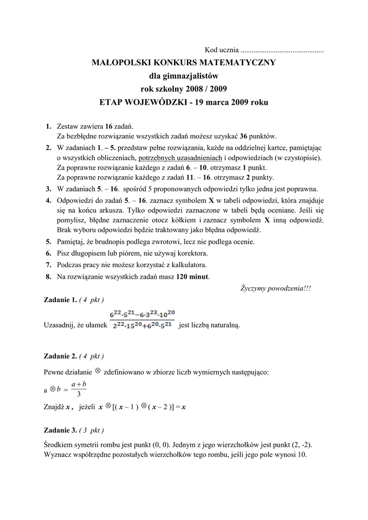 Kod ucznia ............................................. MAŁOPOLSKI KONKURS MATEMATYCZNY dla gimnazjalistów rok szkolny 2008 / 2009 ETAP WOJEWÓDZKI - 19 marca 2009 roku 1. Zestaw zawiera 16 zadań. Za bezbłędne rozwiązanie wszystkich zadań możesz uzyskać 36 punktów. 2. W zadaniach 1. – 5. przedstaw pełne rozwiązania, każde na oddzielnej kartce, pamiętając o wszystkich obliczeniach, potrzebnych uzasadnieniach i odpowiedziach (w czystopisie). Za poprawne rozwiązanie każdego z zadań 6. – 10. otrzymasz 1 punkt. Za poprawne rozwiązanie każdego z zadań 11. – 16. otrzymasz 2 punkty. 3. W zadaniach 5. – 16. spośród 5 proponowanych odpowiedzi tylko jedna jest poprawna. 4. Odpowiedzi do zadań 5. – 16. zaznacz symbolem X w tabeli odpowiedzi, która znajduje się na końcu arkusza. Tylko odpowiedzi zaznaczone w tabeli będą oceniane. Jeśli się pomylisz, błędne zaznaczenie otocz kółkiem i zaznacz symbolem X inną odpowiedź. Brak wyboru odpowiedzi będzie traktowany jako błędna odpowiedź. 5. Pamiętaj, że brudnopis podlega zwrotowi, lecz nie podlega ocenie. 6. Pisz długopisem lub piórem, nie używaj korektora. 7. Podczas pracy nie możesz korzystać z kalkulatora. 8. Na rozwiązanie wszystkich zadań masz 120 minut. Życzymy powodzenia!!! Zadanie 1. ( 4 pkt ) Uzasadnij, że ułamek jest liczbą naturalną. Zadanie 2. ( 4 pkt ) Pewne działanie zdefiniowano w zbiorze liczb wymiernych następująco: a b = ab 3 Znajdź x , jeżeli x [( x – 1 ) ( x – 2 )] = x Zadanie 3. ( 3 pkt ) Środkiem symetrii rombu jest punkt (0, 0). Jednym z jego wierzchołków jest punkt (2, -2). Wyznacz współrzędne pozostałych wierzchołków tego rombu, jeśli jego pole wynosi 10. Zadanie 4. ( 4 pkt ) Na kwadracie ABCD o boku długości 1 opisano okrąg, a następnie wykreślono okrąg o środku w punkcie A i promieniu AB. Oblicz pole zacieniowanej figury widocznej na rysunku. Zadanie 5. ( 4 pkt ) Trójkąt równoboczny i sześciokąt foremny wpisano w okrąg, na którym opisano trójkąt równoboczny. Przyjmując, że P1 oznacza pole dużego trójkąta, P2 pole małego trójkąta, a S pole sześciokąta foremnego, uzasadnij, że S2 = P1 . P2 Zadanie 6. ( 1 pkt ) Kwadrat połowy trzykrotności liczby jest równy trzykrotności połowy kwadratu tej liczby. Własność ta jest spełniona dla A. dowolnej liczby. B. liczby 0. C. liczby 1. D. liczby 0 i 1. E. liczb ujemnych. Zadanie 7. ( 1 pkt ) Liczby a i b spełniają warunek a2 = – b2 . Wynika z tego, że A. jedna z liczb jest dodatnia, a druga ujemna. B. suma tych liczb jest dodatnia. C. suma tych liczb jest ujemna. D. obie liczby a i b są równe zero. E. żadna z odpowiedzi A, B, C, D nie jest poprawna. Zadanie 8. ( 1 pkt ) Trzy piąte fotografii było pokryte czarnym kolorem, a reszta białym kolorem. Fotografia została powiększona trzykrotnie Jaki procent powierzchni powiększonej fotografii zajmuje biały kolor? A. 20% B. 40% C. 50% D. 60% E. Żadna z odpowiedzi A, B, C, D nie jest poprawna. Zadanie 9. ( 1 pkt ) Z pierwszego sprawdzianu z matematyki Staś dostał jedynkę, z pozostałych piątki. Z ilu sprawdzianów dostał piątkę, jeżeli średnia arytmetyczna jego ocen ze sprawdzianów była równa 4,5? A. 3 B. 4 C. 5 D. 6 E. 7 Zadanie 10. ( 1 pkt ) W trójkącie ABC przedstawionym na rysunku długości boków AB i AC są równe. Kąt BPC miarę 115o, a kąt ABP miarę 53o. Jaka jest miara kąta PBC? A. 17o B. 16o C. 7o D. 6o E. Żadna z odpowiedzi A, B, C, D nie jest poprawna. Zadanie 11. ( 2 pkt ) Suma pewnych pięciu kolejnych liczb nieparzystych jest o 2 większa od sumy następnych trzech kolejnych liczb nieparzystych. Największa z tych ośmiu liczb nieparzystych jest równa A. 27 B. 23 C. 17 D. 13 E. 9 Zadanie 12. ( 2 pkt) Jakie jest pole powierzchni całkowitej sześcianu wpisanego w kulę o promieniu 1 cm? A. 8 cm2 B. 8 2 cm2 C. 12 cm2 D. 8 3 cm2 Zadanie 13. ( 2 pkt ) Na rysunku przedstawiono siatkę pewnego graniastosłupa. Długości wszystkich boków podane są w centymetrach. Ile dm3 ma objętość tego graniastosłupa? A. 0,2 B. 200 C. 0,6 D. 600 E. Żadna z odpowiedzi A, B, C, D nie jest poprawna. E. Żadna z odpowiedzi A, B, C, D nie jest poprawna. Zadanie 14. ( 2 pkt ) Pociąg ekspresowy jedzie ze średnią prędkością o wartości 90 km/h. Pociąg ten mija pociąg pospieszny, który jedzie ze średnią prędkością o wartości 60 km/h. Pasażer pociągu ekspresowego obserwował przez okno wagonu pociąg pospieszny. Obserwacja tego zdarzenia trwała 6 s. Ile metrów długości ma pociąg pospieszny? A. 900 B. 450 C. 250 D. 125 E. 50 Zadanie 15. (2 pkt ) Cena biletu na niedzielny mecz wynosiła 30 zł. Gdy na mecz w środę cenę biletu obniżono, okazało się, że na ten mecz przyszło o 50% widzów więcej niż w niedzielę, a wpływy uzyskane ze sprzedaży biletów na ten mecz wzrosły o 25% w stosunku do wpływów uzyskanych za mecz rozegrany w niedzielę. O ile złotych obniżono cenę biletu? B. O 20 zł. A. O 25 zł. C. O 15 zł. D. O 10 zł. E. Żadna z odpowiedzi A, B, C, D nie jest poprawna. Zadanie 16. (2 pkt ) Tomek ustawił na stole prostopadłościan z 462 jednakowych klocków sześciennych. Jego siostra Jola zdemontowała najwyższą warstwę składającą się z 77 klocków. Następnie jego starszy brat Wojtek zdemontował warstwę z boku zawierającą 55 klocków. Na koniec jego młodszy brat Jacek zdemontował warstwę sąsiadującą z warstwą, którą wybrał Wojtek. Ile klocków pozostało w tak pomniejszonym prostopadłościanie? A. 263 B. 256 C. 295 D. 300 E. 350 TABELA ODPOWIEDZI: Zad. 6. Zad. 7. Zad. 8. Zad. 9. Zad.10. Zad.11. Zad.12. Zad.13. Zad.14. Zad.15. Zad.16. 1 pkt 1 pkt 1 pkt 1 pkt 1 pkt 2 pkt 2 pkt 2 pkt 2 pkt 2 pkt 2 pkt A A A A A A A A A A A B B B B B B B B B B B C C C C C C C C C C C D D D D D D D D D D D E E E E E E E E E E E