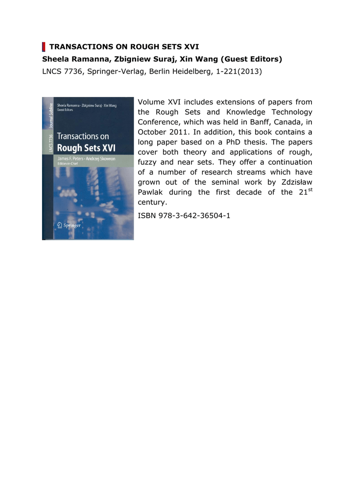 TRANSACTIONS ON ROUGH SETS XVI Sheela Ramanna, Zbigniew Suraj, Xin Wang (Guest Editors) LNCS 7736, Springer-Verlag, Berlin Heidelberg, 1-221(2013) Volume XVI includes extensions of papers from the Rough Sets and Knowledge Technology Conference, which was held in Banff, Canada, in October 2011. In addition, this book contains a long paper based on a PhD thesis. The papers cover both theory and applications of rough, fuzzy and near sets. They offer a continuation of a number of research streams which have grown out of the seminal work by Zdzisław Pawlak during the first decade of the 21st century. ISBN 978-3-642-36504-1