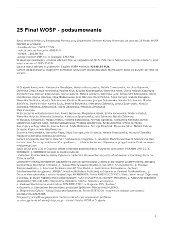25 Finał WOŚP - podsumowanie Sztab Wielkiej Orkiestry Świątecznej Pomocy przy Grajewskim Centrum Kultury informuje, że podczas 25 Finału WOŚP zebrano w Grajewie: - kwesta uliczna: 15659,67 PLN - aukcja podczas koncertu: 4595 PLN - sklepik: 1181,89 PLN -aukcja i koncert PSM I st. w Grajewie: 1252 PLN W Wąsoszu kwestujący uzbierali 2028,20 PLN, w Rajgrodzie 6570,27 PLN, zaś w Szczuczynie podczas koncertu oraz kwesty zebrano 11815,55 PLN. Łączna kwota zebrana w grajewskim Sztabie WOŚP wyniosła: 43145,58 PLN. Gorące podziękowania pragniemy przekazać wszystkim Wolontariuszom zbierającym datki do puszek od rana na ulicach. W Grajewie kwestowali: Aleksandra Aleksiejew, Martyna Brzostowska, Natalia Chrostowska, Karolina Gajownik, Dominika Gleba, Kinga Karwowska, Paulina Kiluk, Kluudia Kochanowska, Weronika Kołek, Oliwia Kościuk, Katarzyna Krzyżanowska, Damian Leszczyński, Iwona Lewszyk, Natalia Lewszyk, Weronika Lupa, Aleksandra Łepkowska, Maciej Łomotowski, Bogna Mańczuk, Olga Modzelewska, Julia Obrycka, Karol Partyka, Anna Parzych, Izabela Pieniążek, Weronika Siedlecka, Monika Skibniewska, Karolina Skowrońska, Justyna Sokołowska, Natalia Sokołowska, Monika Stefańska, Dawid Strojny, Kamila Szulc, Ewelina Świderska, Aleksandra Zabłocka, Łukasz Zaborowski, Klaudia Zalewska, Weronika Ziemkiewicz, Milena Żbikowska, Weronika Żmijewska, Maja Żurawska. W Szczuczynie wolontariuszami byli: Elwira Borawska, Magdalena Józwik, Emilia Karwowska, Wiktoria Korbut, Weronika Motycka, Weronika Sulewska, Katarzyna Sypytkowska, Julia Zalewska, Natalia Zalewska. W Wąsoszu kwestowali: Magda Andruk, Martyna Borusiewicz, Patrycja Gardocka, Aleksandra Koniecko, Dawid Ogonowski, Gabriela Rong, Tomasz Szmyglewski, Wiktoria Wróblewska, Kinga Zielińska, Emilia Tarnacka. Kwestujący w Rajgrodzie to: Joanna Andruk, Edyta Bielawska, Patrycja Dziądziak, Dominika Jakuć, Natalia Kalicka, Grzegorz Kapla, Amelia Niedźwiedzka, Zuzanna Niedźwiedzka, Weronika Plaga, Edyta Skorupa, Julia Stryjecka, Helena Truszkowska, Krzysztof Zemelka, Magdalena Zemelka, Elżbieta Zyskowska. Gorąco dziękujemy również p. Helenie Truszkowskiej z Rajgrodu, p. Januszowi Macinkiewiczowi ze Szczuczyna oraz burmistrzowi Szczuczyna Arturowi Kuczyńskiemu, p. Jolancie Koniecko z Wąsosza za przygotowanie Finału w swoich miejscowościach. Sztab WOŚP przy GCK w Grajewie składa serdeczne podziękowania wszystkim sponsorom: PIEKARNI ZPH S.C. C. SKRODZKI I J. SKRODZKI Konopki za słodkie bułeczki i Zakładowi Ciastkarskiemu Haliny Cybula za ciasteczka dla wolontariuszy oraz ufundowanie wspaniałego tortu na 25-lecie WOŚP. Dziękujemy również fundatorom gadżetów na aukcję: burmistrzowi Grajewa p. Dariuszowi Latarowskiemu, zastępcy burmistrza p. Maciejowi Bednarko, p. Posłowi Mieczysławowi Baszko, p. Januszowi Szumowskiemu, p. Pawłowi Sierzputowskiemu, p. Adamowi Zackiewiczowi AZ Foto Studio, p. Kazimierzowi Podlaskiemu, Centrum Szkoleniowo-Rekreacyjnemu „KNIEJA”, Miejskiej Bibliotece Publicznej w Grajewie, p. Pawłowi Paszkowskiemu, p. Dorocie Marczykowskiej z salonu fryzjerskiego AWANGARDA, firmie ABIES KUCZYŃSCY, Warsztatowi terapii Zajęciowej z Grajewa, p. Eulalii Haponik właścicielce księgarni ALFA w Grajewie, p. Adamowi Mojsakowi, p. Katarzynie Jeglińskiej właścicielce PIECUCH CAFE, Miejskiemu Ośrodkowi Sportu i Rekreacji w Grajewie, p. Markowi Śliwińskiemu właścicielowi SPÓŁDZIELCZEJ 1 w Grajewie, PSS „Społem” w Grajewie, p. Edmundowi Borawskiemu prezesowi Spółdzielni Mleczarskiej MLEKPOL, p. Zbigniewowi Cybula – Usługi Ślusarsko-Spawalnicze, firmie ESTETICON i oczywiście klubowi sportowemu JAGIELLONIA BIAŁYSTOK. Dziękujemy wszystkim grajewskim mediom oraz naszym wspaniałym portalom za udostępnianie informacji dotyczących działań Sztabu WOŚP w Grajewie. 1 Gorące podziękowania wszystkim mieszkańcom Grajewa, Szczuczyna, Wąsosza i Rajgrodu, którzy wsparli tegoroczną akcję Wielkiej Orkiestry Świątecznej Pomocy. Ogromne podziękowania kierujemy również do zespołów, które wystąpiły podczas koncertu: Fikusie i Banana Mafia – instruktor: Marcin Wasilewski, Piruet i SLASH – instruktorzy: Karolina Poniatowicz i Dariusz Jabłoński, Karolina Pliszka i Julia Świderska – instruktor: Aleksandra Szejda, Karolina Czajka – instruktor: Monika Soroko oraz gościnnie grupa Respect z Wąsosza. Podziękowania składamy wszystkim pracownikom Grajewskiego Centrum Kultury za wspaniałą pracę, pełne zaangażowanie przed Finałem, w trakcie, a także po Finale Orkiestry podczas zliczania zebranych pieniędzy. Wielkie SIE MA! dla wszystkich i do zobaczenia za rok. Sztab przy GCK w Grajewie. 2