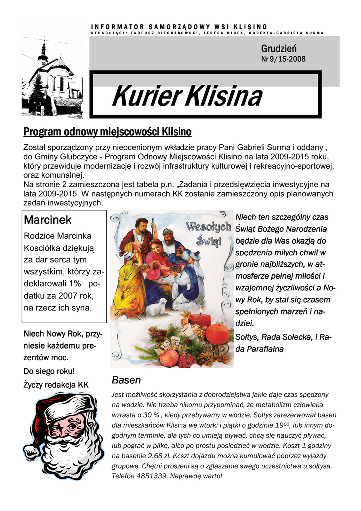 INFORMATOR SAMORZĄDOWY WSI KLISINO R E D A G U J Ą C Y : T A D E U S Z C I E C H A N O W S K I , T E R E S A M I C E K , K O R E K T A - G A B R I E L A S U R M A Grudzień Nr 9/15-2008 Kurier Klisina Program odnowy miejscowości Klisino Został sporządzony przy nieocenionym wkładzie pracy Pani Gabrieli Surma i oddany , do Gminy Głubczyce - Program Odnowy Miejscowości Klisino na lata 2009-2015 roku, który przewiduje modernizację i rozwój infrastruktury kulturowej i rekreacyjno-sportowej, oraz komunalnej. Na stronie 2 zamieszczona jest tabela p.n. „Zadania i przedsięwzięcia inwestycyjne na lata 2009-2015. W następnych numerach KK zostanie zamieszczony opis planowanych zadań inwestycyjnych. Rodzice Marcinka Kosciółka dziękują za dar serca tym wszystkim, którzy zadeklarowali 1% podatku za 2007 rok, na rzecz ich syna. Niech ten szczególny czas Świąt Bożego Narodzenia będzie dla Was okazją do spędzenia miłych chwil w gronie najbliższych, w atmosferze pełnej miłości i wzajemnej życzliwości a Nowy Rok, by stał się czasem spełnionych marzeń i nadziei. Niech Nowy Rok, przyniesie każdemu prezentów moc. Sołtys, Rada Sołecka, i Rada Parafialna Marcinek Do siego roku! Życzy redakcja KK Basen Jest możliwość skorzystania z dobrodziejstwa jakie daje czas spędzony na wodzie. Nie trzeba nikomu przypominać, że metabolizm człowieka wzrasta o 30 % , kiedy przebywamy w wodzie. Sołtys zarezerwował basen dla mieszkańców Klisina we wtorki i piątki o godzinie 1900, lub innym dogodnym terminie, dla tych co umieją pływać, chcą się nauczyć pływać, lub pograć w piłkę, albo po prostu posiedzieć w wodzie. Koszt 1 godziny na basenie 2.68 zł. Koszt dojazdu można kumulować poprzez wyjazdy grupowe. Chętni proszeni są o zgłaszanie swego uczestnictwa u sołtysa. Telefon 4851339. Naprawdę warto! Str. 2 Kurier Klisina Zadania i przedsięwzięcia inwestycyjne na lata 2009-2015 Termin realizacji zadania Zadanie inwestycyjne Rezultat Szacowany koszt w złotych Zadanie nr 1.UłoŜenie nawierzchni asfaltowej na drodze do Klisinka 400 mb Zadanie nr 2.Zabiegi pielęgnacyjne Pomnika Przyrody-„Aleja Lipowa” Zadanie nr 3. Oświetlenie wieŜy kościoła Bezpieczeństwo w ruchu drogowym i kultura jazdy 100 000,- Ochrona Środowiska i teren rekreacyjny 66 000,- Poprawa wizerunku miejscowości 18 000,- Zadanie nr 4. Budowa Parkingu i chodnika na odcinku drogi jednokierunkowej przy kościele 150 mb. Zadanie nr 5. Utwardzenie terenu przed kościołem Bezpieczeństwo w ruch drogowym i pieszym 2011 Zadanie nr 6. Budowa krytej pływalni Poprawa warunków Ŝycia mieszkańców 2012 Zadanie nr 7. Budowa kanalizacji sanitarnej Ekologia i ochrona środowiska 2013 Jak wyŜej 2014 Zadanie nr 9. Gazyfikacja gospodarstw domowych Ochrona środowiska i poprawa warunków Ŝycia w Klisinie mieszkańców 2009 2010 2015 Bezpieczeństwo pieszych, estetyka 35 000,25 000,w/g kosztorysu „ Jak wyŜej „ „ ” „ „ Kartka z historii– historii– Klisino w roku 1920 Humor Na Biegunie Północnym spotykają się dwaj Święci Mikołajowie -Dlaczego jesteś taki smutny?- pyta pierwszy z nich. -Bo w tym roku znowu wypadło na mnie i mam roznosić prezenty w Polsce… -Przecież Polacy to wspaniali ludzi! -Tak, są wspaniali. Ale jak wrócę, to przez następny rok będę leczył kaca…. Nowa zagadka. zagadka Co przedstawia zdjęcie zamieszczone poniżej. Zdjęcie u góry było zagadką do dziś. Teraz już wiemy, że zdjęcie przedstawia bar na Małym Klisinie, który znajdował się przy drodze do młynówki za budynkiem gospodarczym Pana Stanisława Święsa. W czasach kiedy były widoczne jeszcze mury, w zawalonych piwnicach można było znaleźć srebrne sztuce i inne przedmioty kuchenne. W rozwiązaniu zagadki uczestniczyli: Stanisław Święs, Zbigniew Pożniak, Regina Rusin, Bronisława Frańciszkiewicz, Teresa Micek. Dziękujemy!