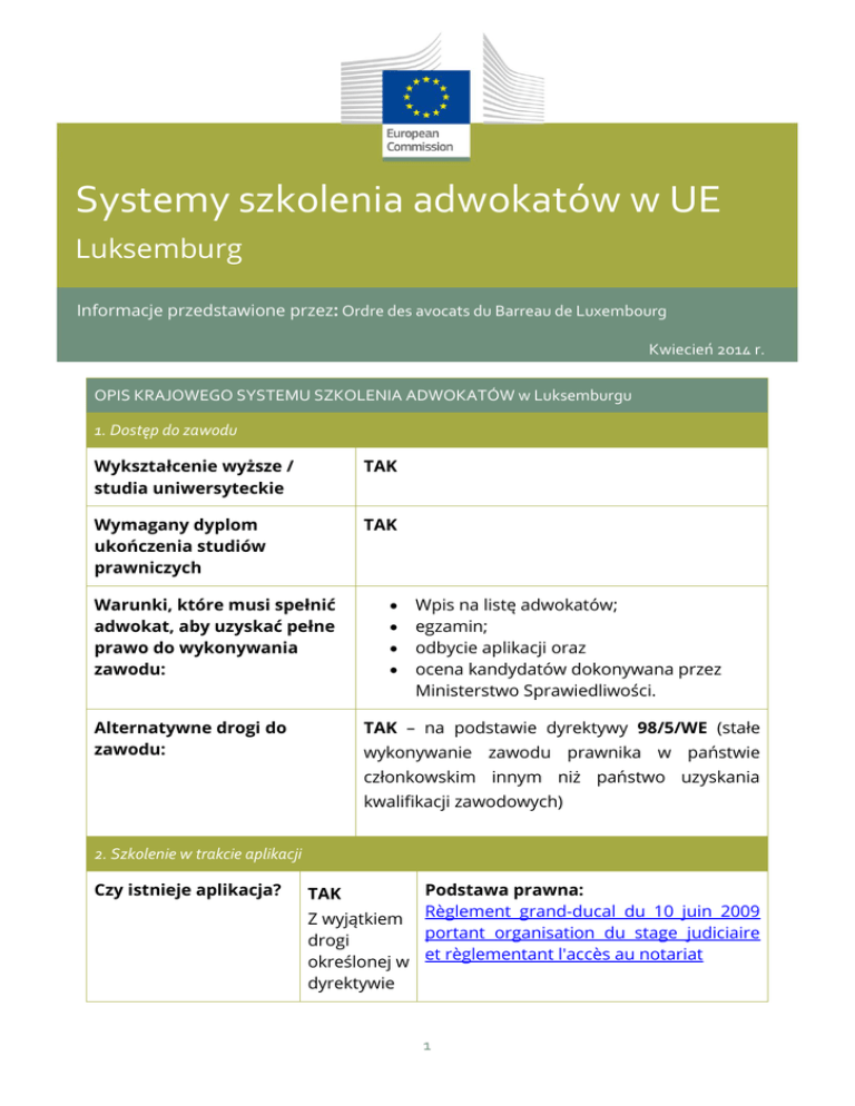 Systemy szkolenia adwokatów w UE Luksemburg Informacje przedstawione przez: Ordre des avocats du Barreau de Luxembourg Kwiecień 2014 r. OPIS KRAJOWEGO SYSTEMU SZKOLENIA ADWOKATÓW w Luksemburgu 1. Dostęp do zawodu Wykształcenie wyższe / studia uniwersyteckie TAK Wymagany dyplom ukończenia studiów prawniczych TAK Warunki, które musi spełnić adwokat, aby uzyskać pełne prawo do wykonywania zawodu: Alternatywne drogi do zawodu: Wpis na listę adwokatów; egzamin; odbycie aplikacji oraz ocena kandydatów dokonywana przez Ministerstwo Sprawiedliwości. TAK – na podstawie dyrektywy 98/5/WE (stałe wykonywanie zawodu prawnika w państwie członkowskim innym niż państwo uzyskania kwalifikacji zawodowych) 2. Szkolenie w trakcie aplikacji Czy istnieje aplikacja? Podstawa prawna: Z wyjątkiem Règlement grand-ducal du 10 juin 2009 portant organisation du stage judiciaire drogi określonej w et règlementant l'accès au notariat dyrektywie TAK 1 Państwo: Luksemburg 98/5/WE Obowiązkowa TAK Ustalony czas trwania: 2 lata Rodzaje struktur odpowiedzialnych za organizowanie szkoleń w trakcie aplikacji Forma szkoleń w trakcie aplikacji Izba Adwokacka; adwokaci prowadzący prywatną praktykę i kancelarie prawne. Praktyki pod nadzorem Izby Adwokackiej i Ministerstwa Sprawiedliwości oraz szkolenie z zakresu prawa według określonego programu wspólnego dla wszystkich aplikantów adwokackich oraz szkolenie z zakresu prawa według indywidualnego programu nauczania oraz szkolenie w zakresie prawniczych kompetencji zawodowych. Egzamin wstępny / sprawdzenie wiedzy przed rozpoczęciem aplikacji TAK Weryfikacja dyplomu; ocena pisemnego wniosku; egzamin wstępny. Ustalony program nauczania w trakcie aplikacji TAK Główne zagadnienia objęte programem: instytucje i źródła prawa Luksemburga; postępowanie sądowe i organizacja wymiaru sprawiedliwości; prawo karne materialne i procesowe; prawo rodzinne; prawa pracy; prawo handlowe i upadłościowe; prawo sektora finansowego; zasady etyczne; rachunkowość przedsiębiorstw; sporządzanie aktów prawnych. Szczególne zasady dotyczące szkoleń w zakresie prawa UE i szkoleń językowych: NIE 2 Państwo: Luksemburg Podział aplikacji na różne etapy NIE Ocena/egzamin po odbyciu aplikacji TAK W formie egzaminów pisemnych 3. System doskonalenia zawodowego Rozróżnienie między doskonaleniem zawodowym a szkoleniem z zakresu specjalizacji W Luksemburgu prowadzone są wyłącznie szkolenia w ramach doskonalenia zawodowego. Obowiązek doskonalenia zawodowego TAK Obowiązek doskonalenia zawodowego ustanowiony w regulaminie wewnętrznym Izby Adwokackiej Podstawa prawna: tytuł 14 regulaminu wewnętrznego Luksemburskiej Izby Adwokackiej (z dnia 9 stycznia 2013 r.) oraz regulamin wewnętrzny z dnia 16 stycznia 2013 r. http://www.legilux.public.lu/leg/a/archives/2013/ 0039/a039.pdf#page=2 Obowiązek nauki języków obcych NIE Obowiązek włączenia treści związanych z prawem UE w zakres doskonalenia zawodowego NIE DOTYCZY 4. Systemy akredytacji i organizatorzy szkoleń Możliwość akredytacji TAK Artykuły dotyczące procesu akredytacji (art. 14.1–14.5 regulaminu wewnętrznego Luksemburskiej Izby Adwokackiej – zob. powyżej, sekcja „Obowiązek doskonalenia zawodowego”) Akredytacja: kursów szkoleniowych, krajowych organizatorów szkoleń, 3 Państwo: Luksemburg organizatorów szkoleń ze wszystkich państw członkowskich. Proces akredytacji – odbywa się poprzez złożenie wniosku w Luksemburskiej Izbie Adwokackiej. Liczba organizatorów szkoleń Wskazanie liczby jest niemożliwe. oferujących działania szkoleniowe w ramach doskonalenia zawodowego Rodzaj organizatorów szkoleń opracowujących akredytowane działania szkoleniowe w ramach doskonalenia zawodowego Izba Adwokacka; organizacja zarządzana lub utworzona przez Izbę Adwokacką (w tym ośrodki prawnicze lub lokalne zrzeszenia adwokatów); akredytowany prywatny komercyjny organizator szkoleń (w tym kancelarie prawne); akredytowany prywatny lub publiczny niekomercyjny organizator szkoleń (w tym uczelnie, fundacje); nieakredytowany prywatny komercyjny organizator szkoleń; nieakredytowany prywatny lub publiczny niekomercyjny organizator szkoleń. Działania i metody Rodzaj działań szkoleniowych akceptowanych w ramach obowiązku doskonalenia zawodowego lub szkolenia z zakresu specjalizacji Uczestnictwo w Uczestnictwo szkoleniach działaniach stacjonarnych; szkoleniowych uczestnictwo w innych członkowskich: szkoleniowych; jest uznawane przez w Izbę, jeżeli spełnia działaniach szkoleniowych charakterze wymóg dotyczący w formy (zob. powyżej w osoby sekcji „Możliwość prowadzącej szkolenie 4 w państwach konferencjach uczestnictwo w akredytacji”). lub Państwo: Luksemburg nauczyciela; przygotowywanie/pu blikacja opracowań. 5. Nadzór nad działaniami szkoleniowymi Organizacje zaangażowane w nadzorowanie działań z zakresu doskonalenia zawodowego NIE Proces nadzoru NIE DOTYCZY Źródło: Projekt pilotażowy – szkolenie europejskich kadr wymiaru sprawiedliwości: „Część 2 – Badanie dotyczące aktualnej sytuacji w zakresie szkolenia adwokatów w dziedzinie prawa UE” realizowany przez Radę Izb Adwokackich i Stowarzyszeń Prawniczych Unii Europejskiej (CCBE) i Europejski Instytut Administracji Publicznej (EIPA) 5