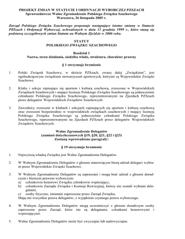 PROJEKT ZMIAN W STATUCIE I ORDYNACJI WYBORCZEJ PZSZACH Sprawozdawcze Walne Zgromadzenie Polskiego Związku Szachowego Warszawa, 26 listopada 2005 r. Zarząd Polskiego Związku Szachowego proponuje następujące istotne zmiany w Statucie PZSzach i Ordynacji Wyborczej, uchwalonych w dniu 11 grudnia 1999 r., które staną się podstawą szczegółowych zmian Statutu na Walnym Zjeździe w 2006 roku. STATUT POLSKIEGO ZWIĄZKU SZACHOWEGO Rozdział 1 Nazwa, teren działania, siedziba władz, struktura, charakter prawny § 1 otrzymuje brzmienie 1. Polski Związek Szachowy, w skrócie PZSzach, zwany dalej „Związkiem”, jest ogólnokrajowym związkiem stowarzyszeń sportowych, którymi są Wojewódzkie Związki Szachowe. 2. Kluby i sekcje zajmujące się sportem i kulturą szachową, zrzeszone w Wojewódzkich Związkach Szachowych i mające licencje Polskiego Związku Szachowego są jednocześnie członkami Polskiego Związku Szachowego, reprezentowanymi na Zjazdach PZSzach przez delegatów Wojewódzkich Związków Szachowych. 3. Zawodnicy zrzeszeni w klubach i sekcjach zajmujących się sportem i kulturą szachową oraz zrzeszeni bezpośrednio w wojewódzkich związkach szachowych i mający licencję Polskiego Związku Szachowego są jednocześnie członkami Polskiego Związku Szachowego, reprezentowanymi na Zjazdach PZSzach przez delegatów Wojewódzkich Związków Szachowych. Walne Zgromadzenie Delegatów (zamiast dotychczasowych §19, §20, §21, §22 i §23) Zostaną wprowadzone paragrafy: § 19 otrzymuje brzmienie 1. NajwyŜszą władzą Związku jest Walne Zgromadzenia Delegatów. 2. W Walnym Zgromadzeniu Delegatów z głosem stanowiącym biorą udział delegaci wybrani przez Wojewódzkie Związki Szachowe. 3. W Walnym Zgromadzeniu Delegatów są zapraszani i mogą brać udział z głosem doradczym i biernym prawem wyborczym: a) członkowie honorowi Związku członkowie wspierający, b) członkowie Zarządu Związku i Komisji Rewizyjnej, którzy nie zostali wybrani delegatami, c) osoby fizyczne, imiennie zaproszone przez Zarząd Związku. Mają oni wszystkie prawa delegatów, z wyjątkiem czynnego prawa wyborczego. 4. W Walnym Zgromadzeniu Delegatów mogą uczestniczyć z głosem doradczym osoby zaproszone przez Zarząd, które nie są delegatami, członkami honorowymi i wspierającymi. 5. Walne Zgromadzenie Delegatów moŜe być zwyczajne lub nadzwyczajne. 6. Zwyczajne Walne Zgromadzenie Delegatów jest zwoływane przez Zarząd Związku raz na cztery lata jako sprawozdawczo-wyborcze i co dwa lata jako sprawozdawcze. O terminie, miejscu i porządku obrad Walnego Zgromadzenia, Zarząd Związku zawiadamia delegatów przynajmniej 30 dni przed terminem Zjazdu. 7. Nadzwyczajne Walne Zgromadzenie Delegatów moŜe być zwołane: a) z własnej inicjatywy Zarządu, b) na wniosek Komisji Rewizyjnej, c) na wniosek przynajmniej dziewięciu Wojewódzkich Związków Szachowych. d) na podstawie uchwały Walnego Zgromadzenia 8. Nadzwyczajne Walne Zgromadzenie moŜe podejmować uchwały wyłącznie w sprawach objętych wnioskiem jego zwołanie i jest zwoływane przez Zarząd w terminie trzech miesięcy od daty zgłoszenia wniosku. 9. Uchwały Walnego Zgromadzenia zapadają zwykłą większością głosów. 10. Odwołanie Prezesa, członków Zarządu, Komisji Rewizyjnej wymaga większości 50% + 1 głos. 11. Zmiana statutu wymaga większości 2/3 głosów. 12. Walne Zgromadzenie jest waŜne w przypadku prawidłowości zwołania Walnego Zgromadzenia i uczestnictwa w nim przedstawicieli przynajmniej sześciu Wojewódzkich Związków Szachowych, bez względu na liczbę obecnych delegatów. § 20 otrzymuje brzmienie W sprawach, w których statut nie określa uprawnień i obowiązków Związku, podejmowanie uchwał naleŜy do Walnego Zgromadzenia Delegatów. Do obowiązków i kompetencji zwyczajnego Walnego Zgromadzenia Delegatów naleŜy: 1. 2. 3. 4. 5. 6. 7. 8. 9. 10. 11. uchwalanie generalnych kierunków działalności Związku; rozpatrywanie i przyjmowanie sprawozdań władz Związku; udzielanie absolutorium, na podstawie wniosku Komisji Rewizyjnej, ustępującemu Zarządowi; wybór w odrębnych głosowaniach Prezesa Związku, Zarządu i Komisji Rewizyjnej; nadawania godności członka honorowego; podejmowanie uchwały o rozwiązaniu się Związku i przeszacowaniu jego majątku; rozpatrywanie odwołań od uchwał Zarządu Związku, w sprawie wykluczenia lub zawieszenia w prawach członkowskich; uchwalanie statutu i jego zmian; rozpatrywanie wniosków zgłoszonych przez delegatów i ustępujące władze Związku; podejmowanie uchwał przez zwyczajne Walne Zgromadzenie Delegatów w innych sprawach uznanych za konieczne. uchwalanie ordynacji wyborczej i tzw. klucza wyborczego delegatów na Walne Zgromadzenie Delegatów. § 21 otrzymuje brzmienie Wojewódzkie Związki Szachowe 1. Zebrania Wojewódzkich Związków Szachowych są zwoływane raz na cztery lata w roku, w którym ma odbyć się Walne Zgromadzenie Delegatów sprawozdawczo-wyborcze w terminie, co najmniej 30 dni przed wyznaczoną datą Walnego Zgromadzenia Delegatów. 2. W zebraniu Wojewódzkiego Związku Szachowego mają prawo uczestniczyć z głosem stanowiącym przedstawiciele klubów i sekcji zajmujących się sportem i kulturą szachową, mających licencję Polskiego Związku Szachowego i zrzeszonych w Wojewódzkim Związku Szachowym oraz przedstawiciele zawodników, mających licencję PZSzach i indywidualnie zarejestrowanych w WZSzach – liczbę tych ostatnich przedstawicieli ustala WZSzach proporcjonalnie do liczby zarejestrowanych zawodników. 3. Wojewódzki Związek Szachowy wyłania delegatów na Walne Zgromadzenie Delegatów według następującego klucza: a) kaŜdemu Wojewódzkiemu Związkowi Szachowemu przysługuje prawo wyboru jednego delegata na Walny Zjazd PZSzach (1 mandat), b) kaŜdemu Wojewódzkiemu Związkowi Szachowemu przysługuje ponadto prawo wyboru delegatów dodatkowych: liczba dodatkowych delegatów zaleŜy od liczby kl