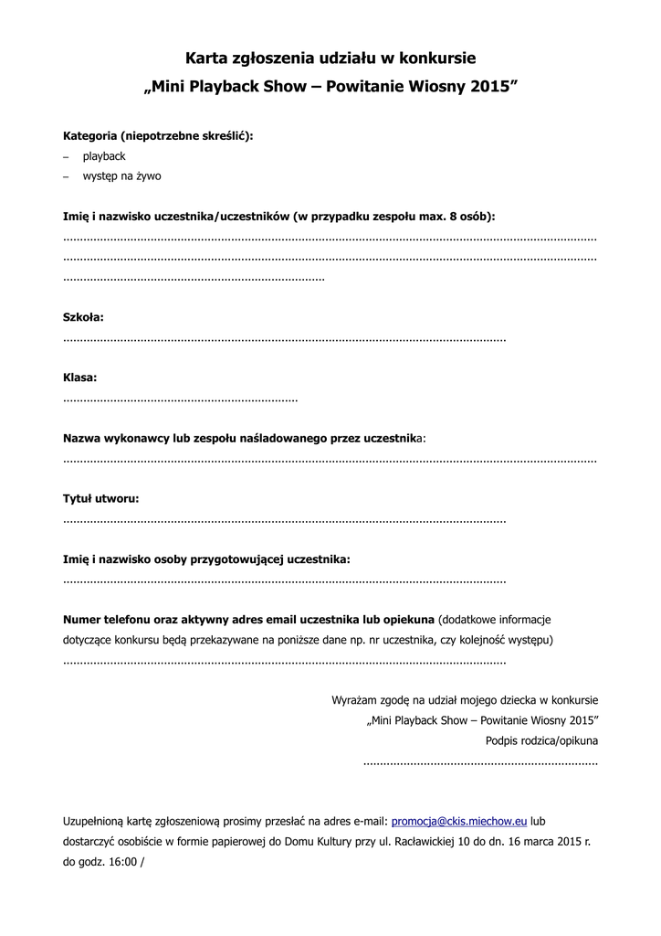 Karta zgłoszenia udziału w konkursie „Mini Playback Show – Powitanie Wiosny 2015” Kategoria (niepotrzebne skreślić): – playback – występ na żywo Imię i nazwisko uczestnika/uczestników (w przypadku zespołu max. 8 osób): ............................................................................................................................................................... ............................................................................................................................................................... .............................................................................. Szkoła: .................................................................................................................................... Klasa: ...................................................................... Nazwa wykonawcy lub zespołu naśladowanego przez uczestnika: ............................................................................................................................................................... Tytuł utworu: .................................................................................................................................... Imię i nazwisko osoby przygotowującej uczestnika: .................................................................................................................................... Numer telefonu oraz aktywny adres email uczestnika lub opiekuna (dodatkowe informacje dotyczące konkursu będą przekazywane na poniższe dane np. nr uczestnika, czy kolejność występu) .................................................................................................................................... Wyrażam zgodę na udział mojego dziecka w konkursie „Mini Playback Show – Powitanie Wiosny 2015” Podpis rodzica/opikuna ...................................................................... Uzupełnioną kartę zgłoszeniową prosimy przesłać na adres e-mail: [email protected] lub dostarczyć osobiście w formie papierowej do Domu Kultury przy ul. Racławickiej 10 do dn. 16 marca 2015 r. do godz. 16:00 /