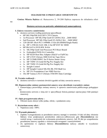 AOP.132.16.2014.RB Dębica, 07.10.2014r. OGŁOSZENIE O PRZETARGU OFERTOWYM Gmina Miasta Dębica ul. Ratuszowa 2, 39-200 Dębica zaprasza do składania ofert na: Dostawę serwera na potrzeby administracji samorządowej. I. Zakres rzeczowy zamówienia: 1. dostawa serwera według poniższej specyfikacji. • HP ML350pT08 SAS SFF CTO Chassis • 1st Processor HP ML350p Gen8 E5-2650v2 Kit , 2600 MHZ • 2nd Processor HP ML350p Gen8 E5-2650v2 Kit , 2600 MHZ • 128 GB HP 1Rx4 PC3-14900R-13 Kit (R-DIMM/Single Rank) • 6x HP 1.2TB 6G SAS 10K 2.5in DP ENT SC HDD • HP Hh SATA DVD RW Jb Kit • 1x ML350p Gen8 2nd Processor PCI Riser Board • 1x Embedded P420i SA Controller • 1x HP H220 Host Bus Adapter (H)(LP or F)(PCIe) • 1x HP LTO5 Ultrium 3000 SAS Int Tape Drive • 1x HP 512MB FBWC for P-Series Smart Array • 1x HP 750W CS Gold Ht Plg Pwr Supply Kit • 1x HP 750W CS Gold Ht Plg Pwr Supply Kit • 1x Insight Control • 1x HP Insight Control ML/DL/BL FIO Bndl Lic • 1x HP 3Yr Foundation Care NBD Service • 10x HP Taśma LTO-5 Ultrium 3TB RW Data Cartridge II. Termin realizacji : 1. dostawa serwera w terminie dwóch tygodni od daty zawarcia umowy. III. Dopuszczalne zmiany postanowień umowy oraz określenie warunków zmian: 1. Zamawiający przewiduje zmiany umowy w sprawie zamówienia publicznego polegające na: - dostarczeniu serwera z inną niż w specyfikacji ilością pamięci operacyjnej i/lub pamięci masowej. IV. Opis przygotowania oferty : 1. Oferent może złożyć tylko jedną ofertę z podaniem ceny. V. Kryterium oceny ofert : 1. Najniższa cena- 100% VI. Warunki płatności : 1. Zapłata wynagrodzenia za przedmiot umowy nastąpi w terminie 14 dni od daty złożenia faktury wraz podpisanym protokołem zdawczo-odbiorczym gdy Zleceniodawca nie wniósł uwag i zastrzeżeń do wykonania przedmiotu umowy, lub 30 dni po uzupełnieniu przedmiotu umowy zgodnie z wniesionymi uwagami i zastrzeżeniami. 2. Za opóźnienie w zapłacie faktury Zleceniobiorca naliczy odsetki w wysokości ustawowej. VII. Składanie ofert : 1. Oferty należy składać w terminie do 17 października 2014 r. godz. 900 w siedzibie Zamawiającego pok. 104 - Sekretariat Zastępców Burmistrza 2. Otwarcie ofert nastąpi w siedzibie Zamawiającego w: Urzędzie Miejskim w Dębicy, 39- 200 Dębica, ul. Ratuszowa 2, pokój nr 102, w nieprzekraczalnym terminie: do dnia 17 października 2014r. do godz. 09:15. 3. Ofertę należy złożyć w nieprzezroczystej kopercie, zabezpieczonej przed otwarciem kopercie (paczce). Kopertę (paczkę) należy opisać następująco: Gmina Miasta Dębica: 39-200 Dębica, ul. Ratuszowa 2, pokój nr 104 Oferta w postępowaniu na: „DOSTAWA SERWERA NA POTRZEBY ADMINISTRACJI SAMORZĄDOWEJ” 4. Na kopercie (paczce) oprócz opisu jw. należy umieścić nazwę i adres Wykonawcy. Uprawniony do kontaktu z oferentami: Robert Baniak, tel.: (014) 68-38-280 Zamawiający udzieli zamówienia oferentowi, który spełniając opisane wyżej wymagania zaoferuje najniższą cenę na wykonanie zadania. Naczelnik Wydziału Administracji, Organizacji i Personelu inż. Stanisław Malinowski