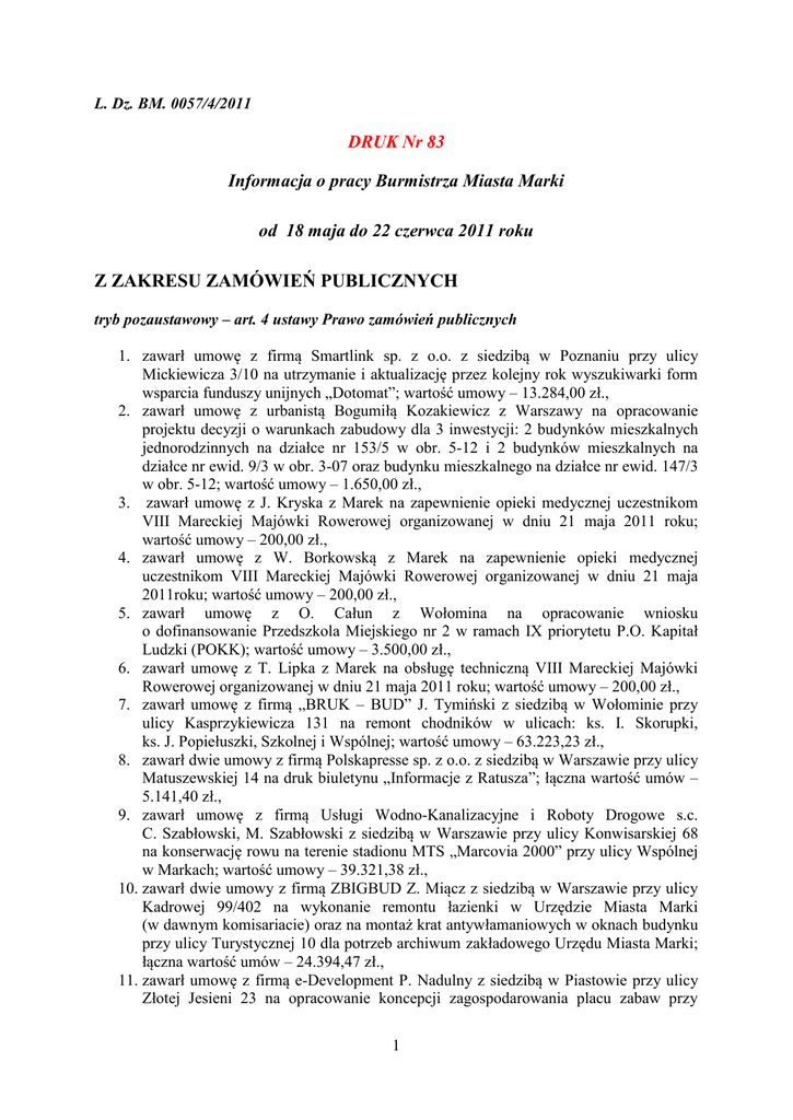 L. Dz. BM. 0057/4/2011 DRUK Nr 83 Informacja o pracy Burmistrza Miasta Marki od 18 maja do 22 czerwca 2011 roku Z ZAKRESU ZAMÓWIEŃ PUBLICZNYCH tryb pozaustawowy – art. 4 ustawy Prawo zamówień publicznych 1. zawarł umowę z firmą Smartlink sp. z o.o. z siedzibą w Poznaniu przy ulicy Mickiewicza 3/10 na utrzymanie i aktualizację przez kolejny rok wyszukiwarki form wsparcia funduszy unijnych „Dotomat”; wartość umowy – 13.284,00 zł., 2. zawarł umowę z urbanistą Bogumiłą Kozakiewicz z Warszawy na opracowanie projektu decyzji o warunkach zabudowy dla 3 inwestycji: 2 budynków mieszkalnych jednorodzinnych na działce nr 153/5 w obr. 5-12 i 2 budynków mieszkalnych na działce nr ewid. 9/3 w obr. 3-07 oraz budynku mieszkalnego na działce nr ewid. 147/3 w obr. 5-12; wartość umowy – 1.650,00 zł., 3. zawarł umowę z J. Kryska z Marek na zapewnienie opieki medycznej uczestnikom VIII Mareckiej Majówki Rowerowej organizowanej w dniu 21 maja 2011 roku; wartość umowy – 200,00 zł., 4. zawarł umowę z W. Borkowską z Marek na zapewnienie opieki medycznej uczestnikom VIII Mareckiej Majówki Rowerowej organizowanej w dniu 21 maja 2011roku; wartość umowy – 200,00 zł., 5. zawarł umowę z O. Całun z Wołomina na opracowanie wniosku o dofinansowanie Przedszkola Miejskiego nr 2 w ramach IX priorytetu P.O. Kapitał Ludzki (POKK); wartość umowy – 3.500,00 zł., 6. zawarł umowę z T. Lipka z Marek na obsługę techniczną VIII Mareckiej Majówki Rowerowej organizowanej w dniu 21 maja 2011 roku; wartość umowy – 200,00 zł., 7. zawarł umowę z firmą „BRUK – BUD” J. Tymiński z siedzibą w Wołominie przy ulicy Kasprzykiewicza 131 na remont chodników w ulicach: ks. I. Skorupki, ks. J. Popiełuszki, Szkolnej i Wspólnej; wartość umowy – 63.223,23 zł., 8. zawarł dwie umowy z firmą Polskapresse sp. z o.o. z siedzibą w Warszawie przy ulicy Matuszewskiej 14 na druk biuletynu „Informacje z Ratusza”; łączna wartość umów – 5.141,40 zł., 9. zawarł umowę z firmą Usługi Wodno-Kanalizacyjne i Roboty Drogowe s.c. C. Szabłowski, M. Szabłowski z siedzibą w Warszawie przy ulicy Konwisarskiej 68 na konserwację rowu na terenie stadionu MTS „Marcovia 2000” przy ulicy Wspólnej w Markach; wartość umowy – 39.321,38 zł., 10. zawarł dwie umowy z firmą ZBIGBUD Z. Miącz z siedzibą w Warszawie przy ulicy Kadrowej 99/402 na wykonanie remontu łazienki w Urzędzie Miasta Marki (w dawnym komisariacie) oraz na montaż krat antywłamaniowych w oknach budynku przy ulicy Turystycznej 10 dla potrzeb archiwum zakładowego Urzędu Miasta Marki; łączna wartość umów – 24.394,47 zł., 11. zawarł umowę z firmą e-Development P. Nadulny z siedzibą w Piastowie przy ulicy Złotej Jesieni 23 na opracowanie koncepcji zagospodarowania placu zabaw przy 1 Szkole Podstawowej nr 1 w ramach programu „Radosna Szkoła”; wartość umowy – 4.200,00 zł., 12. zawarł umowę z firmą PPUH „Faucon” K. Marszał z siedzibą w Wołominie przy ulicy Głowackiego 76 na pełnienie nadzoru inwestorskiego przy budowie oświetlenia na ulicy Długiej; wartość umowy – 2.829,00 zł., 13. zawarł umowę z T. Falkowskim z Warszawy i z H. Złotoszewską - Niedziałek z Warszawy na sporządzenie opinii w zakresie ustalenia wpływu podwyższenia poziomu terenu działek nr ewid. 16, 17, 20/2 i 21/2 w obrębie 3-02 w Markach przy ulicy Okólnej na zmianę stanu wody na gruntach tych działek; wartość umowy – 2.200,00 zł., 14. zawarł 12 umów w zakresie: opieki nad dziećmi, opieki medycznej, sędziowania, obsługi trasy podczas biegów przełajowych o Puchar Burmistrza Miasta Marki w dniu 11 czerwca 2011 roku na terenie MTS „Marcovia 2000”; łączna wartość umów – 1.730,00 zł., 15. zawarł umowę z firmą „DRIADA wycinanie i pielęgnacja drzew” P. Czerwiakowski z siedzibą w Klaudynie przy ulicy Lutosławskiego 99c na wykonanie prac pielęgnacyjnych drzewa (topoli) na terenie działki nr ewid. 2/2 w obr. 5-03 przy al. J. Piłsudskiego 96; wartość umowy – 3.726,00 zł., 16. zawarł umowę z M. Ochmanem z Marek na malowanie barier na trzech mostach w Markach; wartość umowy – 2.000,00 zł., 17. zawarł umowę z Przedsiębiorstwem Usługowo – Handlowym GEOSYSTEM Sp. z o.o. z siedzibą w Warszawie przy ulicy Podbipięty 34 m. 7 na aktualizację licencji oprogramowania GEO-MAP; wartość umowy 24.507,75 zł., 18. zawarł umowę z geodetą W. Protasikiem z Warszawy na podział nieruchomości nr ewid. 39 z obr. 5-10 w Markach; wartość umowy – 4.000,00 zł., 19. zawarł umowę z geodetą D. Demusiakiem z Marek na rozgraniczenie działek nr ewid. 17 i 10 z obr. 4-04 w Markach; wartość umowy – 3.690,00 zł., 20. zawarł umowę z geodetą W. Dobaczewskim z Warszawy na podział działki nr ewid. 8/11 z obr. 1-10 w Markach; wartość umowy – 5.000,00 zł., 21. zawarł umowę z rzeczoznawcą majątkowym A. Śmiałkowską z Warszawy na wycenę działki nr ewid. 8/13 z obr. 1-10 oraz nr ewid. 200/7 z obr. 5-10; wartość umowy – 738,00 zł., 22. zawarł umowę z firmą „MIRARE” sp. z o.o. z siedzibą w Warszawie przy ulicy Hynka 4A na instalację punktu dozoru monitoringu pomnika, zlokalizowanego u zbiegu Al. Piłsudskiego i ulicy Paderewskiego; wartość umowy – 6.363,74 zł., 23. zawarł umowę z M. Redą z Marek na nadzór nad dostawą frezu asfaltowego; wartość umowy – 240,00 zł., 24. zawarł umowę z M. Ochmanem z Marek na nadzór nad dostawą frezu asfaltowego; wartość umowy – 240,00 zł., 25. zawarł umowę z firmą „DRIADA” inż. P. Czerniakowski z siedzibą w Klaudynie przy ulicy Lutosławskiego 99C na wykonanie zabiegów pielęgnacyjnych drzew na terenie działki nr ewid. 1 w obr. 3-05 w rejonie ulicy Bandurskiego w Markach; wartość umowy – 1.944,00 zł., 26. zawarł umowę z firmą Kosztorysowanie, Projektowanie, Nadzór w budownictwie wodnym i melioracji A. Makieła z siedzibą w Wołominie przy ul. Batorego 