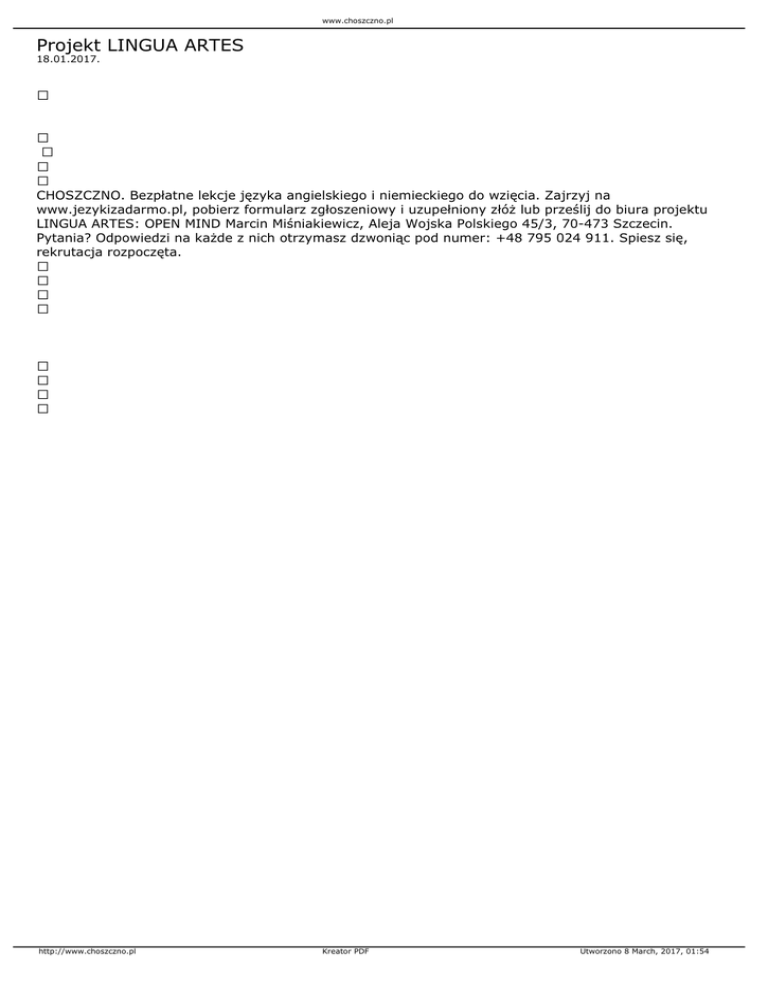 www.choszczno.pl Projekt LINGUA ARTES 18.01.2017. CHOSZCZNO. Bezpłatne lekcje języka angielskiego i niemieckiego do wzięcia. Zajrzyj na www.jezykizadarmo.pl, pobierz formularz zgłoszeniowy i uzupełniony złóż lub prześlij do biura projektu LINGUA ARTES: OPEN MIND Marcin Miśniakiewicz, Aleja Wojska Polskiego 45/3, 70-473 Szczecin. Pytania? Odpowiedzi na każde z nich otrzymasz dzwoniąc pod numer: +48 795 024 911. Spiesz się, rekrutacja rozpoczęta. http://www.choszczno.pl Kreator PDF Utworzono 8 March, 2017, 01:54