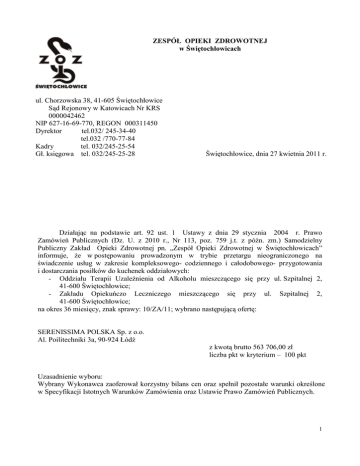 ZESPÓŁ OPIEKI ZDROWOTNEJ w Świętochłowicach ul. Chorzowska 38, 41-605 Świętochłowice Sąd Rejonowy w Katowicach Nr KRS 0000042462 NIP 627-16-69-770, REGON 000311450 Dyrektor tel.032/ 245-34-40 tel.032 /770-77-84 Kadry tel. 032/245-25-54 Gł. księgowa tel. 032/245-25-28 Świętochłowice, dnia 27 kwietnia 2011 r. Działając na podstawie art. 92 ust. 1 Ustawy z dnia 29 stycznia 2004 r. Prawo Zamówień Publicznych (Dz. U. z 2010 r., Nr 113, poz. 759 j.t. z późn. zm.) Samodzielny Publiczny Zakład Opieki Zdrowotnej pn. „Zespół Opieki Zdrowotnej w Świętochłowicach” informuje, że w postępowaniu prowadzonym w trybie przetargu nieograniczonego na świadczenie usług w zakresie kompleksowego- codziennego i całodobowego- przygotowania i dostarczania posiłków do kuchenek oddziałowych: - Oddziału Terapii Uzależnienia od Alkoholu mieszczącego się przy ul. Szpitalnej 2, 41-600 Świętochłowice; - Zakładu Opiekuńczo Leczniczego mieszczącego się przy ul. Szpitalnej 2, 41-600 Świętochłowice; na okres 36 miesięcy, znak sprawy: 10/ZA/11; wybrano następującą ofertę: SERENISSIMA POLSKA Sp. z o.o. Al. Poilitechniki 3a, 90-924 Łódź z kwotą brutto 563 706,00 zł liczba pkt w kryterium – 100 pkt Uzasadnienie wyboru: Wybrany Wykonawca zaoferował korzystny bilans cen oraz spełnił pozostałe warunki określone w Specyfikacji Istotnych Warunków Zamówienia oraz Ustawie Prawo Zamówień Publicznych. 1 Nazwy (firmy) albo imiona i nazwiska, siedziby albo miejsca zamieszkania i adresy Wykonawców, którzy złożyli oferty wraz ze streszczeniem i porównaniem oceny złożonych ofert: Nr Firma (nazwa) oraz adres oferty Wykonawcy 1. SERENISSIMA POLSKA Sp. z o.o. Al. Poilitechniki 3a 90-924 Łódź Wartość netto Wartość brutto Ilość punktów ogółem 521 658,00 zł netto 563 706,00 zł brutto 100 pkt Ofertę złożoną przez Wykonawcę została oceniona przez Zamawiającego w oparciu o kryteria wskazane w Specyfikacji Istotnych Warunków Zamówienia. Samodzielny Publiczny Zakład Opieki Zdrowotnej pn. „Zespół Opieki Zdrowotnej w Świętochłowicach” zawiadamia o wykluczeniu oferty Wykonawcy: Firma Cateringowa Damian Kajzer ul. Szpitalna 2, 41-600 Świętochłowice, na podstawie art. 24 ust. 2 pkt 4 ustawy z dnia 29 stycznia 2004 r. Prawo Zamówień Publicznych (Dz. U. z 2010 r., Nr 113, poz. 759 j.t. z późn. zm.), gdyż Wykonawca nie wykazał spełniania warunków udziału w postępowaniu poprzez nie uzupełnienie wymaganych dokumentów z terminie wyznaczonym, tj. do dnia 26 kwietnia 2011 r. Zgodnie z art. 24 ust. 4 ustawy z dnia 29 stycznia 2004 r. Prawo Zamówień Publicznych (Dz. U. z 2010 r., Nr 113, poz. 759 j.t. z późn. zm.) ofertę wykonawcy wykluczonego uznaje się za odrzuconą. Zgodnie z art. 94 ust. 1 pkt 1 Ustawy z dnia 29 stycznia 2004 r. Prawo zamówień Publicznych (Dz. U. z 2010 r., Nr 113, poz. 759 j.t. z późn. zm.) Zamawiający może podpisać umowę w sprawie zamówienia publicznego w terminie nie krótszym niż 5 dni od dnia przesłania zawiadomienia o wyborze najkorzystniejszej oferty, tj. 2.05.2011 r. 2