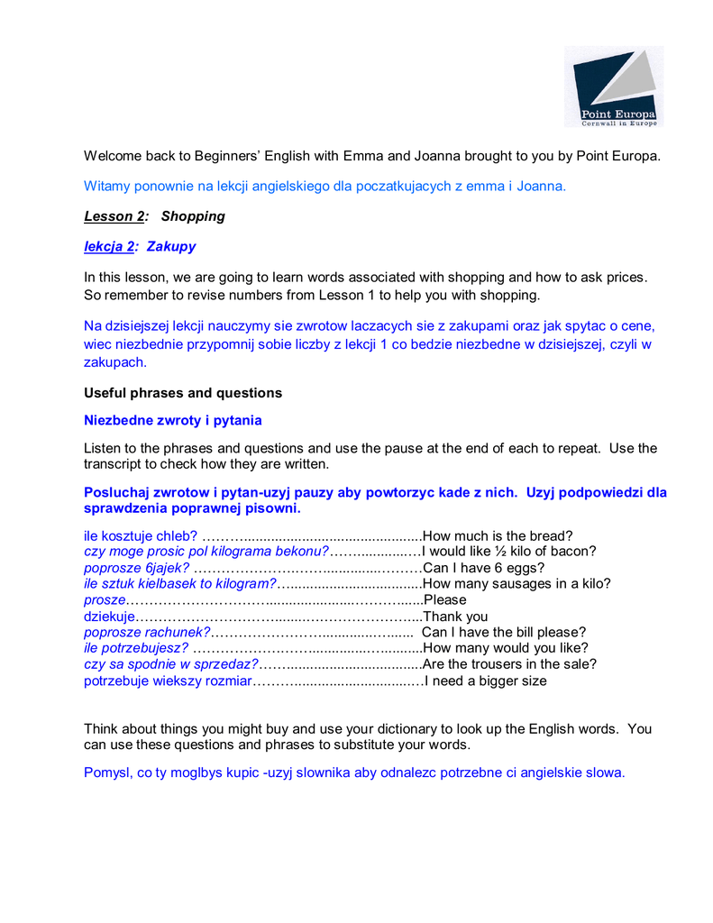 Welcome back to Beginners’ English with Emma and Joanna brought to you by Point Europa. Witamy ponownie na lekcji angielskiego dla poczatkujacych z emma i Joanna. Lesson 2: Shopping lekcja 2: Zakupy In this lesson, we are going to learn words associated with shopping and how to ask prices. So remember to revise numbers from Lesson 1 to help you with shopping. Na dzisiejszej lekcji nauczymy sie zwrotow laczacych sie z zakupami oraz jak spytac o cene, wiec niezbednie przypomnij sobie liczby z lekcji 1 co bedzie niezbedne w dzisiejszej, czyli w zakupach. Useful phrases and questions Niezbedne zwroty i pytania Listen to the phrases and questions and use the pause at the end of each to repeat. Use the transcript to check how they are written. Posluchaj zwrotow i pytan-uzyj pauzy aby powtorzyc kade z nich. Uzyj podpowiedzi dla sprawdzenia poprawnej pisowni. ile kosztuje chleb? ………..............................................How much is the bread? czy moge prosic pol kilograma bekonu?…….............…I would like ½ kilo of bacon? poprosze 6jajek? ………………….……...............………Can I have 6 eggs? ile sztuk kielbasek to kilogram?…..................................How many sausages in a kilo? prosze………………………….......................……….......Please dziekuje…………………………........….………………....Thank you poprosze rachunek?…………………….............…....... Can I have the bill please? ile potrzebujesz? ……………….……...............…...........How many would you like? czy sa spodnie w sprzedaz?……...................................Are the trousers in the sale? potrzebuje wiekszy rozmiar………..............................…I need a bigger size Think about things you might buy and use your dictionary to look up the English words. You can use these questions and phrases to substitute your words. Pomysl, co ty moglbys kupic -uzyj slownika aby odnalezc potrzebne ci angielskie slowa. Confusing words. Mylace slowa. In English we have many confusing words. The first we are going to meet is Trousers, because Trousers is ALWAYS plural (with an S on the end) even when you are talking about one pair. If you use trouser without an S on the end it describes part of the pair of trousers. W jezyku angielskim wystepuje wiele mylocych slow. Pierwsze kotore poznalismy to SPODNIE,poniewaz SPODNIE to zawsze liczba mnoga (Z litrera S na koncu)nawet jesli mowimy o jednej parze-podobnie jak w jezyku polskim.jesli wymawiamy trouser bez litery S na koncu, ozacza to pare spodni-the pair of trousers. For example: Na przyklad: Mam tylko jedna pare czarnych spodni ….........I only have 1 pair of black trousers Mam 6 par spodni, ale wszystkie sa mi za male.......I have 6 pairs of trousers, but they are all too small Moje spodnie maja dziure w kieszeni …….........…My trouser pocket has a hole in it Listen again to the questions and then to the answer. Use the pauses after each sentence to repeat. posluchaj jeszcze raz pytan i odpowiedzi. Uzyj pauzy aby powtorzyc kolejne zdania. ile koszkuhe cheb? ……................……….....…How much is the bread? 1funt,25 pensow ……………………….…………£1.25 poprosze 6 jajek ………………............…………Can I have 6 eggs? czy takie z chowu wolnego?……........……….…Do you want free range? ile sztuk kielbasek to kilogram? ….........…….... How many sausages in a kilo? zazwyczaj 6 ………………….…….....................About 6 usually ile potrzebujesz? …….………............................How many would you like? poprosze 8 ………………...................................Eight (8) please czy sa spodnie w sprzedazy?……………….... .Are the trousers in the sale? tak-dzisiaj sa o 50% tansze…………………... ..Yes – there is 50% off today potrzebuje wiekszy rozmiar ………... .…….…...I need a bigger size wjakim rozmiarze chcesz przymierzyc?…….….What size would you like to try? dlugosc 34………..............…………….………. A 34 long. Listen to the following dialogue and use the transcript to help you understand. posluchaj dialogu-dla ulatwienia skozystaj z podpowiedzi. Assistant: Good morning Madam. Customer: Hello. Can I have some cheese please? Assistant: Yes, how much would you like? Customer: 400 grams please. Assistant: Anything else? Customer: Yes. A bag of sugar. How much is that? Assistant: That’s £4.75. Thank you, here you are. Customer: Thank you. Assistant: You’re welcome. Have a nice day! Some things to remember Zapamietaj Pay attention to: IS for single items and ARE for plural items or more than two items. Money: only say pence when there are no pounds (for example, £0.90=ninety pence). zwroc uwage: IS(jest)uzywamy dla liczby pojedynczej natomiast ARE (sa)uzywamy dla liczby mnogiej lub gdy przedmiotow jest wiecej niz 2. pieniadze:zawsze mowimy pence jesli w kwocie nie ma funtow (np.£0,90=90 pensow). Ordering food at a café jak zamowic jedzenie w kawiarni Aneta: How much is a hamburger? Waiter: A hamburger is £3.75 (three pounds seventy five) Aneta: Does that include chips? Waiter: No. Would you like some. A portion is £2.95 (two pounds ninety five) Aneta: Yes please. Waiter: Would you like any drinks? Aneta: I would like a still water please. Waiter: Thank you. Your meal will be about 15 minutes. Aneta: Thank you. Waiter: Thank you. Lesson 2 Vocabulary Lekjca 2 slowniczek Sandwiches………………………... kanapki Chips………………………............. frytki Rice………………………... ........... ryz Cheese……………………….......... ser Milk……………………….............. mleko Fish………………………............... ryba Eggs……………………….............. jajka Bread………………………............ cheb Orange juice ………………….…... sok pomaranczowy Chick