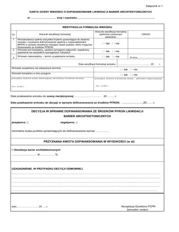 Załącznik nr 1 KARTA OCENY WNIOSKU O DOFINANSOWANIE LIKWIDACJI BARIER ARCHITEKTONICZNYCH nr …………….…..…….. imię i nazwisko…………………..………………………………………….…………… WERYFIKACJA FORMALNA WNIOSKU Warunki weryfikacji formalnej spełnione (zaznaczyć właściwe): Lp. Warunki weryfikacji formalnej: 1 Wnioskodawca spełnia wszystkie kryteria uprawniające do złożenia wniosku i uzyskania dofinansowania zgodnie z rozporządzeniem MPiPS w sprawie określenia rodzajów zadań powiatu, które mogą być finansowane ze środków PFRON Wniosek jest kompletny, zawiera wymagane załączniki, wypełniony poprawnie we wszystkich wymaganych rubrykach 2 3 - tak - nie - tak - nie - tak - nie Wniosek niekompletny – termin uzupełnienia wniosku UWAGI Do dnia……………………………... Data weryfikacji formalnej wniosku: …………………………………. 20 Wniosek uzupełniony we wskazanym terminie r. - tak - nie Wniosek kompletny w dniu przyjęcia - tak - nie pi eczątka i mi enna osoby dokonującej wer yfi kacji for mal nej wni osku pi eczątka i mi enna ki er owni ka dzi ału , jednostki organizacyjnej d at a, p o d p is: d at a, p o d p is: Data przekazania wniosku do oceny merytorycznej ………………………… 20 …….. r. Data przekazania wniosku do decyzji w sprawie dofinansowania ze środków PFRON: ..........................20…….r. DECYZJA W SPRAWIE DOFINANSOWANIA ZE ŚRODKÓW PFRON LIKWIDACJI BARIER ARCHITEKTONICZNYCH pozytywna: negatywna: minimalna liczba punktów uprawniających do dofinansowania wynosi: ………….. PRZYZNANA KWOTA DOFINANSOWANIA W WYSOKOŚCI (w zł): likwidacja barier architektonicznych .............................. zł…………….% UZASADNIENIE, W PRZYPADKU DECYZJI ODMOWNEJ: ………………………………………………………………………………………………………………………………………………… ………………………………………………………………………………………………………………………………………………… ………………………………………………………………………………………………………………………………………………… ………………………………………………………………………………………………………………………………………………… ……………………………………………………………………………………………………………………………………………… data.................................20……r. Akceptacja Dyrektora PCPR (pieczątka i podpis) KARTA OCENY MERYTORYCZNEJ WNIOSKU O DOFINANSOWANIE LIKWIDACJI BARIER ARCHITEKTONICZNYCH ( BA ) Liczba punktów KRYTERIA OCENY WNIOSKU Maksymalna liczba punktów 1 Stopień, przyczyna niepełnosprawności lub orzeczenie równoważne/zaświadczenie lekarskie 20 20 osoby z dysfunkcją ruchu poruszające się na wózku inwalidzkim , po amputacji lub a) wrodzonym braku kończyn górnych lub dolnych, niewidome b) niewidome dysfunkcja narządu ruchu / wzroku/ choroby neurologiczne, znaczny (I grupa inwalidzka) / dzieci 15 umiarkowany (II grupa inwalidzka) 10 5 lekki (III grupa inwalidzka) c) występuje niepełnosprawność sprzężona 2 Korzystanie ze środków finansowych PFRON a) Wnioskodawca nie korzystał z dofinansowania na likwidację barier architektonicznych ze środków PFRON 3 Inne kryteria: a) dodatkowe osoby niepełnosprawne pozostające we wspólnym gospodarstwie Wnioskodawcy – jedna osoba 5 5 10 10 5 – więcej niż jedna osoba 4 15 10 10 Dochód w rodzinie jednoosobowej 5 a) Osoba samotna b) dochód – do 634 zł 20 c) dochód - od 635 zł do 1500 zł 10 5 Dochód w rodzinie wieloosobowej a) dochód – do 514 zł 20 b) dochód - od 515 zł do 1100 zł 10 6 Warunki mieszkaniowo - bytowe - ocena dokonana na podstawie protokołu wizji lokalnej a) złe 25 20 20 Maksymalna punktacja BA 20 125 WNIOSEK OTRZYMAŁ PUNKTACJĘ Minimalna liczba punktów uprawniająca do dofinansowania: BA: Podpis pracownika dokonującego oceny merytorycznej wniosku Podpis kierownika działu Data, podpis Data, podpis Punktacja wniosku