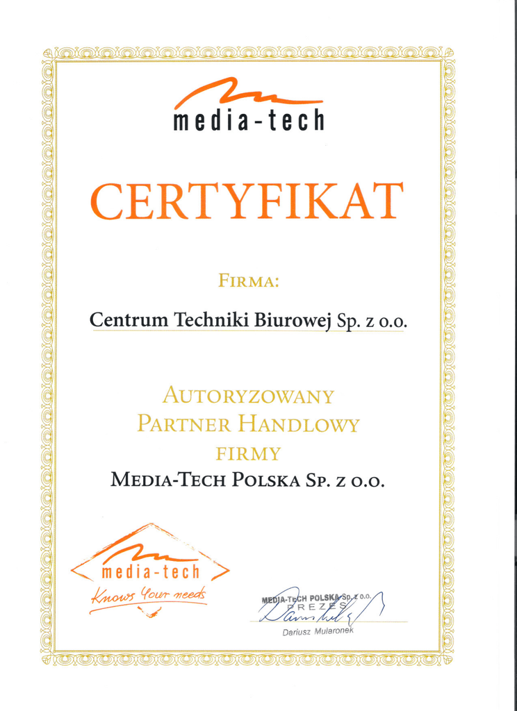 media-tech CERTYFIKAT FIRMA: AUTORYZOWANY PARTNER HANDLOWY FIRMY MEDIA-TECH POLSKA SP. Z 0.0. _~ZF~ Dariusz Mu/aronek