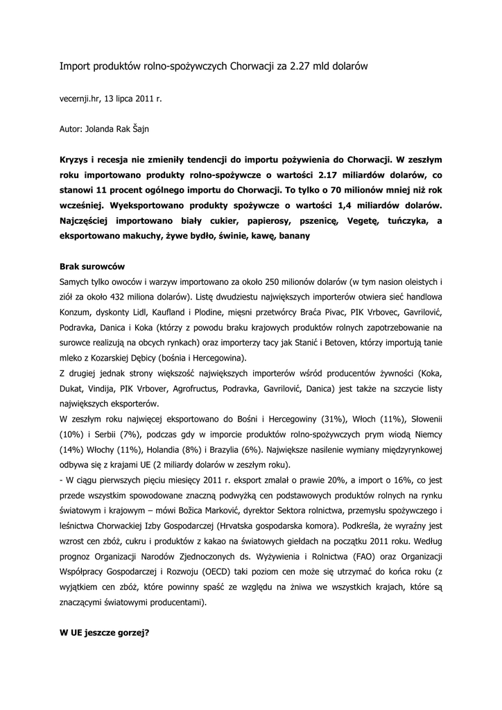 Import produktów rolno-spożywczych Chorwacji za 2.27 mld dolarów vecernji.hr, 13 lipca 2011 r. Autor: Jolanda Rak Šajn Kryzys i recesja nie zmieniły tendencji do importu pożywienia do Chorwacji. W zeszłym roku importowano produkty rolno-spożywcze o wartości 2.17 miliardów dolarów, co stanowi 11 procent ogólnego importu do Chorwacji. To tylko o 70 milionów mniej niż rok wcześniej. Wyeksportowano produkty spożywcze o wartości 1,4 miliardów dolarów. Najczęściej importowano biały cukier, papierosy, pszenicę, Vegetę, tuńczyka, a eksportowano makuchy, żywe bydło, świnie, kawę, banany Brak surowców Samych tylko owoców i warzyw importowano za około 250 milionów dolarów (w tym nasion oleistych i ziół za około 432 miliona dolarów). Listę dwudziestu największych importerów otwiera sieć handlowa Konzum, dyskonty Lidl, Kaufland i Plodine, mięsni przetwórcy Braća Pivac, PIK Vrbovec, Gavrilović, Podravka, Danica i Koka (którzy z powodu braku krajowych produktów rolnych zapotrzebowanie na surowce realizują na obcych rynkach) oraz importerzy tacy jak Stanić i Betoven, którzy importują tanie mleko z Kozarskiej Dębicy (bośnia i Hercegowina). Z drugiej jednak strony większość największych importerów wśród producentów żywności (Koka, Dukat, Vindija, PIK Vrbover, Agrofructus, Podravka, Gavrilović, Danica) jest także na szczycie listy największych eksporterów. W zeszłym roku najwięcej eksportowano do Bośni i Hercegowiny (31%), Włoch (11%), Słowenii (10%) i Serbii (7%), podczas gdy w imporcie produktów rolno-spożywczych prym wiodą Niemcy (14%) Włochy (11%), Holandia (8%) i Brazylia (6%). Największe nasilenie wymiany międzyrynkowej odbywa się z krajami UE (2 miliardy dolarów w zeszłym roku). - W ciągu pierwszych pięciu miesięcy 2011 r. eksport zmalał o prawie 20%, a import o 16%, co jest przede wszystkim spowodowane znaczną podwyżką cen podstawowych produktów rolnych na rynku światowym i krajowym – mówi Božica Marković, dyrektor Sektora rolnictwa, przemysłu spożywczego i leśnictwa Chorwackiej Izby Gospodarczej (Hrvatska gospodarska komora). Podkreśla, że wyraźny jest wzrost cen zbóż, cukru i produktów z kakao na światowych giełdach na początku 2011 roku. Według prognoz Organizacji Narodów Zjednoczonych ds. Wyżywienia i Rolnictwa (FAO) oraz Organizacji Współpracy Gospodarczej i Rozwoju (OECD) taki poziom cen może się utrzymać do końca roku (z wyjątkiem cen zbóż, które powinny spaść ze względu na żniwa we wszystkich krajach, które są znaczącymi światowymi producentami). W UE jeszcze gorzej? Stipan Bilić, dyrektor Kondina (przemysł cukierniczy) i specjalista ds. rolnictwa zwraca uwagę, że przez ostatnie lata obmyślano wiele rolniczych strategii, a rezultaty są takie, że przez 20 lat uprawiano 1,69 milionów hektarów gruntów ornych i wykorzystywano tyle samo pastwisk i łąk, podczas gdy dziś uprawia się 800 tys. hektarów pól i wykorzystuje zaledwie 500 tysięcy hektarów pastwisk, co nie jest wystarczające do wyżywienia 3 milionów osób, a co dopiero 10 milionów, co jest przecież potencjałem Chorwacji. Tłum i red. Joanna Nowak