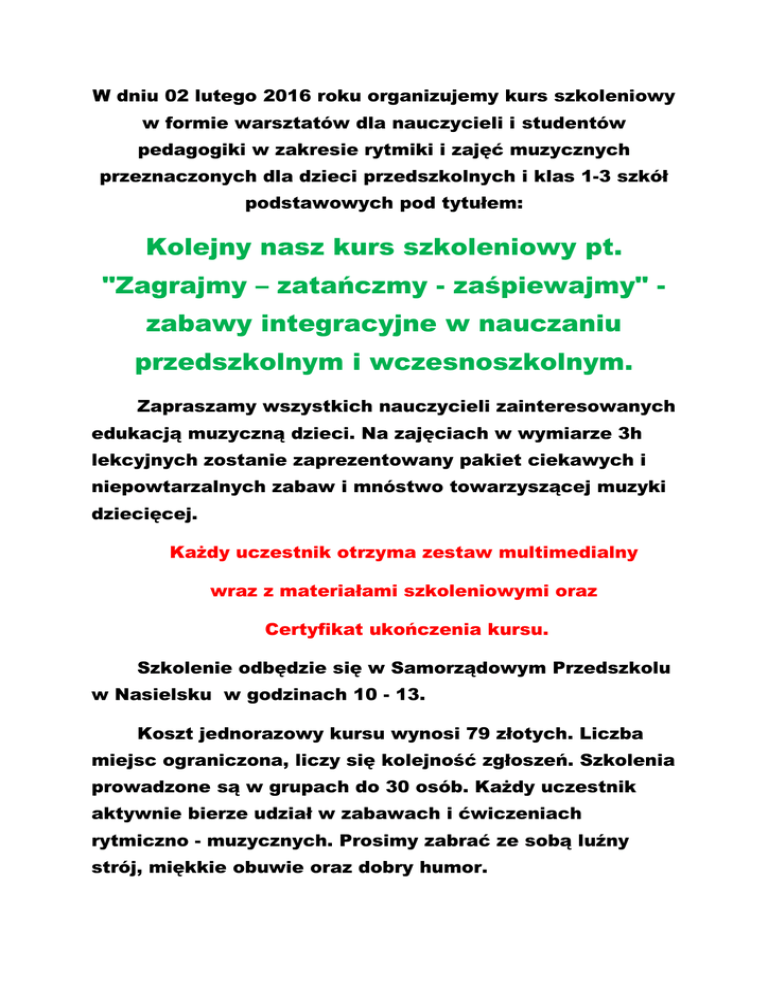 W dniu 02 lutego 2016 roku organizujemy kurs szkoleniowy w formie warsztatów dla nauczycieli i studentów pedagogiki w zakresie rytmiki i zajęć muzycznych przeznaczonych dla dzieci przedszkolnych i klas 1-3 szkół podstawowych pod tytułem: Kolejny nasz kurs szkoleniowy pt. "Zagrajmy – zatańczmy - zaśpiewajmy" zabawy integracyjne w nauczaniu przedszkolnym i wczesnoszkolnym. Zapraszamy wszystkich nauczycieli zainteresowanych edukacją muzyczną dzieci. Na zajęciach w wymiarze 3h lekcyjnych zostanie zaprezentowany pakiet ciekawych i niepowtarzalnych zabaw i mnóstwo towarzyszącej muzyki dziecięcej. Każdy uczestnik otrzyma zestaw multimedialny wraz z materiałami szkoleniowymi oraz Certyfikat ukończenia kursu. Szkolenie odbędzie się w Samorządowym Przedszkolu w Nasielsku w godzinach 10 - 13. Koszt jednorazowy kursu wynosi 79 złotych. Liczba miejsc ograniczona, liczy się kolejność zgłoszeń. Szkolenia prowadzone są w grupach do 30 osób. Każdy uczestnik aktywnie bierze udział w zabawach i ćwiczeniach rytmiczno - muzycznych. Prosimy zabrać ze sobą luźny strój, miękkie obuwie oraz dobry humor. Szczegóły na stronie: www.rytmika.edu.pl Zgłoszenia prosimy kierować na adres mailowy: [email protected] lub telefonicznie: 602 192 071, 600 031 038 Agencja Artystyczna - Barbara Lusawa ul. Wincentego Witosa 50 06-400 Ciechanów Tel. 602 192 071, 600 031 038 www.rytmika.edu.pl Serdecznie zapraszamy !!!