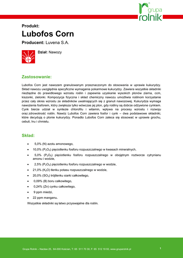 Produkt: Lubofos Corn Producent: Luvena S.A. Dział: Nawozy Zastosowanie: Lubofos Corn jest nawozem granulowanym przeznaczonym do stosowania w uprawie kukurydzy. Skład nawozu uwzględnia specyficzne wymagania pokarmowe kukurydzy. Zawiera wszystkie składniki niezbędne do prawidłowego wzrostu roślin i zapewnia uzyskanie wysokich plonów ziarna, ccm, kiszonki, zielonki. Kompozycja fizyczna i skład chemiczny nawozu umożliwia roślinom korzystanie przez cały okres wzrostu ze składników uwalniających się z granuli nawozowej. Kukurydza wymaga nawożenia fosforem, który zwiększa tylko wówczas jej plon, gdy rośliny są dobrze odżywione cynkiem. Cynk bierze udział w syntezie chlorofilu i witamin, wpływa na procesy wzrostu i rozwoju oraz zdrowotność roślin. Nawóz Lubofos Corn zawiera fosfor i cynk – dwa podstawowe składniki, które decydują o plonie kukurydzy. Ponadto Lubofos Corn zaleca się stosować w uprawie grochu, cebuli, lnu i chmielu. Skład: 5,0% (N) azotu amonowego, 10,0% (P2O5) pięciotlenku fosforu rozpuszczalnego w kwasach mineralnych, 5,0% (P2O5) pięciotlenku fosforu rozpuszczalnego w obojętnym roztworze cytrynianu amonu i wodzie, 2,5% (P2O5) pięciotlenku fosforu rozpuszczalnego w wodzie, 21,0% (K2O) tlenku potasu rozpuszczalnego w wodzie, 20,0% (SO3) trójtlenku siarki całkowitego, 0,09% (B) boru całkowitego, 0,24% (Zn) cynku całkowitego, 9 ppm miedzi, 22 ppm manganu. Wszystkie składniki są łatwo przyswajalne dla roślin. Grupa Rolnik – Nacław 25, 64-000 Kościan, T: 65 511 70 30, F: 65 512 19 93, www.gruparolnik.pl 1 Dawki: Najwyższą efektywność uzyskuje się stosując Lubofos Corn przedsiewnie, mieszając z glebą na głębokość 10-15 cm w czasie wykonywania przedsiewnych zabiegów uprawowych. Lubofos Corn można również stosować w dawce startowej, tzn. wysiewać razem z nasionami kukurydzy. Jedynym warunkiem zastosowania nawożenia startowego jest posiadanie typowego siewnika do równoczesnego wysiewu nasion kukurydzy i nawozu. Zalecane dawki nawozu w uprawie kukurydzy na ziarno i ccm (kg na 1 ha) zawartość fosforu i potasu przyswajalnego w glebie** Poziom plonów Średni (5 t/ha) Wysoki (8 t/ha) niska Średnia wysoka bardzo wysoka*** 500-600 300-400 100-200 50-100 650-750 550-650 250-350 100-200 *w uprawie kukurydzy na kiszonkę dawkę nawozu, w stanowisku o klasie zasobności średniej i niskiej zwiększamy o 50 kg/ha, **w sytuacji, gdy oba składniki należą do różnych klas zasobności, dawkę nawozu ustalamy dla składnika znajdującego się w klasie niższej, ***w dobrych warunkach pogodowych uzyskać można plon wyższy od zakładanego. Źródło: http://www.luvena.pl/ Grupa Rolnik – Nacław 25, 64-000 Kościan, T: 65 511 70 30, F: 65 512 19 93, www.gruparolnik.pl 2