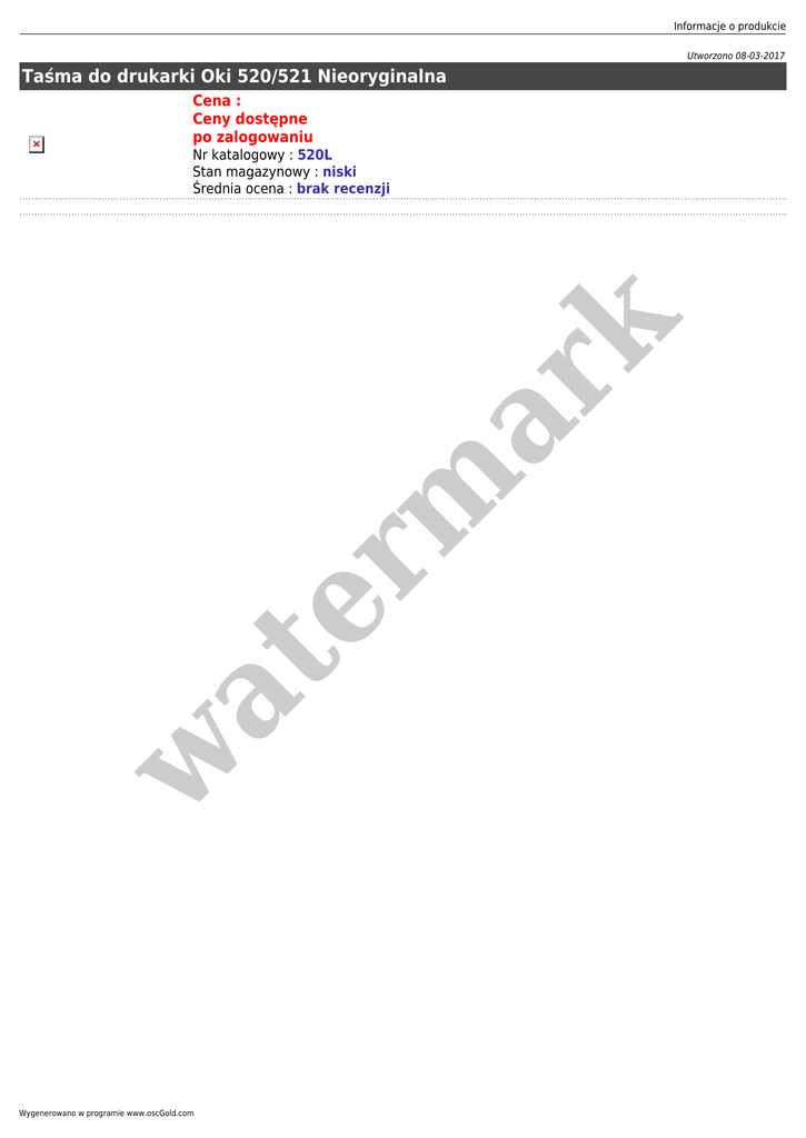 Informacje o produkcie Utworzono 08-03-2017 Taśma do drukarki Oki 520/521 Nieoryginalna Cena : Ceny dostępne po zalogowaniu w at er m ar k Nr katalogowy : 520L Stan magazynowy : niski Średnia ocena : brak recenzji Wygenerowano w programie www.oscGold.com