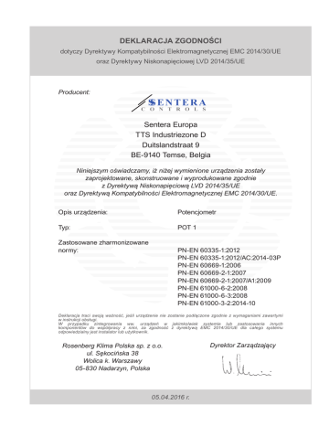 DEKLARACJA ZGODNOŚCI dotyczy Dyrektywy Kompatybilności Elektromagnetycznej EMC 2014/30/UE oraz Dyrektywy Niskonapięciowej LVD 2014/35/UE Producent: Sentera Europa TTS Industriezone D Duitslandstraat 9 BE-9140 Temse, Belgia Niniejszym oświadczamy, iż niżej wymienione urządzenia zostały zaprojektowane, skonstruowane i wyprodukowane zgodnie z Dyrektywą Niskonapięciową LVD 2014/35/UE oraz Dyrektywą Kompatybilności Elektromagnetycznej EMC 2014/30/UE. Opis urządzenia: Potencjometr Typ: POT 1 Zastosowane zharmonizowane normy: PN-EN 60335-1:2012 PN-EN 60335-1:2012/AC:2014-03P PN-EN 60669-1:2006 PN-EN 60669-2-1:2007 PN-EN 60669-2-1:2007/A1:2009 PN-EN 61000-6-2:2008 PN-EN 61000-6-3:2008 PN-EN 61000-3-2:2014-10 Deklaracja traci swoją ważność, jeśli urządzenie nie zostanie podłączone zgodnie z wymaganiami zawartymi w instrukcji obsługi. W przypadku zintegrowania ww. urządzeń w jakimkolwiek systemie lub zastosowania innych komponentów do współpracy z nimi, za zgodność z dyrektywą EMC 2014/30/UE dla całego systemu odpowiedzialny jest instalator lub użytkownik. Rosenberg Klima Polska sp. z o.o. ul. Sękocińska 38 Wolica k. Warszawy 05-830 Nadarzyn, Polska 05.04.2016 r. Dyrektor Zarządzający