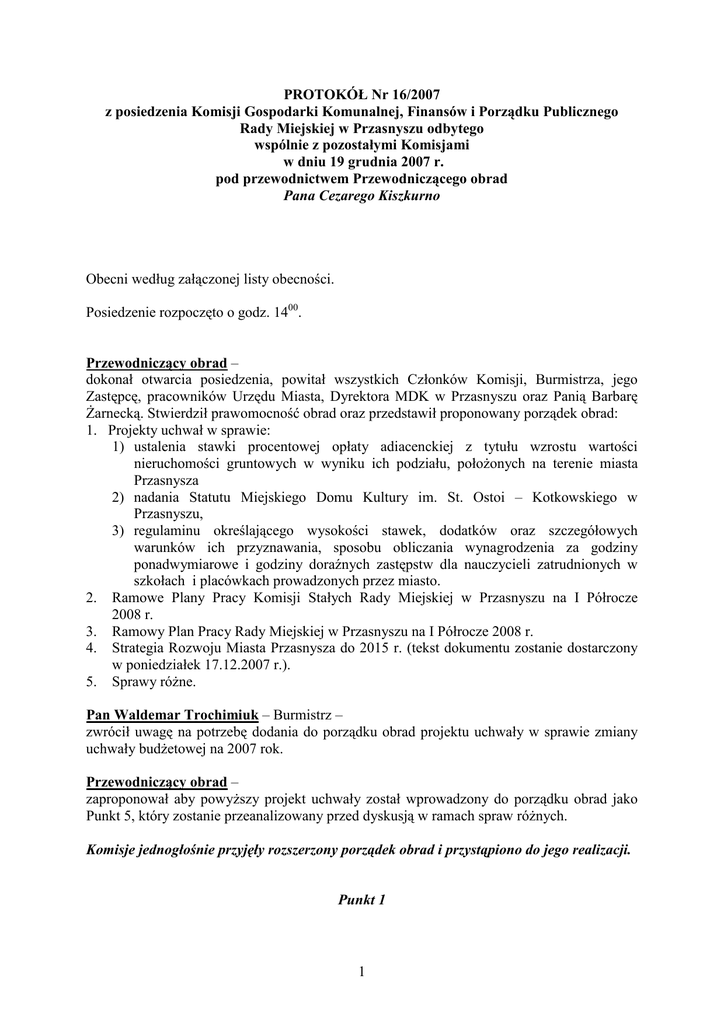 PROTOKÓŁ Nr 16/2007 z posiedzenia Komisji Gospodarki Komunalnej, Finansów i Porządku Publicznego Rady Miejskiej w Przasnyszu odbytego wspólnie z pozostałymi Komisjami w dniu 19 grudnia 2007 r. pod przewodnictwem Przewodniczącego obrad Pana Cezarego Kiszkurno Obecni według załączonej listy obecności. Posiedzenie rozpoczęto o godz. 1400. Przewodniczący obrad – dokonał otwarcia posiedzenia, powitał wszystkich Członków Komisji, Burmistrza, jego Zastępcę, pracowników Urzędu Miasta, Dyrektora MDK w Przasnyszu oraz Panią Barbarę śarnecką. Stwierdził prawomocność obrad oraz przedstawił proponowany porządek obrad: 1. Projekty uchwał w sprawie: 1) ustalenia stawki procentowej opłaty adiacenckiej z tytułu wzrostu wartości nieruchomości gruntowych w wyniku ich podziału, połoŜonych na terenie miasta Przasnysza 2) nadania Statutu Miejskiego Domu Kultury im. St. Ostoi – Kotkowskiego w Przasnyszu, 3) regulaminu określającego wysokości stawek, dodatków oraz szczegółowych warunków ich przyznawania, sposobu obliczania wynagrodzenia za godziny ponadwymiarowe i godziny doraźnych zastępstw dla nauczycieli zatrudnionych w szkołach i placówkach prowadzonych przez miasto. 2. Ramowe Plany Pracy Komisji Stałych Rady Miejskiej w Przasnyszu na I Półrocze 2008 r. 3. Ramowy Plan Pracy Rady Miejskiej w Przasnyszu na I Półrocze 2008 r. 4. Strategia Rozwoju Miasta Przasnysza do 2015 r. (tekst dokumentu zostanie dostarczony w poniedziałek 17.12.2007 r.). 5. Sprawy róŜne. Pan Waldemar Trochimiuk – Burmistrz – zwrócił uwagę na potrzebę dodania do porządku obrad projektu uchwały w sprawie zmiany uchwały budŜetowej na 2007 rok. Przewodniczący obrad – zaproponował aby powyŜszy projekt uchwały został wprowadzony do porządku obrad jako Punkt 5, który zostanie przeanalizowany przed dyskusją w ramach spraw róŜnych. Komisje jednogłośnie przyjęły rozszerzony porządek obrad i przystąpiono do jego realizacji. Punkt 1 1 Podpunkt 1 Pan Waldemar Trochimiuk – Burmistrz – przekazał informacje dotyczące zmiany art. 98a ustawy o gospodarce nieruchomościami, który przewiduje uprawnienie Burmistrza Miasta do ustalenia w drodze decyzji administracyjnej opłaty adiacenckiej z tytułu wzrostu wartości nieruchomości w wyniku jej podziału dokonanego na wniosek właściciela. Następnie podkreślił, iŜ warunkiem moŜności wydania tego typu rozstrzygnięcia jest podjęcie przez Radę Miejską stosownej uchwały określającej wysokość stawki procentowej opłaty adiacenckiej. Kontynuując dodał, iŜ z uwagi na fakt zmiany ustawowej maksymalnej stawki przedmiotowej opłaty z 50% na 30% celowym rozwiązaniem jest podjęcie stosownego aktu przez Radę Miejską, który pozbawi mocy prawnej obecnie obowiązującą uchwałę w tej kwestii, przewidującą wysokość stawki sprzeczną z aktualnym stanem prawnym i jednocześnie ustanowi nową wysokość stawki procentowej opłaty adiacenckiej, która zgodnie z jego propozycją powinna wynosić 30%. Pani ElŜbieta Kisiel – Naczelnik wydziału GGNPP – uzupełniając wypowiedź Burmistrza poinformowała, iŜ przedmiotowy projekt uchwały dotyczy opłaty adiacenckiej pobieranej na skutek wzrostu wartości nieruchomości w wyniku jej podziału, której nie naleŜy łączyć z opłatą planistyczną określoną w miejscowym planie zagospodarowania przestrzennego. Kontynuując przedstawiła sposób ustalenia jej rzeczywistej wysokości wyjaśniając, iŜ stanowi ona iloraz stawki procentowej ustalonej przez Radę Miejską i róŜnicy pomiędzy wartością jaką dana nieruchomość posiadała przed podziałem a wartością uzyskaną w jego wyniku. Komisje jednogłośnie pozytywnie zaopiniował projekt uchwały oraz propozycję Burmistrza w przedmiocie wysokości stawki procentowej opłaty adiacenckiej. Podpunkt 2 Pan Waldemar Trochimiuk – Burmistrz – poinformował, iŜ potrzeba podjęcia przez Radę Miejską przedmiotowego projektu uchwały wynika z konieczności ujednolicenia treści Statutu Miejskiego Domu Kultury w Przasnyszu oraz unormowania wprowadzonych zmian związanych z funkcjonowaniem w ramach wskazanej placówki kulturalnej Kina Światowid. Następnie wyjaśnił, iŜ pomimo uŜycia w tytule przedmiotowej uchwały zwrotu „nadanie statutu”, to w rzeczywistości naleŜy traktować ten dokument jako ujednolicenie tekstu statutu Miejskiego Domu Kultury w Przasnyszu. Pan Jarosław Włodarczyk – Radny – odnosząc się do kwestii sprzedaŜy artykułów uŜytku kulturalnego – dzieł twórców z terenu miasta i powiatu przasnyskiego zwrócił uwagę na brak regulacji normującej sprzedaŜ dzieł autorów pochodzących z terenu powiatu przasnyskiego, którzy tworzyli w innych regionach kraju. Pan Bogdan Kruszewski – Dyrektor Miejskiego Domu Kultury – poinformował, iŜ MDK działa głównie na terenie miasta i unormowana w statucie sprzedaŜ dotyczy wyłącznie jego wydawnictw własnych oraz z nim współpracujących. Dodał, iŜ przedmiotowy zapis legalizuje prowadzenie sprzedaŜy wskazanych powyŜej dzieł na róŜnych okolicznościowych imprezach kulturalnych takich jak Dni Przasnysza. Na zakończenie wypowiedzi jednoznacznie wykluczył i podkreślił swój negatywny stosunek do stwierdzenia, iŜ powyŜsze rozwiązanie moŜe prowadzić do przekształcenia tej placówki kulturalnej w 2 swoisty dom handlowy. Pan Krzysztof Gadomski – Radny – biorąc pod rozwagę procedurę powoływania dyrektora Miejskiego Domu Kultury zwrócił się z zapytaniem w przedmiocie moŜliwości wytypowania do składu komisji rekrutacyjnej członka Komisji Oświaty, Kultury, Zdrowia i Opieki Społecznej. Pan Waldemar Trochimiuk – Burmistrz – wyjaśnił, iŜ z uwagi na przedmiot działalności wskazanej przez przedmówcę Komisji Stałej oraz szeroko rozumiany kulturalny charakter Miejskiego Domu Kultury, uczestnictwo w pracach komisji rekrutacyjnej reprezentanta danej Komisji Stałej Rady Miejskiej jest w