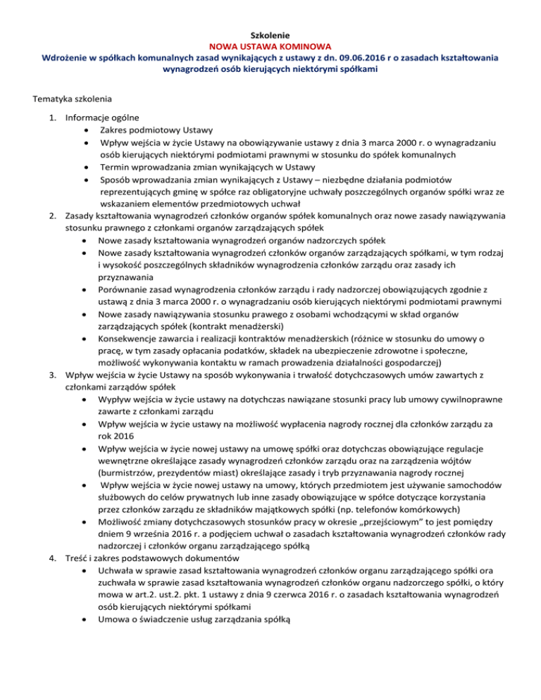 Szkolenie NOWA USTAWA KOMINOWA Wdrożenie w spółkach komunalnych zasad wynikających z ustawy z dn. 09.06.2016 r o zasadach kształtowania wynagrodzeń osób kierujących niektórymi spółkami Tematyka szkolenia 1. Informacje ogólne Zakres podmiotowy Ustawy Wpływ wejścia w życie Ustawy na obowiązywanie ustawy z dnia 3 marca 2000 r. o wynagradzaniu osób kierujących niektórymi podmiotami prawnymi w stosunku do spółek komunalnych Termin wprowadzania zmian wynikających w Ustawy Sposób wprowadzania zmian wynikających z Ustawy – niezbędne działania podmiotów reprezentujących gminę w spółce raz obligatoryjne uchwały poszczególnych organów spółki wraz ze wskazaniem elementów przedmiotowych uchwał 2. Zasady kształtowania wynagrodzeń członków organów spółek komunalnych oraz nowe zasady nawiązywania stosunku prawnego z członkami organów zarządzających spółek Nowe zasady kształtowania wynagrodzeń organów nadzorczych spółek Nowe zasady kształtowania wynagrodzeń członków organów zarządzających spółkami, w tym rodzaj i wysokość poszczególnych składników wynagrodzenia członków zarządu oraz zasady ich przyznawania Porównanie zasad wynagrodzenia członków zarządu i rady nadzorczej obowiązujących zgodnie z ustawą z dnia 3 marca 2000 r. o wynagradzaniu osób kierujących niektórymi podmiotami prawnymi Nowe zasady nawiązywania stosunku prawego z osobami wchodzącymi w skład organów zarządzających spółek (kontrakt menadżerski) Konsekwencje zawarcia i realizacji kontraktów menadżerskich (różnice w stosunku do umowy o pracę, w tym zasady opłacania podatków, składek na ubezpieczenie zdrowotne i społeczne, możliwość wykonywania kontaktu w ramach prowadzenia działalności gospodarczej) 3. Wpływ wejścia w życie Ustawy na sposób wykonywania i trwałość dotychczasowych umów zawartych z członkami zarządów spółek Wypływ wejścia w życie ustawy na dotychczas nawiązane stosunki pracy lub umowy cywilnoprawne zawarte z członkami zarządu Wpływ wejścia w życie ustawy na możliwość wypłacenia nagrody rocznej dla członków zarządu za rok 2016 Wpływ wejścia w życie nowej ustawy na umowę spółki oraz dotychczas obowiązujące regulacje wewnętrzne określające zasady wynagrodzeń członków zarządu oraz na zarządzenia wójtów (burmistrzów, prezydentów miast) określające zasady i tryb przyznawania nagrody rocznej Wpływ wejścia w życie nowej ustawy na umowy, których przedmiotem jest używanie samochodów służbowych do celów prywatnych lub inne zasady obowiązujące w spółce dotyczące korzystania przez członków zarządu ze składników majątkowych spółki (np. telefonów komórkowych) Możliwość zmiany dotychczasowych stosunków pracy w okresie „przejściowym” to jest pomiędzy dniem 9 września 2016 r. a podjęciem uchwał o zasadach kształtowania wynagrodzeń członków rady nadzorczej i członków organu zarządzającego spółką 4. Treść i zakres podstawowych dokumentów Uchwała w sprawie zasad kształtowania wynagrodzeń członków organu zarządzającego spółki ora zuchwała w sprawie zasad kształtowania wynagrodzeń członków organu nadzorczego spółki, o który mowa w art.2. ust.2. pkt. 1 ustawy z dnia 9 czerwca 2016 r. o zasadach kształtowania wynagrodzeń osób kierujących niektórymi spółkami Umowa o świadczenie usług zarządzania spółką