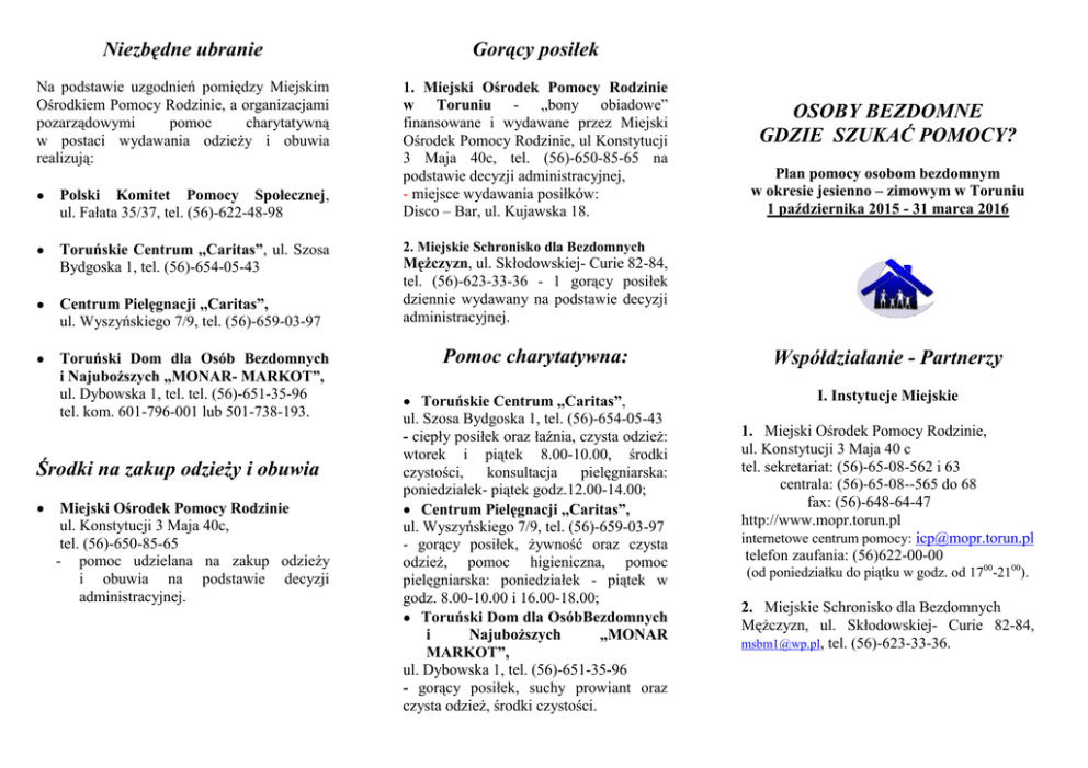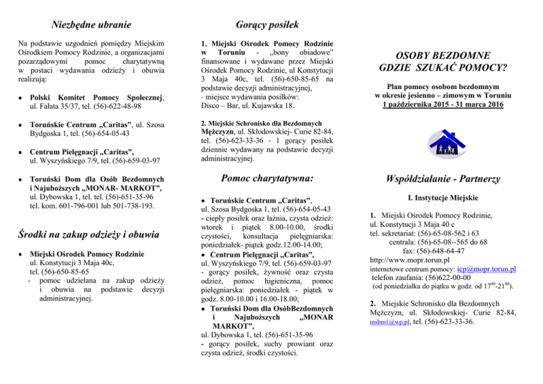 Niezbędne ubranie Gorący posiłek Na podstawie uzgodnień pomiędzy Miejskim Ośrodkiem Pomocy Rodzinie, a organizacjami pozarządowymi pomoc charytatywną w postaci wydawania odzieży i obuwia realizują: 1. Miejski Ośrodek Pomocy Rodzinie w Toruniu - „bony obiadowe” finansowane i wydawane przez Miejski Ośrodek Pomocy Rodzinie, ul Konstytucji 3 Maja 40c, tel. (56)-650-85-65 na podstawie decyzji administracyjnej, - miejsce wydawania posiłków: Disco – Bar, ul. Kujawska 18. Polski Komitet Pomocy Społecznej, ul. Fałata 35/37, tel. (56)-622-48-98 Toruńskie Centrum ,,Caritas”, ul. Szosa Bydgoska 1, tel. (56)-654-05-43 Centrum Pielęgnacji ,,Caritas”, ul. Wyszyńskiego 7/9, tel. (56)-659-03-97 Toruński Dom dla Osób Bezdomnych i Najuboższych „MONAR- MARKOT”, ul. Dybowska 1, tel. tel. (56)-651-35-96 tel. kom. 601-796-001 lub 501-738-193. Środki na zakup odzieży i obuwia Miejski Ośrodek Pomocy Rodzinie ul. Konstytucji 3 Maja 40c, tel. (56)-650-85-65 - pomoc udzielana na zakup odzieży i obuwia na podstawie decyzji administracyjnej. OSOBY BEZDOMNE GDZIE SZUKAĆ POMOCY? Plan pomocy osobom bezdomnym w okresie jesienno – zimowym w Toruniu 1 października 2015 - 31 marca 2016 2. Miejskie Schronisko dla Bezdomnych Mężczyzn, ul. Skłodowskiej- Curie 82-84, tel. (56)-623-33-36 - 1 gorący posiłek dziennie wydawany na podstawie decyzji administracyjnej. Pomoc charytatywna: Współdziałanie - Partnerzy Toruńskie Centrum ,,Caritas”, ul. Szosa Bydgoska 1, tel. (56)-654-05-43 - ciepły posiłek oraz łaźnia, czysta odzież: wtorek i piątek 8.00-10.00, środki czystości, konsultacja pielęgniarska: poniedziałek- piątek godz.12.00-14.00; Centrum Pielęgnacji ,,Caritas”, ul. Wyszyńskiego 7/9, tel. (56)-659-03-97 - gorący posiłek, żywność oraz czysta odzież, pomoc higieniczna, pomoc pielęgniarska: poniedziałek - piątek w godz. 8.00-10.00 i 16.00-18.00; Toruński Dom dla OsóbBezdomnych i Najuboższych „MONAR MARKOT”, ul. Dybowska 1, tel. (56)-651-35-96 - gorący posiłek, suchy prowiant oraz czysta odzież, środki czystości. I. Instytucje Miejskie 1. Miejski Ośrodek Pomocy Rodzinie, ul. Konstytucji 3 Maja 40 c tel. sekretariat: (56)-65-08-562 i 63 centrala: (56)-65-08--565 do 68 fax: (56)-648-64-47 http://www.mopr.torun.pl internetowe centrum pomocy: [email protected] telefon zaufania: (56)622-00-00 (od poniedziałku do piątku w godz. od 1700-2100). 2. Miejskie Schronisko dla Bezdomnych Mężczyzn, ul. Skłodowskiej- Curie 82-84, [email protected], tel. (56)-623-33-36. 3. Straż Miejska, tel. bezpłatny 986, ul. Grudziądzka 157, tel. (56)-622-58-77. 4. Komenda Miejska Policji , 997, ul. Grudziądzka 17, tel. (56)-641-28-11, (56)-641-23-80. 5. Komisariat Policji – Toruń Śródmieście, ul. PCK 2 tel. (56)-641-28-11, (56)-641-23-83. 6. Komisariat Policji „Toruń Podgórz”, ul. Poznańska 129, tel. (56)-641-24-70. 7. Komisariat Policji „Toruń Rubinkowo”, ul. Dziewulskiego 1, tel. (56)-641-25-70. 8. Urząd Miasta Torunia, Wydział Zdrowia i Polityki Społecznej, ul. Fałata 39, tel.(56)-611-84-54. 9. Urząd Miasta Torunia, Wydział Ochrony Ludności, ul. Legionów 70/76, tel. (56)-611-93-00. II Organizacje pozarządowe 1. Polski Komitet Pomocy Społecznej, ul. Fałata 35/37, tel. (56)-622-48-98, [email protected] 2. Toruńskie Centrum ,,Caritas”, ul. Szosa Bydgoska 1, tel. (56)-654-05-43, [email protected] 3. Centrum Pielęgnacji ,,Caritas”, ul. Wyszyńskiego 7/9, tel. (56)-659-03-97, cpielę[email protected] 4. Toruński Dom dla Osób Bezdomnych i Najuboższych „MONAR- MARKOT” ul. Dybowska 1, tel. (56)651-35-96 tel. kom. 601-796-001 lub 501-738-193. Koordynator Schronienie 1. Miejskie Schronisko dla Bezdomnych Mężczyzn ul. Skłodowskiej- Curie 82-84,, tel. (56)-623-33-36, czynne 24h Miejski Ośrodek Pomocy Rodzinie ul. Konstytucji 3 Maja 40c. Pracownik socjalny ds. bezdomności ul. Skłodowskiej- Curie 82-84, ( budynek noclegowni) tel. kom. 517 – 583 – 507. [email protected] 2. Noclegownia dla bezdomnych mężczyzn ul. Skłodowskiej - Curie 82-84 przy Miejskim Schronisku dla Bezdomnych Mężczyzn w Toruniu tel. (56)-623-28-54. 3. Toruński Dom dla Osób Bezdomnych i Najuboższych „MONAR- MARKOT” ul. Dybowska 1, tel. (56)-651-35-96 tel. kom. 601-796-001 lub 501-738-193. 4. Toruńskie Centrum ,,Caritas” Noclegownia dla bezdomnych kobiet ul. Szosa Bydgoska 1, tel. (56)-654-05-43. 5. Zespół Interwencji Kryzysowej MOPR ul. Skłodowskiej- Curie 82-84 tel. (56)-477-00-92 lub (56)-477-00-91 miejsca dla bezdomnych kobiet i kobiet z dziećmi w tym miejsca dla ofiar przemocy domowej. Główny realizator - dyżur 24h Miejskie Schroniska dla Bezdomnych Mężczyzn, ul. Skłodowskiej – Curie 82-84, tel. (56)-623-33-36.