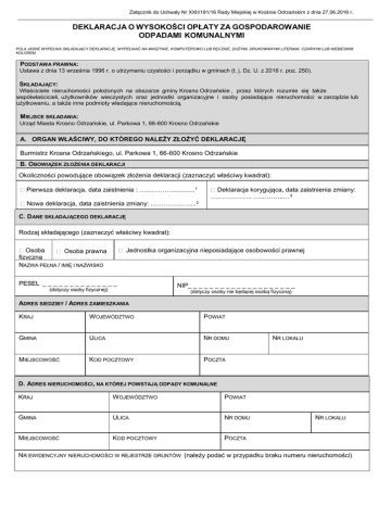 Załącznik do Uchwały Nr XXII/191/16 Rady Miejskiej w Krośnie Odrzańskim z dnia 27.06.2016 r. DEKLARACJA O WYSOKOŚCI OPŁATY ZA GOSPODAROWANIE ODPADAMI KOMUNALNYMI POLA JASNE WYPEŁNIA SKŁADAJĄCY DEKLARACJĘ. WYPEŁNIAĆ NA MASZYNIE, KOMPUTEROWO LUB RĘCZNIE, DUŻYMI, DRUKOWANYMI LITERAMI, CZARNYM LUB NIEBIESKIM KOLOREM PODSTAWA PRAWNA: Ustawa z dnia 13 września 1996 r. o utrzymaniu czystości i porządku w gminach (t. j. Dz. U. z 2016 r. poz. 250). SKŁADAJĄCY: Właściciele nieruchomości położonych na obszarze gminy Krosno Odrzańskie , przez których rozumie się także współwłaścicieli, użytkowników wieczystych oraz jednostki organizacyjne i osoby posiadające nieruchomości w zarządzie lub użytkowaniu, a także inne podmioty władające nieruchomością. MIEJSCE SKŁADANIA: Urząd Miasta Krosno Odrzańskie, ul. Parkowa 1, 66-600 Krosno Odrzańskie A. ORGAN WŁAŚCIWY, DO KTÓREGO NALEŻY ZŁOŻYĆ DEKLARACJĘ Burmistrz Krosna Odrzańskiego, ul. Parkowa 1, 66-600 Krosno Odrzańskie B. OBOWIĄZEK ZŁOŻENIA DEKLARACJI Okoliczności powodujące obowiązek złożenia deklaracji (zaznaczyć właściwy kwadrat): Pierwsza deklaracja, data zaistnienia : …...……….............1 Deklaracja korygująca, data zaistnienia zmiany: ………………. …………..…3 Nowa deklaracja, data zaistnienia zmiany: …………...…....2 C. DANE SKŁADAJĄCEGO DEKLARACJĘ Rodzaj składającego (zaznaczyć właściwy kwadrat): Jednostka organizacyjna nieposiadające osobowości prawnej Osoba Osoba prawna fizyczna NAZWA PEŁNA / IMIĘ I NAZWISKO PESEL _ _ _ _ _ _ _ _ _ _ _ _ _ _ (dotyczy osoby fizycznej) NIP_ _ _ _ _ _ _ _ _ _ _ _ _ _ _ _ _ _ _ _ (dotyczy osoby nie będącej osobą fizyczną) ADRES SIEDZIBY / ADRES ZAMIESZKANIA KRAJ W OJEWÓDZTWO POWIAT GMINA ULICA NR DOMU MIEJSCOWOŚĆ KOD POCZTOWY POCZTA NR LOKALU D. ADRES NIERUCHOMOŚCI, NA KTÓREJ POWSTAJĄ ODPADY KOMUNALNE KRAJ W OJEWÓDZTWO POWIAT GMINA ULICA NR DOMU MIEJSCOWOŚĆ KOD POCZTOWY POCZTA NR LOKALU NR EWIDENCYJNY NIERUCHOMOŚCI W REJESTRZE GRUNTÓW (należy podać w przypadku braku numeru nieruchomości) E. OPŁATA ZA GOSPODAROWANIE ODPADAMI KOMUNALNYMI Oświadczam, że na terenie nieruchomości, na której powstają odpady komunalne, SELEKTYWNY odpady gromadzone będą w sposób (należy zakreślić właściwy kwadrat): NIESELEKTYWNY Liczba mieszkańców zamieszkujących nieruchomość, na której powstają odpady komunalne: ………………………… Wysokość miesięcznej opłaty za gospodarowanie odpadami komunalnymi wynosi (iloczyn liczby mieszkańców i stawki opłaty): …………………………. (należy podać kwotę w zł) F. OŚWIADCZENIE I PODPIS SKŁADAJĄCEGO DEKLARACJĘ/OSOBY REPREZENTUJĄCEJ SKŁADAJĄCEGO DEKLARACJĘ ………………………………………. (data) ………………………………………. (podpis osoby składającej) G. ADNOTACJE ORGANU ………………………………………. (data) Pouczenie Niniejsza deklaracja stanowi podstawę do wystawienia tytułu wykonawczego o postępowaniu egzekucyjnym w administracji (t. j. Dz. U. z 2016 r., poz. 599 ze zm.). ………………………………………. (podpis osoby przyjmującej) zgodnie z przepisami ustawy z dnia 17 czerwca 1966r. Objaśnienia: 1 Właściciel nieruchomości jest obowiązany złożyć po raz pierwszy do Urzędu Miasta w Krośnie Odrzańskim deklarację o wysokości opłaty za gospodarowanie odpadami komunalnymi w terminie 14 dni od dnia zamieszkania na danej nieruchomości pierwszego mieszkańca lub powstania na danej nieruchomości odpadów komunalnych. 2 W przypadku zmiany danych będących podstawą ustalenia wysokości należnej opłaty za gospodarowanie odpadami komunalnymi lub określonej w deklaracji ilości odpadów komunalnych powstających na danej nieruchomości właściciel nieruchomości jest obowiązany złożyć korektę deklaracji w terminie 14 dni od dnia nastąpienia zmiany. 3 W przypadku zmiany danych nie będących podstawą ustalenia należnej opłaty za gospodarowanie odpadami komunalnymi (np. zmiany adresu zamieszkania, nazwiska), właściciel nieruchomości składa w ciągu 14 dni deklarację korygującą (art. 81 § 2 ustawy z dnia 29 sierpnia 1997 r. ordynacja podatkowa). Skorygowanie deklaracji następuje po złożeniu korygującej deklaracji wraz z dołączonym pisemnym uzasadnieniem przyczyny korekty.