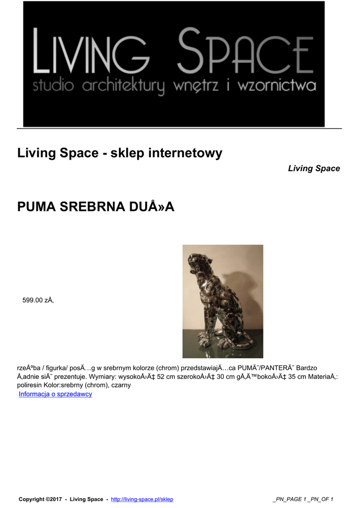 Living Space - sklep internetowy Living Space PUMA SREBRNA DUÅ»A 599.00 zÅ‚ rzeźba / figurka/ posÄ…g w srebrnym kolorze (chrom) przedstawiajÄ…ca PUMĘ/PANTERĘ Bardzo Å‚adnie siĘ prezentuje. Wymiary: wysokość 52 cm szerokość 30 cm głębokość 35 cm MateriaÅ‚: poliresin Kolor:srebrny (chrom), czarny Informacja o sprzedawcy Copyright ©2017 - Living Space - http://living-space.pl/sklep _PN_PAGE 1 _PN_OF 1