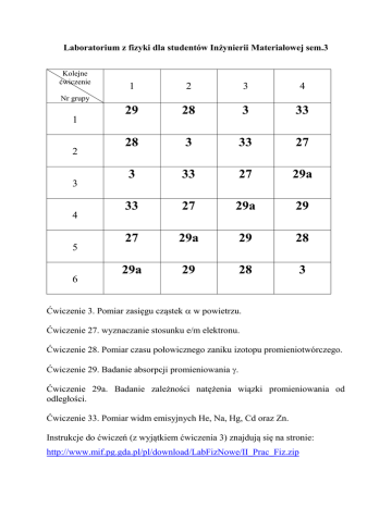 Laboratorium z fizyki dla studentów Inżynierii Materiałowej sem.3 Kolejne ćwiczenie 1 2 3 4 29 28 3 33 28 3 33 27 3 33 27 29a 33 27 29a 29 27 29a 29 28 29a 29 28 3 Nr grupy 1 2 3 4 5 6 Ćwiczenie 3. Pomiar zasięgu cząstek w powietrzu. Ćwiczenie 27. wyznaczanie stosunku e/m elektronu. Ćwiczenie 28. Pomiar czasu połowicznego zaniku izotopu promieniotwórczego. Ćwiczenie 29. Badanie absorpcji promieniowania . Ćwiczenie 29a. Badanie zależności natężenia wiązki promieniowania od odległości. Ćwiczenie 33. Pomiar widm emisyjnych He, Na, Hg, Cd oraz Zn. Instrukcje do ćwiczeń (z wyjątkiem ćwiczenia 3) znajdują się na stronie: http://www.mif.pg.gda.pl/pl/download/LabFizNowe/II_Prac_Fiz.zip Instrukcja ćwiczenia 3 znajduje się w skrypcie „II pracownia fizyczna”, M. Zubek, A. Kuczkowski. 1. Zajęcia laboratoryjne są zajęciami obowiązkowymi. Nie ma dodatkowego terminu na odrabianie zajęć. 2. Aby zaliczyć część laboratoryjną należy zaliczyć cztery (czyli wszystkie) z wykonywanych ćwiczeń. Przed wykonywaniem każdego z ćwiczeń zostanie sprawdzona wiedza teoretyczna. Uzyskanie oceny niedostatecznej powoduje niedopuszczenie do wykonywania ćwiczenia. Należy wówczas w ciągu tygodnia samodzielnie znaleźć termin i odrobić ćwiczenie. 3. Ocena z danego ćwiczenia jest wystawiana na podstawie: znajomości teoretycznej zagadnienia, wykonywania pomiarów, wykonanego sprawozdania. 4. Na zajęcia, na których wykonujemy pomiary i opracowujemy wyniki, koniecznie przynosimy: - papier kancelaryjny z opisem teoretycznym wykonywanego w danym dniu ćwiczenia (od pół do jednej strony A4), - papier milimetrowy, - linijkę, - ołówek, - kalkulator. Wykonanie obliczeń i sprawozdania na komputerze dopuszczalne jest tylko w ćwiczeniu 29. 5. Sprawozdanie ma być zrobione w laboratorium, a nie w domu! Dokończenie sprawozdania w domu obniża ocenę. 6. Przed rozpoczęciem ćwiczeń należy przeczytać rozdział dotyczący określania niepewności pomiarowych, np. "Metodyka wykonywania oraz ocena niepewności i błędów pomiaru" ze skryptu "I laboratorium z fizyki" część 2, J. Dudkiewicz, B. Kusz. Instrukcje do ćwiczeń w większości nie zawierają gotowych wyrażeń na określenie niepewności pomiarowych! 7. Płaszcze i kurtki zostawiamy w szatni! 8. W pomieszczeniu laboratoryjnym niedopuszczalne jest jedzenie, picie, żucie gumy. 9. Ostateczną ocenę z laboratorium należy uzyskać w nieprzekraczalnym terminie jednego tygodnia od chwili zakończenia zajęć. Oceną wpisywaną przez osobę odpowiedzialną za przedmiot jest ocena widniejąca na arkuszu zaliczeń.