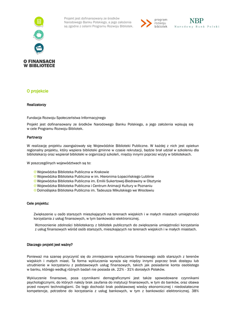 Projekt jest dofinansowany ze środków Narodowego Banku Polskiego, a jego założenia są zgodne z celami Programu Rozwoju Bibliotek. O projekcie Realizatorzy Fundacja Rozwoju Społeczeństwa Informacyjnego Projekt jest dofinansowany ze środków Narodowego Banku Polskiego, a jego założenia wpisują się w cele Programu Rozwoju Bibliotek. Partnerzy W realizację projektu zaangażowały się Wojewódzkie Biblioteki Publiczne. W każdej z nich jest opiekun regionalny projektu, który wspiera biblioteki gminne w czasie rekrutacji, będzie brał udział w szkoleniu dla bibliotekarzy oraz wspierał biblioteki w organizacji szkoleń, między innymi poprzez wizyty w bibliotekach. W poszczególnych województwach są to: Wojewódzka Biblioteka Publiczna w Krakowie Wojewódzka Biblioteka Publiczna w im. Hieronima Łopacińskiego Lublinie Wojewódzka Biblioteka Publiczna im. Emilii Sukertowej-Biedrawiny w Olsztynie Wojewódzka Biblioteka Publiczna i Centrum Animacji Kultury w Poznaniu Dolnośląska Biblioteka Publiczna im. Tadeusza Mikulskiego we Wrocławiu Cele projektu: Zwiększenie u osób starszych mieszkających na terenach wiejskich i w małych miastach umiejętności korzystania z usług finansowych, w tym bankowości elektronicznej. Wzmocnienie zdolności bibliotekarzy z bibliotek publicznych do zwiększania umiejętności korzystania z usług finansowych wśród osób starszych, mieszkających na terenach wiejskich i w małych miastach. Dlaczego projekt jest ważny? Ponieważ ma szansę przyczynić się do zmniejszenia wykluczenia finansowego osób starszych z terenów wiejskich i małych miast. Ta forma wykluczenia wyraża się między innymi poprzez brak dostępu lub utrudnienie w korzystaniu z podstawowych usług finansowych, takich jak posiadanie konta osobistego w banku, którego według różnych badań nie posiada ok. 22% - 31% dorosłych Polaków. Wykluczenie finansowe, poza czynnikami demograficznymi jest także spowodowane czynnikami psychologicznymi, do których należy brak zaufania do instytucji finansowych, w tym do banków, oraz obawa przed nowymi technologiami. Do tego dochodzi brak podstawowej wiedzy ekonomicznej i niedostateczne kompetencje, potrzebne do korzystania z usług bankowych, w tym z bankowości elektronicznej. 38% Polaków powyżej 60 roku życia badanych nie ufa nikomu w kwestii oszczędzania - częściej są to osoby starsze i z gospodarstw o niższych dochodach. Dlaczego biblioteki? Biblioteki mają doświadczenie w przekazywaniu wiedzy i rozwijaniu kompetencji, w tym cyfrowych kompetencji seniorów, oraz są obdarzane przez nich zaufaniem. Biblioteki są postrzegane przez społeczeństwo jako miejsca bezpieczne, nieprowadzące działalności o charakterze komercyjnym, a bibliotekarze jako osoby cieszą się zaufaniem społecznym. Są to cechy z jednej strony deficytowe w polskiej przestrzeni społecznej, z drugiej zaś predestynujące biblioteki i bibliotekarzy do udzielania porad w tak wrażliwych sprawach jak poruszanie się po Internecie, czy tym bardziej korzystanie z usług finansowych. Ponadto bibliotekarze - grupa zawodowa o dość wysokim średnim wieku (ponad 40 lat) łatwo nawiązują kontakt z seniorami. Seniorzy nie mają zaufania do świata wirtualnego, natomiast mają do bibliotek i bibliotekarek/bibliotekarzy. Odbiorcy projektu Osoby dorosłe w wieku 50+ („młodsi seniorzy” i seniorzy), którzy w bibliotekach publicznych (placówki gminne i ich filie) będą uczestniczyć w cyklu 5 spotkań poświęconych wybranym usługom finansowym. Projekt obejmie 55 bibliotek oraz 1100 seniorów - uczestników spotkań w bibliotekach. Województwa zaproszone do projektu: dolnośląskie, lubelskie, małopolskie, wielkopolskie i warmińsko-mazurskie. Działania I. Zapraszanie bibliotek i seniorów Rekrutacja bibliotek do projektu Biblioteki gminne wyłonione zostaną w trybie konkursowym. Konkurs skierowany został do bibliotek gminnych uczestniczących w I rundzie Programu Rozwoju Bibliotek tj. bibliotek z terenów wiejskich i małych miast (do 20 tys. mieszkańców) w 5 województwach. Najważniejsze kryteria oceny zgłoszeń konkursowych to: Doświadczenie biblioteki w edukacji cyfrowej seniorów (obsługa komputera i Internetu); Pomysły na działania dotyczące edukacji ekonomicznej tej grupy; Doświadczenie dwóch osób proponowanych przez bibliotekę do prowadzenia spotkań z seniorami z zakresu edukacji ekonomicznej (min. jedna z nich powinna być bibliotekarzem); Wstępne pomysły na lokalną promocję spotkań, komunikację z seniorami; Gotowość do zrekrutowania uczestników spotkań (każda biblioteka powinna zorganizować spotkania dla min. 20 osób). Rekrutacja seniorów Proces rekrutacji seniorów prowadzony będzie przez biblioteki przy wsparciu opiekunów regionalnych z Wojewódzkich Bibliotek Publicznych oraz koordynatorki FRSI. Na zakończenie projektu uczestnicy otrzymają certyfikaty udziału w cyklu spotkań. II. Szkolenia dla bibliotekarzy W szkoleniach weźmie udział 110 osób (po dwie z każdej biblioteki) podzielonych na 5 grup szkoleniowych. Szkolenia odbędą się w bibliotekach wojewódzkich. W szkoleniu wezmą udział po dwie osoby z każdej biblioteki, w tym co najmniej jeden bibliotekarz/rka. Jedną z dwóch osób może być, na przykład, ktoś spoza biblioteki współpracujący z nią i posiadający np. kompetencje związane z prowadzeniem szkoleń. Szkolenie będzie oparte na metodach aktywizujących (warsztatowych). Uczestnicy przećwiczą w praktyce realizację scenariuszy i korzystanie z kursów e-learningowych. Po zakończeniu szkolenia uczestnicy będą utrzymywać kontakt on-line wymieniając się doświadczeniami i pomagając sobie nawzajem. Ponadto trenerzy, występując w roli konsultantów, utrzymywać będą kontakt on-line / telefoniczny z wszystkimi bibliotekami, pomagając im przygotować pierwsze spotkanie z seniorami oraz dokładny plan kolejnych spotkań (zakładamy dwa dni wsparcia na bibliotek