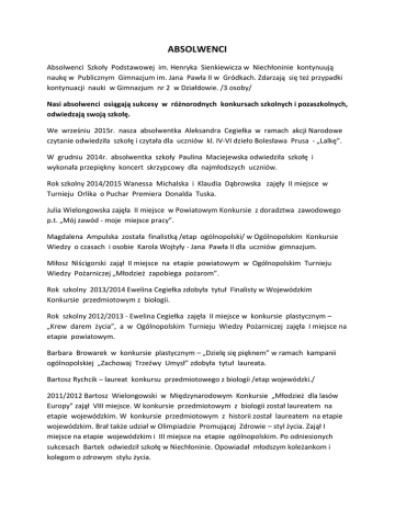 ABSOLWENCI Absolwenci Szkoły Podstawowej im. Henryka Sienkiewicza w Niechłoninie kontynuują naukę w Publicznym Gimnazjum im. Jana Pawła II w Gródkach. Zdarzają się też przypadki kontynuacji nauki w Gimnazjum nr 2 w Działdowie. /3 osoby/ Nasi absolwenci osiągają sukcesy w różnorodnych konkursach szkolnych i pozaszkolnych, odwiedzają swoją szkołę. We wrześniu 2015r. nasza absolwentka Aleksandra Cegiełka w ramach akcji Narodowe czytanie odwiedziła szkołę i czytała dla uczniów kl. IV-VI dzieło Bolesława Prusa - „Lalkę”. W grudniu 2014r. absolwentka szkoły Paulina Maciejewska odwiedziła szkołę i wykonała przepiękny koncert skrzypcowy dla najmłodszych uczniów. Rok szkolny 2014/2015 Wanessa Michalska i Klaudia Dąbrowska zajęły II miejsce w Turnieju Orlika o Puchar Premiera Donalda Tuska. Julia Wielongowska zajęła II miejsce w Powiatowym Konkursie z doradztwa zawodowego p.t. „Mój zawód - moje miejsce pracy”. Magdalena Ampulska została finalistką /etap ogólnopolski/ w Ogólnopolskim Konkursie Wiedzy o czasach i osobie Karola Wojtyły - Jana Pawła II dla uczniów gimnazjum. Miłosz Niścigorski zajął II miejsce na etapie powiatowym w Ogólnopolskim Turnieju Wiedzy Pożarniczej „Młodzież zapobiega pożarom”. Rok szkolny 2013/2014 Ewelina Cegiełka zdobyła tytuł Finalisty w Wojewódzkim Konkursie przedmiotowym z biologii. Rok szkolny 2012/2013 - Ewelina Cegiełka zajęła II miejsce w konkursie plastycznym – „Krew darem życia”, a w Ogólnopolskim Turnieju Wiedzy Pożarniczej zajęła I miejsce na etapie powiatowym. Barbara Browarek w konkursie plastycznym – „Dzielę się pięknem” w ramach kampanii ogólnopolskiej „Zachowaj Trzeźwy Umysł” zdobyła tytuł laureata. Bartosz Rychcik – laureat konkursu przedmiotowego z biologii /etap wojewódzki./ 2011/2012 Bartosz Wielongowski w Międzynarodowym Konkursie „Młodzież dla lasów Europy” zajął VIII miejsce. W konkursie przedmiotowym z biologii został laureatem na etapie wojewódzkim. W konkursie przedmiotowym z historii został laureatem na etapie wojewódzkim. Brał także udział w Olimpiadzie Promującej Zdrowie – styl życia. Zajął I miejsce na etapie wojewódzkim i III miejsce na etapie ogólnopolskim. Po odniesionych sukcesach Bartek odwiedził szkołę w Niechłoninie. Opowiadał młodszym koleżankom i kolegom o zdrowym stylu życia.