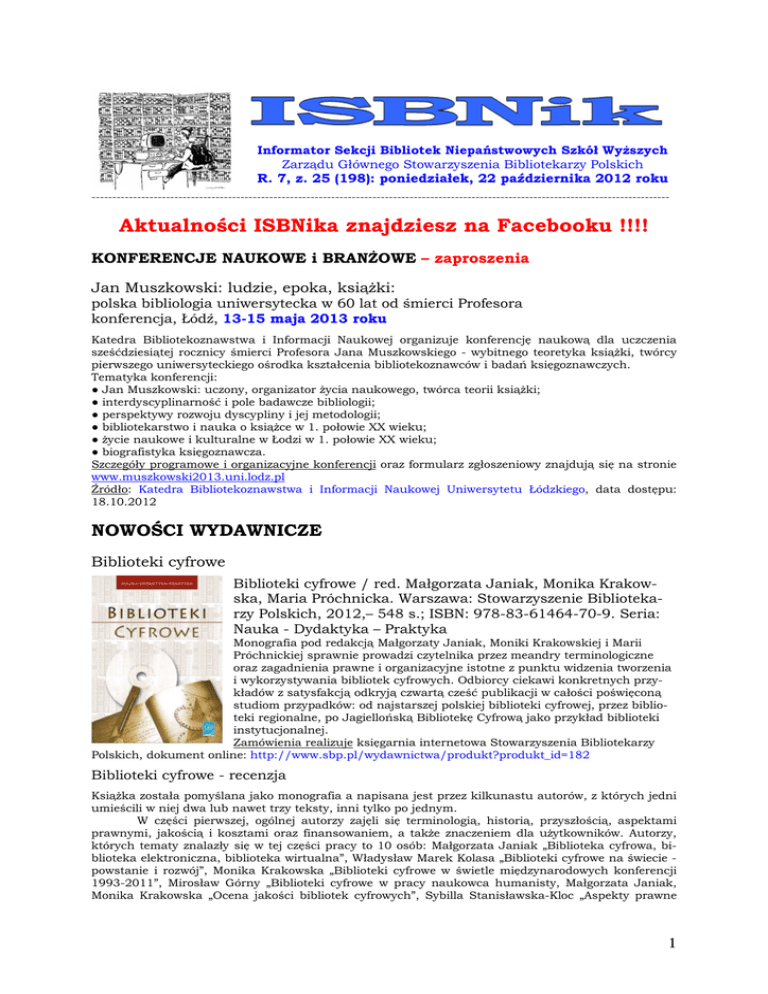 Informator Sekcji Bibliotek Niepaństwowych Szkół Wyższych Zarządu Głównego Stowarzyszenia Bibliotekarzy Polskich R. 7, z. 25 (198): poniedziałek, 22 października 2012 roku -------------------------------------------------------------------------------------------------------------------------------------------- Aktualności ISBNika znajdziesz na Facebooku !!!! KONFERENCJE NAUKOWE i BRANŻOWE – zaproszenia Jan Muszkowski: ludzie, epoka, książki: polska bibliologia uniwersytecka w 60 lat od śmierci Profesora konferencja, Łódź, 13-15 maja 2013 roku Katedra Bibliotekoznawstwa i Informacji Naukowej organizuje konferencję naukową dla uczczenia sześćdziesiątej rocznicy śmierci Profesora Jana Muszkowskiego - wybitnego teoretyka książki, twórcy pierwszego uniwersyteckiego ośrodka kształcenia bibliotekoznawców i badań księgoznawczych. Tematyka konferencji: ● Jan Muszkowski: uczony, organizator życia naukowego, twórca teorii książki; ● interdyscyplinarność i pole badawcze bibliologii; ● perspektywy rozwoju dyscypliny i jej metodologii; ● bibliotekarstwo i nauka o książce w 1. połowie XX wieku; ● życie naukowe i kulturalne w Łodzi w 1. połowie XX wieku; ● biografistyka księgoznawcza. Szczegóły programowe i organizacyjne konferencji oraz formularz zgłoszeniowy znajdują się na stronie www.muszkowski2013.uni.lodz.pl Źródło: Katedra Bibliotekoznawstwa i Informacji Naukowej Uniwersytetu Łódzkiego, data dostępu: 18.10.2012 NOWOŚCI WYDAWNICZE Biblioteki cyfrowe Biblioteki cyfrowe / red. Małgorzata Janiak, Monika Krakowska, Maria Próchnicka. Warszawa: Stowarzyszenie Bibliotekarzy Polskich, 2012,– 548 s.; ISBN: 978-83-61464-70-9. Seria: Nauka - Dydaktyka – Praktyka Monografia pod redakcją Małgorzaty Janiak, Moniki Krakowskiej i Marii Próchnickiej sprawnie prowadzi czytelnika przez meandry terminologiczne oraz zagadnienia prawne i organizacyjne istotne z punktu widzenia tworzenia i wykorzystywania bibliotek cyfrowych. Odbiorcy ciekawi konkretnych przykładów z satysfakcją odkryją czwartą cześć publikacji w całości poświęconą studiom przypadków: od najstarszej polskiej biblioteki cyfrowej, przez biblioteki regionalne, po Jagiellońską Bibliotekę Cyfrową jako przykład biblioteki instytucjonalnej. Zamówienia realizuje księgarnia internetowa Stowarzyszenia Bibliotekarzy Polskich, dokument online: http://www.sbp.pl/wydawnictwa/produkt?produkt_id=182 Biblioteki cyfrowe - recenzja Książka została pomyślana jako monografia a napisana jest przez kilkunastu autorów, z których jedni umieścili w niej dwa lub nawet trzy teksty, inni tylko po jednym. W części pierwszej, ogólnej autorzy zajęli się terminologią, historią, przyszłością, aspektami prawnymi, jakością i kosztami oraz finansowaniem, a także znaczeniem dla użytkowników. Autorzy, których tematy znalazły się w tej części pracy to 10 osób: Małgorzata Janiak „Biblioteka cyfrowa, biblioteka elektroniczna, biblioteka wirtualna”, Władysław Marek Kolasa „Biblioteki cyfrowe na świecie powstanie i rozwój”, Monika Krakowska „Biblioteki cyfrowe w świetle międzynarodowych konferencji 1993-2011”, Mirosław Górny „Biblioteki cyfrowe w pracy naukowca humanisty, Małgorzata Janiak, Monika Krakowska „Ocena jakości bibliotek cyfrowych”, Sybilla Stanisławska-Kloc „Aspekty prawne 1 bibliotek cyfrowych”, Małgorzata Kowalska „Koszty i finansowanie bibliotek cyfrowych”, Małgorzata Janiak „Zagadnienia estetyczne a biblioteki cyfrowe”, Bożena-Bednarek-Michalska „Standardy”, Magdalena Wójcik „Literatura na temat bibliotek cyfrowych – analiza bibliometryczna”. W części drugiej, zatytułowanej „Ludzie”, są trzy opracowania. W tym: Jolanta Mazurek „Użytkownicy polskich bibliotek cyfrowych”, Monika Krakowska „Modele mentalne użytkowników bibliotek cyfrowych”; Łukasz Mesek „Model kompetencji zawodowych bibliotekarza cyfrowego”. W części trzeciej, poświęconej zasobom i procesom, takim, jak: oprogramowanie, tworzenie bibliotek cyfrowych w tym gromadzenie, opracowanie wyszukiwanie i udostępnianie” znalazło się czterech autorów. W tym: Cezary Mazurek, Tomasz Parkoła, Marcin Werla „Tworzenie i rozwój bibliotek cyfrowych”; Łukasz Mesek, Marek Nahotko, Piotr Myszkowski, Danuta Patkaniowska „Opisy formalny i rzeczowy dokumentów w bibliotekach cyfrowych” (w podziale: Marek Nahotko „Struktury danych”; Piotr Myszkowski „Metadane w polskich bibliotekach cyfrowych”; Marek Nahotko „Odwzorowanie treści dokumentów elektronicznych”; Danuta Patkaniowska „Opracowanie rzeczowe dokumentu”; Łukasz Mesek „Korelacje między opisami w katalogach bibliotecznych i bibliotekach cyfrowych”); Władysław Marek Kolasa „Formaty dokumentów w bibliotekach cyfrowych”; Bartłomiej Siedlarz „DjVu”; Tomasz Kalota, Marcin Szala „Organizacja i logistyka digitalizacji”. W części czwartej omówiono przede wszystkim przykłady polskich bibliotek cyfrowych. Jest to siedem bibliotek, bieżąco tworzonych, które zostały opisane jako studia przypadku. Relacjonowali autorzy, przede wszystkim tacy, którzy uczestniczyli w tworzeniu tych placówek. Są to: Cezary Mazurek i Marcin Werla „Federacja Bibliotek Cyfrowych – studium przypadku”; Ewa Wichlińska „Wielkopolska Biblioteka Cyfrowa- analiza przypadku”; Joanna Potęga „Cyfrowa Biblioteka Narodowa Polona (cBN Polona)”; Bożena Bednarek-Michalska „Kujawsko–Pomorska Biblioteka Cyfrowa – studium przypadku”; Władysław Marek Kolasa, Wojciech Kowalewski „Małopolska Biblioteka Cyfrowa – regionalne repozytorium wiedzy”; Remigiusz Lis „Śląska Biblioteka Cyfrowa - analiza przypadku”; Łukasz Mesek „Biblioteka Jagiellońska – opis przypadku”. Jak widać z tytułów poszczególnych opracowań starano się, aby w pełni opisać i zająć się wszystkimi zagadnieniami, które są związane z tworzeniem i fu
