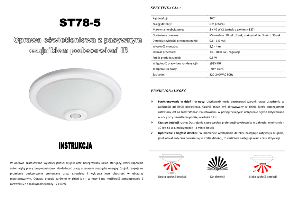 SPECYFIKACJA : Kąt detekcji: 360° Zasięg detekcji: 6 m (<24℃) Maksymalne obciążenie: 2 x 40 W (2 żarówki z gwintem E27) Opóźnienie czasowe: Minimalnie: 10 sek ±3 sek, maksymalnie: 3 min ± 30 sek Detekcja szybkości przemieszczania: 0.6 - 1.5 m/s Wysokość montażu: 2,2 - 4 m Jasność otoczenia: ≤3 – 2000 lux - regulacja Pobór prądu (czujnik): 0.5 W Wilgotność pracy (bez kondensacji): ≤93% RH Temperatura pracy: -20 ~ +40℃ Zasilanie: 220-240V/AC 50Hz FUNKCJONALNOŚĆ Funkcjonowanie w dzień i w nocy: Użytkownik może dostosować warunki pracy urządzenia w zależności od ilości oświetlenia. Czujnik może być aktywowany w dzień, kiedy potencjometr ustawiony jest na znak “słońca”. Po ustawieniu w pozycji “księżyca” urządzenie będzie aktywowane w nocy przy oświetleniu poniżej wartości 3 lux. Czas po detekcji ruchu: Dostrajanie czasu według preferencji użytkownika w zakresie: minimalnie 10 sek ±3 sek, maksymalnie - 3 min ± 30 sek Opóźnienie i ciągłość detekcji: W momencie wystąpienia detekcji następuje aktywacja czujnika, jeżeli obiekt cały czas porusza się w strefie detekcji, to cyklicznie następuje reset czasu aktywacji. W oprawie zastosowano wysokiej jakości czujnik oraz zintegrowany układ sterujący, który zapewnia automatykę pracy, bezpieczeństwo i dokładność pracy, a zarazem oszczędza energię. Czujnik reaguje na promienie podczerwone emitowane przez człowieka i wykrywa jego obecność w obszarze monitorowanym. Oprawa pracuje zarówno w dzień jak i w nocy i ma możliwość zamontowania 2 żarówek E27 o maksymalnej mocy - 2 x 40W. Dobra czułość detekcji Kąt detekcji Słaba czułość detekcji INSTALACJA: TESTOWANIE: UWAGA: Istnieje zagrożenie życia przez porażenie elektryczne! Przekręć pokrętło czasu “TIME” na minimum (-), a pozycje LUX do znacznika “słońca”. Instalacji urządzenia musi dokonać instalator z uprawnieniami SEP do 1kV Odłącz prąd i sprawdź czy prąd jest odłączony rozruch trwa do maksymalnie 30 sekund. Po rozruchu lampa Oddziel lub przykryj wszystkie elementy, które mogą się zewrzeć. powinna się zaświecić. Upewnij się, że podczas instalacji nie będzie możliwości włączenia - Wywołaj ruch; po wykryciu ruchu lampa powinna się zaświecić. Przy braku detekcji ruchu lampa urządzenia i prądu. powinna zgasnąć w przeciągu 10 – 13 sekund. Odkręć klosz, przekręcając pierścień (rys. 1), znajdź przygotowany otwór na kabel i przeciągnij tam Włącz zasilanie. Lampa nie będzie działać od razu, ponieważ Przekręć pokrętło LUX do znacznika “księżyc”. Jeżeli światło otoczenia będzie większe niż wartość 3 lux to lampa nie będzie się załączać przy wykryciu ruchu. zasilanie Przykręć obudowę do sufitu (rys. 2), wkręć żarówki (rys. 3) Podłącz zasilanie do listwy elektrycznej wg. opisu jak na rysunku nr.3 Przykręć obudowę, załącz urządzenie i przetestuj. Rysunek nr. 1 Rysunek nr. 4 Podłaczenie zasilania AC 230V (N) BLUE – Przewód niebieski (neutralny) (L) BROWN – Przewód brązowy (faza) Rysunek nr. 2 UWAGI: Jeżeli testujesz urządzenie w ciągu dnia, to ustaw pokrętło “LUX” po pozycji znacznika “słońce”. Rysunek nr. 3