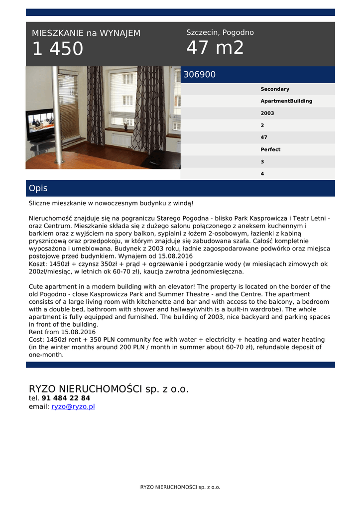 MIESZKANIE na WYNAJEM 1 450 Szczecin, Pogodno 47 m2 306900 Secondary ApartmentBuilding 2003 2 47 Perfect 3 4 Opis Śliczne mieszkanie w nowoczesnym budynku z windą! Nieruchomość znajduje się na pograniczu Starego Pogodna - blisko Park Kasprowicza i Teatr Letni oraz Centrum. Mieszkanie składa się z dużego salonu połączonego z aneksem kuchennym i barkiem oraz z wyjściem na spory balkon, sypialni z łożem 2-osobowym, łazienki z kabiną prysznicową oraz przedpokoju, w którym znajduje się zabudowana szafa. Całość kompletnie wyposażona i umeblowana. Budynek z 2003 roku, ładnie zagospodarowane podwórko oraz miejsca postojowe przed budynkiem. Wynajem od 15.08.2016 Koszt: 1450zł + czynsz 350zł + prąd + ogrzewanie i podgrzanie wody (w miesiącach zimowych ok 200zł/miesiąc, w letnich ok 60-70 zł), kaucja zwrotna jednomiesięczna. Cute apartment in a modern building with an elevator! The property is located on the border of the old Pogodno - close Kasprowicza Park and Summer Theatre - and the Centre. The apartment consists of a large living room with kitchenette and bar and with access to the balcony, a bedroom with a double bed, bathroom with shower and hallway(whith is a built-in wardrobe). The whole apartment is fully equipped and furnished. The building of 2003, nice backyard and parking spaces in front of the building. Rent from 15.08.2016 Cost: 1450zł rent + 350 PLN community fee with water + electricity + heating and water heating (in the winter months around 200 PLN / month in summer about 60-70 zł), refundable deposit of one-month. RYZO NIERUCHOMOŚCI sp. z o.o. tel. 91 484 22 84 email: [email protected] RYZO NIERUCHOMOŚCI sp. z o.o. Powered by TCPDF (www.tcpdf.org)