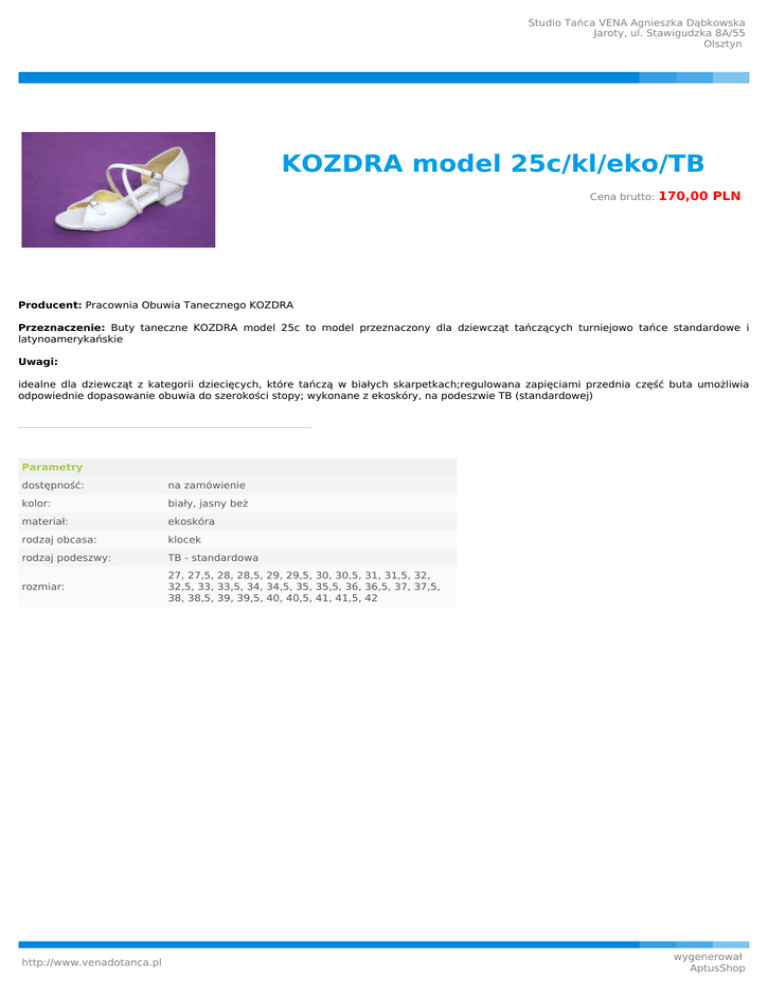 Studio Tańca VENA Agnieszka Dąbkowska Jaroty, ul. Stawigudzka 8A/55 Olsztyn KOZDRA model 25c/kl/eko/TB Cena brutto: 170,00 PLN Producent: Pracownia Obuwia Tanecznego KOZDRA Przeznaczenie: Buty taneczne KOZDRA model 25c to model przeznaczony dla dziewcząt tańczących turniejowo tańce standardowe i latynoamerykańskie Uwagi: idealne dla dziewcząt z kategorii dziecięcych, które tańczą w białych skarpetkach;regulowana zapięciami przednia część buta umożliwia odpowiednie dopasowanie obuwia do szerokości stopy; wykonane z ekoskóry, na podeszwie TB (standardowej) Parametry dostępność: na zamówienie kolor: biały, jasny beż materiał: ekoskóra rodzaj obcasa: klocek rodzaj podeszwy: TB - standardowa rozmiar: 27, 27,5, 28, 28,5, 29, 29,5, 30, 30,5, 31, 31,5, 32, 32,5, 33, 33,5, 34, 34,5, 35, 35,5, 36, 36,5, 37, 37,5, 38, 38,5, 39, 39,5, 40, 40,5, 41, 41,5, 42 http://www.venadotanca.pl wygenerował AptusShop