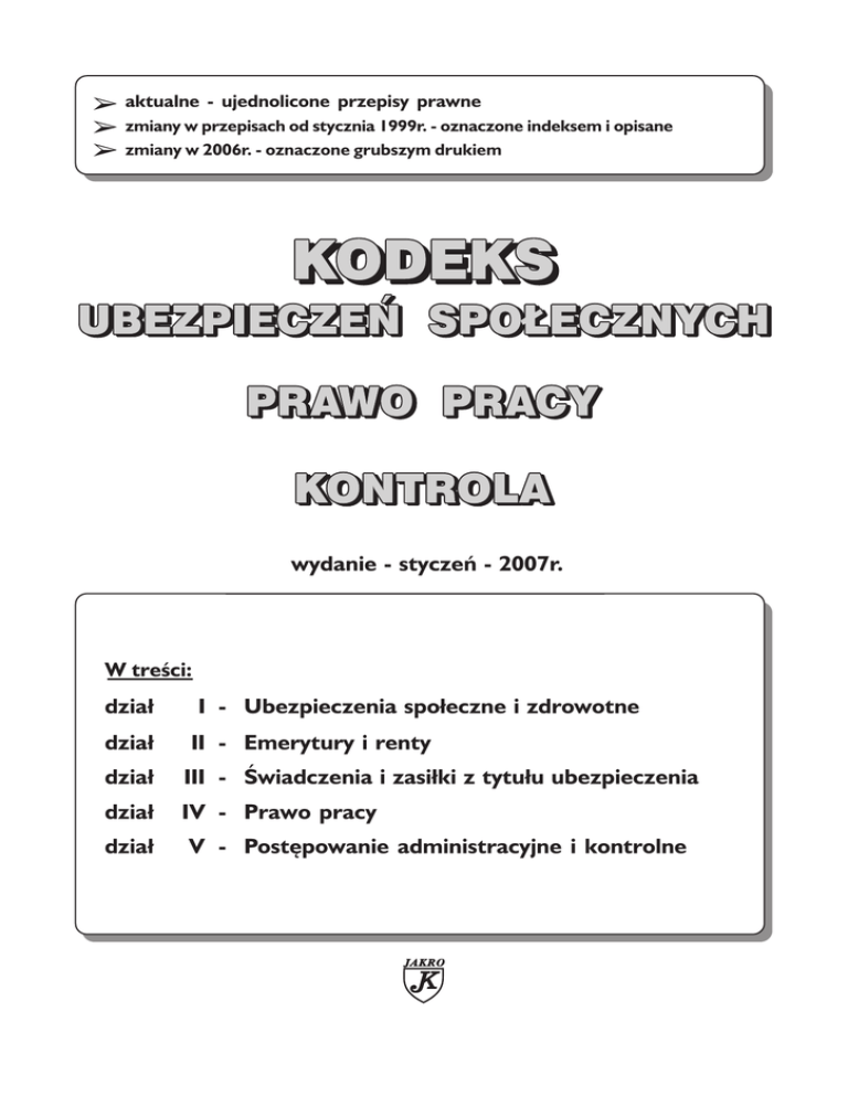 aktualne - ujednolicone przepisy prawne zmiany w przepisach od stycznia 1999r. - oznaczone indeksem i opisane zmiany w 2006r. - oznaczone grubszym drukiem wydanie - styczeń - 2007r. W treści: dział dział I - Ubezpieczenia społeczne i zdrowotne II - Emerytury i renty dział III - Świadczenia i zasiłki z tytułu ubezpieczenia dział IV - Prawo pracy dział V - Postępowanie administracyjne i kontrolne UBEZPIECZENIA SPOŁECZNE I ZDROWOTNE str. § I stan prawny - styczeń 2007r. 1 - USTAWA o systemie ubezpieczeń społecznych 41 - USTAWA o świadczeniach opieki zdrowotnej finansowanych ze środków publicznych 97 - USTAWA o ochronie roszczeń pracowniczych w razie niewypłacalności pracodawcy 108 - ROZPORZĄDZENIE RADY MINISTRÓW w sprawie szczegółowych zasad i trybu postępowania w sprawach rozliczania składek, wypłaconych zasiłków z ubezpieczeń chorobowego i wypadkowego, zasiłków rodzinnych, pielęgnacyjnych i wychowawczych oraz kolejności zaliczania wpłat składek na poszczególne fundusze 115 - ROZPORZĄDZENIE RADY MINISTRÓW w sprawie odrębnego sposobu ubezpieczania ze względu na wymogi obronności lub bezpieczeństwa państwa 116 - ROZPORZĄDZENIE RADY MINISTRÓW w sprawie określenia osób, wobec których nie stosuje się przepisów ustawy o systemie ubezpieczeń społecznych 116 - ROZPORZĄDZENIE RADY MINISTRÓW w sprawie terminów, zakresu i trybu weryfikacji danych ubezpieczonych oraz sposobu postępowania Zakładu Ubezpieczeń Społecznych i Kasy Rolniczego Ubezpieczenia Społecznego w razie stwierdzenia ich niezgodności 117 - ROZPORZĄDZENIE RADY MINISTRÓW w sprawie sposobu i trybu finansowania kosztów badań, wydawania orzeczeń lub zaświadczeń związanych z orzekaniem o niezdolności do pracy dla celów rentowych, orzekaniem o niepełnosprawności, ustalaniem uprawnień w ramach ubezpieczeń społecznych 118 - ROZPORZĄDZENIE MINISTRA PRACY I POLITYKI SOCJALNEJ w sprawie wysokości i trybu wypłaty wynagrodzenia płatnikom składek z tytułu wykonywania zadań z ubezpieczenia społecznego w razie choroby i macierzyństwa 118 - ROZPORZĄDZENIE MINISTRA PRACY I POLITYKI SOCJALNEJ w sprawie szczegółowych zasad wypłacania odsetek za opóźnienie w ustaleniu lub wypłacie świadczeń z ubezpieczeń społecznych 119 - ROZPORZĄDZENIE MINISTRA PRACY I POLITYKI SOCJALNEJ w sprawie szczegółowych zasad oraz trybu rozliczania składek na ubezpieczenia społeczne z uwzględnieniem dotacji Państwowego Funduszu Rehabilitacji Osób Niepełnosprawnych i budżetu państwa 120 - ROZPORZĄDZENIE MINISTRA PRACY I POLITYKI SOCJALNEJ w sprawie określenia wzorów zgłoszeń do ubezpieczeń społecznych i ubezpieczenia zdrowotnego, imiennych raportów miesięcznych i imiennych raportów miesięcznych korygujących, zgłoszeń płatnika, deklaracji rozliczeniowych i deklaracji rozliczeniowych korygujących oraz innych dokumentów VERTE 121 - ROZPORZĄDZENIE MINISTRA PRACY I POLITYKI SOCJALNEJ w sprawie szczegółowych zasad ustalania podstawy wymiaru składek na ubezpieczenia emerytalne i rentowe 125 - ROZPORZĄDZENIE MINISTRA PRACY I POLITYKI SPOŁECZNEJ w sprawie szczegółowych zasad finansowania wydatków z Funduszu Pracy oraz sposobu współpracy organów zatrudnienia z bankami i instytucjami finansującymi 126 - ROZPORZĄDZENIE MINISTRA PRACY I POLITYKI SOCJALNEJ w sprawie trybu opłacania składek na Fundusz Pracy przez osoby podlegające ubezpieczeniu społecznemu lub zaopatrzeniu emerytalnemu § 126 - ROZPORZĄDZENIE MINISTRA PRACY I POLITYKI SPOŁECZNEJ w sprawie trybu i szczegółowych zasad zwrotu składek na ubezpieczenie rentowe i wypadkowe z tytułu zatrudnienia absolwenta 127 - ROZPORZĄDZENIE MINISTRA GOSPODARKI I PRACY w sprawie wykazów i wniosków o wypłatę świadczeń z Funduszu Gwarantowanych Świadczeń Pracowniczych 129 - ROZPORZĄDZENIE MINISTRA GOSPODARKI, PRACY I POLITYKI SPOŁECZNEJ w sprawie szczegółowych zasad umarzania należności z tytułu składek na ubezpieczenia społeczne 130 - ROZPORZĄDZENIE MINISTRA PRACY I POLITYKI SOCJALNEJ w sprawie szczegółowego zakresu danych zawartych w centralnych rejestrach prowadzonych przez Zakład Ubezpieczeń Społecznych 131 - ROZPORZĄDZENIE MINISTRA PRACY I POLITYKI SPOŁECZNEJ w sprawie warunków, jakie muszą spełnić płatnicy składek przekazujący dokumenty ubezpieczeniowe w formie dokumentu elektronicznego poprzez teletransmisję danych 133 - ROZPORZĄDZENIE MINISTRA SPRAW WEWNĘTRZNYCH I ADMINISTRACJI w sprawie przekazywania do Zakładu Ubezpieczeń Społecznych składek na ubezpieczenia emerytalne i rentowe żołnierzy zawodowych pełniących służbę w jednostkach podległych ministrowi właściwemu do spraw wewnętrznych zwolnionych ze służby 134 - ROZPORZĄDZENIE MINISTRA FINANSÓW w sprawie wzoru bankowego dokumentu płatniczego należności z tytułu składek, do których poboru zobowiązany jest Zakład Ubezpieczeń Społecznych 134 - ROZPORZĄDZENIE MINISTRA GOSPODARKI I PRACY w sprawie trybu dokonywania wpłat składek na Fundusz Pracy przez obywateli polskich zatrudnionych u pracodawców zagranicznych za granicą lub wykonujących inną pracę zarobkową za granicą 135 - ROZPORZĄDZENIE MINISTRA POLITYKI SPOŁECZNEJ w sprawie zwrotu kosztów przejazdu osób wezwanych do osobistego stawiennictwa przez Zakład Ubezpieczeń Społecznych 136 - ROZPORZĄDZENIE MINISTRA PRACY I POLITYKI SPOŁECZNEJ w sprawie różnicowania stopy procentowej składki na ubezpieczenie społeczne z tytułu wypadków przy pracy i chorób zawodowych w zależności od zagrożeń zawodowych i ich skutków 138 - ROZPORZĄDZENIE MINISTRA PRACY I POLITYKI SPOŁECZNEJ w sprawie opłacania składek na Fundusz Pracy przez osoby podejmujące zatrudnienie lub inną pracę zarobkową za granicą u pracodawcy zagranicznego EMERYTURY I RENTY str. § II stan prawny - styczeń 2007r. 1 - USTAWA o emeryturach i rentach z Funduszu Ubezpieczeń Społecznych 38 - USTAWA o rencie socjalnej 42 - USTAWA o dodatku pienię