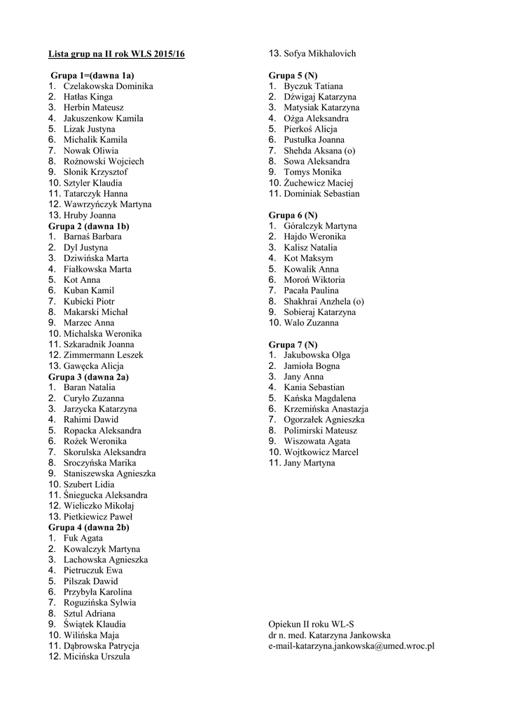 Lista grup na II rok WLS 2015/16 13. Sofya Mikhalovich Grupa 1=(dawna 1a) 1. Czelakowska Dominika 2. Hatłas Kinga 3. Herbin Mateusz 4. Jakuszenkow Kamila 5. Lizak Justyna 6. Michalik Kamila 7. Nowak Oliwia 8. Rożnowski Wojciech 9. Słonik Krzysztof 10. Sztyler Klaudia 11. Tatarczyk Hanna 12. Wawrzyńczyk Martyna 13. Hruby Joanna Grupa 2 (dawna 1b) 1. Barnaś Barbara 2. Dyl Justyna 3. Dziwińska Marta 4. Fiałkowska Marta 5. Kot Anna 6. Kuban Kamil 7. Kubicki Piotr 8. Makarski Michał 9. Marzec Anna 10. Michalska Weronika 11. Szkaradnik Joanna 12. Zimmermann Leszek 13. Gawęcka Alicja Grupa 3 (dawna 2a) 1. Baran Natalia 2. Curyło Zuzanna 3. Jarzycka Katarzyna 4. Rahimi Dawid 5. Ropacka Aleksandra 6. Rożek Weronika 7. Skorulska Aleksandra 8. Sroczyńska Marika 9. Staniszewska Agnieszka 10. Szubert Lidia 11. Śniegucka Aleksandra 12. Wieliczko Mikołaj 13. Pietkiewicz Paweł Grupa 4 (dawna 2b) 1. Fuk Agata 2. Kowalczyk Martyna 3. Lachowska Agnieszka 4. Pietruczuk Ewa 5. Pilszak Dawid 6. Przybyła Karolina 7. Roguzińska Sylwia 8. Sztul Adriana 9. Świątek Klaudia 10. Wilińska Maja 11. Dąbrowska Patrycja 12. Micińska Urszula Grupa 5 (N) 1. Byczuk Tatiana 2. Dźwigaj Katarzyna 3. Matysiak Katarzyna 4. Ożga Aleksandra 5. Pierkoś Alicja 6. Pustułka Joanna 7. Shehda Aksana (o) 8. Sowa Aleksandra 9. Tomys Monika 10. Żuchewicz Maciej 11. Dominiak Sebastian Grupa 6 (N) 1. Góralczyk Martyna 2. Hajdo Weronika 3. Kalisz Natalia 4. Kot Maksym 5. Kowalik Anna 6. Moroń Wiktoria 7. Pacała Paulina 8. Shakhrai Anzhela (o) 9. Sobieraj Katarzyna 10. Walo Zuzanna Grupa 7 (N) 1. Jakubowska Olga 2. Jamioła Bogna 3. Jany Anna 4. Kania Sebastian 5. Kańska Magdalena 6. Krzemińska Anastazja 7. Ogorzałek Agnieszka 8. Polimirski Mateusz 9. Wiszowata Agata 10. Wojtkowicz Marcel 11. Jany Martyna Opiekun II roku WL-S dr n. med. Katarzyna Jankowska [email protected]