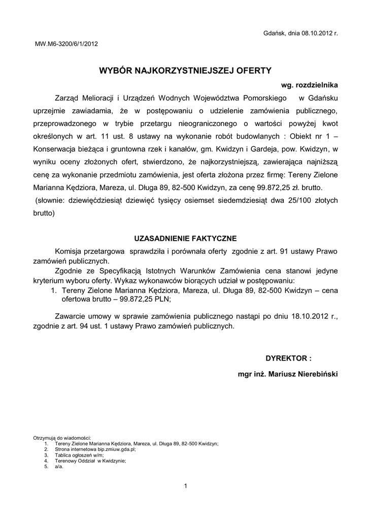Gdańsk, dnia 08.10.2012 r. MW.M6-3200/6/1/2012 WYBÓR NAJKORZYSTNIEJSZEJ OFERTY wg. rozdzielnika Zarząd Melioracji i Urządzeń Wodnych Województwa Pomorskiego w Gdańsku uprzejmie zawiadamia, że w postępowaniu o udzielenie zamówienia publicznego, przeprowadzonego w trybie przetargu nieograniczonego o wartości powyżej kwot określonych w art. 11 ust. 8 ustawy na wykonanie robót budowlanych : Obiekt nr 1 – Konserwacja bieżąca i gruntowna rzek i kanałów, gm. Kwidzyn i Gardeja, pow. Kwidzyn, w wyniku oceny złożonych ofert, stwierdzono, że najkorzystniejszą, zawierająca najniższą cenę za wykonanie przedmiotu zamówienia, jest oferta złożona przez firmę: Tereny Zielone Marianna Kędziora, Mareza, ul. Długa 89, 82-500 Kwidzyn, za cenę 99.872,25 zł. brutto. (słownie: dziewięćdziesiąt dziewięć tysięcy osiemset siedemdziesiąt dwa 25/100 złotych brutto) UZASADNIENIE FAKTYCZNE Komisja przetargowa sprawdziła i porównała oferty zgodnie z art. 91 ustawy Prawo zamówień publicznych. Zgodnie ze Specyfikacją Istotnych Warunków Zamówienia cena stanowi jedyne kryterium wyboru oferty. Wykaz wykonawców biorących udział w postępowaniu: 1. Tereny Zielone Marianna Kędziora, Mareza, ul. Długa 89, 82-500 Kwidzyn – cena ofertowa brutto – 99.872,25 PLN; Zawarcie umowy w sprawie zamówienia publicznego nastąpi po dniu 18.10.2012 r., zgodnie z art. 94 ust. 1 ustawy Prawo zamówień publicznych. DYREKTOR : mgr inż. Mariusz Nierebiński Otrzymują do wiadomości: 1. Tereny Zielone Marianna Kędziora, Mareza, ul. Długa 89, 82-500 Kwidzyn; 2. Strona internetowa bip.zmiuw.gda.pl; 3. Tablica ogłoszeń w/m; 4. Terenowy Oddział w Kwidzynie; 5. a/a. 1 Gdańsk, dnia 08.10.2012 r. MW.M6-3200/6/2/2012 WYBÓR NAJKORZYSTNIEJSZEJ OFERTY wg. rozdzielnika Zarząd Melioracji i Urządzeń Wodnych Województwa Pomorskiego w Gdańsku uprzejmie zawiadamia, że w postępowaniu o udzielenie zamówienia publicznego, przeprowadzonego w trybie przetargu nieograniczonego o wartości powyżej kwot określonych w art. 11 ust. 8 ustawy na wykonanie robót budowlanych: Obiekt nr 2 – Konserwacja bieżąca i gruntowna rzek i kanałów gm. Kwidzyn, Prabuty, Gardeja i Sadlinki, pow. Kwidzyn, w wyniku oceny złożonych ofert, stwierdzono, że najkorzystniejszą, zawierająca najniższą cenę za wykonanie przedmiotu zamówienia, jest oferta złożona przez firmę: Tereny Zielone Marianna Kędziora, Mareza, ul. Długa 89, 82-500 Kwidzyn, za cenę 107.403,10 zł. brutto. (słownie: sto siedem tysięcy czterysta trzy 10/100 złotych brutto) UZASADNIENIE FAKTYCZNE Komisja przetargowa sprawdziła i porównała oferty zgodnie z art. 91 ustawy Prawo zamówień publicznych. Zgodnie ze Specyfikacją Istotnych Warunków Zamówienia cena stanowi jedyne kryterium wyboru oferty. Wykaz wykonawców biorących udział w postępowaniu: 1. Tereny Zielone Marianna Kędziora, Mareza, ul. Długa 89, 82-500 Kwidzyn – cena ofertowa brutto – 107.403,10 PLN; 2. MELO-DREN Zbigniew Więcek, Czerwona Woda 6, 14-240 Susz – cena ofertowa brutto – 116.390,67 PLN; 3. Usługi Melioracyjne i Rekultywacji Gruntów Antoni Brzozowski, ul. Wierzbowa 17, 82-200 Malbork – cena ofertowa brutto – 215.024,90 PLN; Zawarcie umowy w sprawie zamówienia publicznego nastąpi po dniu 18.10.2012 r., zgodnie z art. 94 ust. 1 ustawy Prawo zamówień publicznych. DYREKTOR : mgr inż. Mariusz Nierebiński Otrzymują do wiadomości: 1. Tereny Zielone Marianna Kędziora, Mareza, ul. Długa 89, 82-500 Kwidzyn; 2. „MELO-DREN” Zbigniew Więcek, Czerwona Woda 6, 14-240 Susz; 3. Usługi Melioracyjne i Rekultywacji Gruntów Antoni Brzozowski, ul. Wierzbowa 17, 82-200 Malbork; 4. Strona internetowa bip.zmiuw.gda.pl; 5. Tablica ogłoszeń w/m; 6. Terenowy Oddział w Kwidzynie; 7. a/a 2 Gdańsk, dnia 08.10.2012 r. MW.M6-3200/6/3/2012 WYBÓR NAJKORZYSTNIEJSZEJ OFERTY wg. rozdzielnika Zarząd Melioracji i Urządzeń Wodnych Województwa Pomorskiego w Gdańsku uprzejmie zawiadamia, że w postępowaniu o udzielenie zamówienia publicznego, przeprowadzonego w trybie przetargu nieograniczonego o wartości powyżej kwot określonych w art. 11 ust. 8 ustawy na wykonanie robót budowlanych: Obiekt nr 3 – Konserwacja bieżąca i gruntowna kanałów, oraz konserwacja bieżąca wału p-pow. kanału Modrego, gm. Sztum, Stary Targ, Mikołajki Pomorskie, Dzierzgoń, pow. Sztum, w wyniku oceny złożonych ofert, stwierdzono, że najkorzystniejszą, zawierająca najniższą cenę za wykonanie przedmiotu zamówienia, jest oferta złożona przez firmę: Rejonowy Związek Spółek Wodnych w Malborku, z/s Waplewo Wielkie, 82- 410 Stary Targ za cenę 86.628,00 zł. brutto. (słownie: osiemdziesiąt sześć tysięcy sześćset dwadzieścia osiem 00/100 złotych brutto) UZASADNIENIE FAKTYCZNE Komisja przetargowa sprawdziła i porównała oferty zgodnie z art. 91 ustawy Prawo zamówień publicznych. Zgodnie ze Specyfikacją Istotnych Warunków Zamówienia cena stanowi jedyne kryterium wyboru oferty. Wykaz wykonawców biorących udział w postępowaniu: 1. Rejonowy Związek Spółek Wodnych w Malborku, z/s Waplewo Wielkie, 82- 410 Stary Targ – cena ofertowa brutto – 86.628,00 PLN; 2. Gminna Spółka Wodna w Dzierzgoniu, ul. Słowackiego 18, 82-440 Dzierzgoń – cena ofertowa brutto – 146.758,05PLN; 3. Zakład Melioracji, Rekultywacji i Produkcja Materiałów dla Budownictwa Wodnego Mieczysław Banasik, Szropy 9A, 82-410 Stary Targ – cena ofertowa brutto – 193.274,35 PLN; 4. Usługi Melioracyjne i Rekultywacji Gruntów Antoni Brzozowski, ul. Wierzbowa 17, 82-200 Malbork – cena ofertowa brutto – 188.651,90 PLN; Zawarcie umowy w sprawie zamówienia publicznego nastąpi po dniu 18.10.2012 r., zgodnie z art. 94 ust. 1 ustawy Prawo zamówień publicznych. DYREKTOR : mgr inż. Mariusz Nierebiński Otrzymują do wiadomości: 1. Rejonowy Związek Spółek Wodnych w Malborku, z/s Waplewo Wielkie, 82- 410 Stary Targ; 2. Gminna Spółka Wodna w Dzierzgoniu, ul.