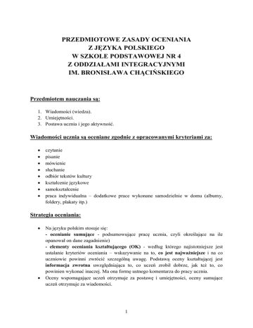 PRZEDMIOTOWE ZASADY OCENIANIA Z JĘZYKA POLSKIEGO W SZKOLE PODSTAWOWEJ NR 4 Z ODDZIAŁAMI INTEGRACYJNYMI IM. BRONISŁAWA CHĄCIŃSKIEGO Przedmiotem nauczania są: 1. Wiadomości (wiedza). 2. Umiejętności. 3. Postawa ucznia i jego aktywność. Wiadomości ucznia są oceniane zgodnie z opracowanymi kryteriami za: czytanie pisanie mówienie słuchanie odbiór tekstów kultury kształcenie językowe samokształcenie praca indywidualna – dodatkowe prace wykonane samodzielnie w domu (albumy, foldery, plakaty itp.) Strategia oceniania: Na języku polskim stosuje się: - ocenianie sumujące - podsumowujące pracę ucznia, czyli określające na ile opanował on dane zagadnienie) - elementy oceniania kształtującego (OK) - według którego najistotniejsze jest ustalanie kryteriów oceniania – wskazywanie na to, co jest najważniejsze i na co uczniowie powinni zwrócić szczególną uwagę. Podstawą oceny kształtującej jest informacja zwrotna uwzględniająca to, co uczeń zrobił dobrze, jak też to, co powinien wykonać inaczej. Ma ona formę ustnego komentarza do pracy ucznia. Oceny wspomagające uczeń otrzymuje za postawę i umiejętności, oceny sumujące uczeń otrzymuje za wiadomości. 1 Osiągnięcia edukacyjne uczniów i ich aktywność są oceniane wg przyjętej cyfrowej skali ocen 1-6. Dopuszcza się stawianie znaków „+” i „-”przy ocenach cząstkowych. Znaki „+” dotyczą najczęściej aktywności (za trzy plusy uczeń otrzymuje ocenę bardzo dobrą) wyrażających się takimi osiągnięciami jak: - zabieranie głosu na lekcji, - aktywna praca w zespole, - sięgnięcie do materiałów źródłowych, - przyniesienie na lekcje samodzielnie sporządzonej pomocy. Znak „+” nie zastępuje oceny, ważnych umiejętności przedmiotowych i ogólnych, których zdobywanie jest celem języka polskiego. Ten stopień oceniania pozostaje w gestii nauczyciela. Praca domowa ucznia w zależności od stopnia trudności jest oceniana znakiem „+” lub oceną, a brak pracy domowej znakiem „-” lub oceną niedostateczną. Brak przygotowania się do lekcji (brak zeszytu, pracy domowej, przyrządów), nie zgłoszony nauczycielowi na początku lekcji oceniany jest oceną niedostateczną. Każda nieodrobiona praca domowa powinna być wykonana na następne zajęcia lekcyjne. W przeciwnym wypadku traktowana jest jako kolejne nieprzygotowanie do zajęć. Uczeń dwa razy w ciągu roku otrzymuje ocenę klasyfikacyjną – śródroczną i roczną. Ocena końcowa jest dokonywana za cały rok nauki. Żadna z ocen końcowych nie jest średnią arytmetyczną uzyskanych. Oceny cząstkowe mają różną wagę: 1) waga 50% - Wiadomości (kolor ocen czerwony): próbne testy diagnostyczne wewnętrzne i zewnętrzne, prace klasowe z całego działu, wypracowania klasowe, sprawdziany/dyktanda, testy, oryginalne działania twórcze wykraczające poza podstawę programową, oceny uzyska z popraw prac klasowych, testów, sprawdzianów 2) waga 30% - Umiejętności (kolor ocen niebieski): wypracowania domowe, krótkie formy sprawdzania wiedzy i umiejętności (kartkówki, odpowiedzi ustne), prace wynikające ze specyfiki przedmiotu. 3) Waga 20% - Postawa (kolor ocen czarny) Praca na lekcji (aktywność), prace domowe, prace dla chętnych, przygotowanie do zajęć, prowadzenie zeszytu. Największą wartość (ciężar) przedstawiają te oceny, które dotyczą umiejętności przedmiotowych tj.: - samodzielnego tworzenia dłuższych tekstów mówiących, - samodzielnego redagowania dłuższych form wypowiedzi pisemnych dotyczących tekstów kultury (prace pisemne, semestralne, kontrolne, klasowe), - samodzielnego odbioru tekstów kultury (literatury), ich właściwego rozumienia i interpretowania, - wiedzy teoretycznej i praktycznych umiejętności z zakresu nauki o języku, - znajomość zasad ortografii i poprawnej pisowni (uczeń nie popełnia zasadniczych błędów) nie tylko w dyktandach, lecz wszelkich formach wypowiedzi pisemnej. 2 Dopuszcza się sytuację, że uczeń może się 3 razy nie przygotować na język polski, zgłaszając ten fakt nauczycielowi i nie ponosząc żadnych konsekwencji. Każde kolejne nieprzygotowanie odznaczane jest minusem. Trzy minusy są znaczne z oceną niedostateczną. Przy ustaleniu oceny klasyfikacyjnej nauczyciel bierze pod uwagę indywidualne możliwości ucznia, jego predyspozycje intelektualne, rozwój. Dysfunkcje zaobserwowane przez nauczyciela w czasie pracy na lekcji, jak również potwierdzone orzeczeniem z poradni psychologiczno pedagogicznej. Na koniec semestru (roku szkolnego) uczeń nie może odpowiadać, by uzyskać wyższą ocenę. Stosowane narzędzia i procedury oceniania: Narzędzia stosowane obowiązkowo to: Prace klasowe w formie dłuższej, sprawdziany, testy, dyktanda są przechowywane przez nauczyciela przez do wglądu jeden rok. Rodzicom (prawnym opiekunom); prace będą udostępniane do wglądu podczas konsultacji w ciągu miesiąca od otrzymanej oceny. Sprawdziany testowe z kształcenia językowego. Dyktanda dłuższe – ilość w zależności od poziomu klasy, do uznania nauczyciela.. Dyktanda krótkie, np. wyrazowe (10 – minutowe) w zależności od poziomu umiejętności ortograficznych uczniów (do uznania przez uczących nauczycieli). W klasach V i VI odpowiednikiem prac klasowych mogą być testy szóstoklasisty, próbne testy szóstoklasisty, testy badające wyniki nauczania z przedmiotu. Praca klasowa, sprawdzian, dyktando są obowiązkowe dla ucznia (jeżeli uczeń z przyczyn losowych nie mógł przystąpić do pracy klasowej w wyznaczonym terminie, to przystępuje do niej w terminie wyznaczonym przez nauczyciela, w przeciwnym wypadku pisze na następnej lekcji). Uczeń może raz przystąpić do poprawy każdej oceny ze sprawdzianu, dyktanda lub pracy klasowej w ciągu dwóch tygodni, w terminie uzgodnionym z nauczycielem. Prace klasowe i sprawdziany zapowiadane są z tygodniowym wyprzedzeniem. Do dziennika wpisuje się każdą ocen