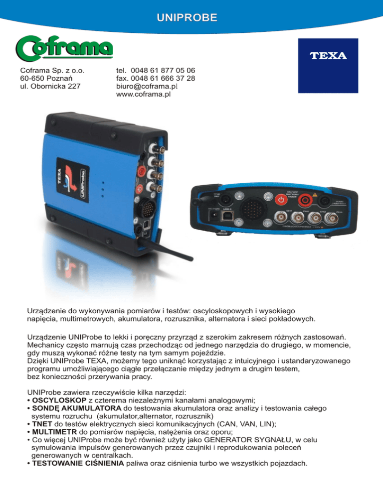 UNIPROBE Coframa Sp. z o.o. 60-650 Poznań ul. Obornicka 227 tel. 0048 61 877 05 06 fax. 0048 61 666 37 28 [email protected] www.coframa.pl Urządzenie do wykonywania pomiarów i testów: oscyloskopowych i wysokiego napięcia, multimetrowych, akumulatora, rozrusznika, alternatora i sieci pokładowych. Urządzenie UNIProbe to lekki i poręczny przyrząd z szerokim zakresem różnych zastosowań. Mechanicy często marnują czas przechodząc od jednego narzędzia do drugiego, w momencie, gdy muszą wykonać różne testy na tym samym pojeździe. Dzięki UNIProbe TEXA, możemy tego uniknąć korzystając z intuicyjnego i ustandaryzowanego programu umożliwiającego ciągłe przełączanie między jednym a drugim testem, bez konieczności przerywania pracy. UNIProbe zawiera rzeczywiście kilka narzędzi: • OSCYLOSKOP z czterema niezależnymi kanałami analogowymi; • SONDĘ AKUMULATORA do testowania akumulatora oraz analizy i testowania całego systemu rozruchu (akumulator,alternator, rozrusznik) • TNET do testów elektrycznych sieci komunikacyjnych (CAN, VAN, LIN); • MULTIMETR do pomiarów napięcia, natężenia oraz oporu; • Co więcej UNIProbe może być również użyty jako GENERATOR SYGNAŁU, w celu symulowania impulsów generowanych przez czujniki i reprodukowania poleceń generowanych w centralkach. • TESTOWANIE CIŚNIENIA paliwa oraz ciśnienia turbo we wszystkich pojazdach. UNIPROBE Dane techniczne: • Połączenie z wyświetlaczem w warsztacie: Bluetooth, USB • Może być zastosowany do samochodów osobowych, ciężarowych, motocykli • Łatwy w użytkowaniu • Integracja z bazą danych Napięcie zasilania: 8 - 32 VDC Napięcie doładowania w akumulatorze wewnętrznym: 10 - 32 VDC Wewnętrzna bateria litowa, 7,4 V, 1 A/h Maksymalne natężenie prądu: 1,2 A przy 12 V Wewnętrzna autonomia baterii: do 5 godzin Temperatura robocza: 0/+45°C Temperatura przechowywania: -20/+60°C Robocza wilgotność względna: 10%-80% niekondensująca się Wymiary: 155x178x55 mm (poza anteną Bluetooth ) Masa: 1,2 kg Zastosowane standardy: Dyrektywa 1999/05/EC Zgodność elektromagnetyczna: ETSI EN 301 489-17 V1.2.1, EN 61326/1 Bezpieczeństwo: EN60950-1, EN61010/1 OSCYLOSKOP Kanały: 4 niezależne kanały wejściowe z pasmem analogowym 10 MHz (-3 dB). Czas próbkowania 20Mpróbek/sekundę 10 bit z 1 lub 2 kanałami aktywnymi, 10Mpróbek/sekundę 10 bit z 3 lub 4 kanałami aktywnymi. Maks wejściowe napięcie: +/- 50 V max, złącze AC lub DC. Skala pionowa dla każdego kanału: 20 mV/Div do 50 V/Div Skala pozioma: od 500 ns/Div do 5s/Div Zapłon: źródło CH1, CH2, CH3, CH4, do wyboru, opóźnienie zapłonu. Tryb wyświetlenia: normalny, automatyczny, pojedynczy Pomiar następujących wartości: częstotliwość, okres, RMS, V maks, V min. MULTIMETR Izolacja galwaniczna do1 kV zabezpieczająca pomiary. Pomiary napięcia Maksymalny pomiar napięcia: ± 400VDC, impedancja wejściowa 4,7 MΩ, 3 -cyfrowa rozdzielczość. Trzy zakresy wartości są dostępne, za pomocą ręcznego lub automatycznego wyboru skali 0-6 V, 6-60 V, 60-400 V AC/DC. Pomiar oporu Trzy zakresy wartości są dostępne, za pomocą ręcznego lub automatycznego wyboru skali: 0-1000 Ω, 1-100 kΩ, 100 - 10 MΩ, rozdzielczość: 3 cyfrowa Pomiar natężenia Pomiary natężenia wykonywane przez połączenie szeregu sond TEXA “BICOR” z gniazdkami w przedniej części urządzenia. Test ciągłości, test diody. FUNKCJA TNET Usuwanie usterek na sieciach CAN ISO11898, ISO11519. FUNKCJA BPP Usuwanie usterek na systemach zapłonowych. Pomiary napięcia: DC aż do 50 VDC.