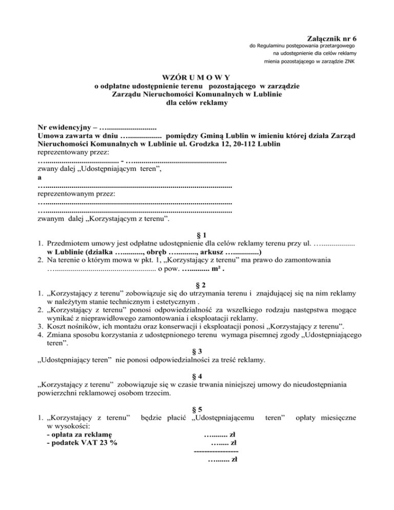 Załącznik nr 6 do Regulaminu postępowania przetargowego na udostępnienie dla celów reklamy mienia pozostającego w zarządzie ZNK WZÓR U M O W Y o odpłatne udostępnienie terenu pozostającego w zarządzie Zarządu Nieruchomości Komunalnych w Lublinie dla celów reklamy Nr ewidencyjny – …......................... Umowa zawarta w dniu …................. pomiędzy Gminą Lublin w imieniu której działa Zarząd Nieruchomości Komunalnych w Lublinie ul. Grodzka 12, 20-112 Lublin reprezentowany przez: …..................................... - …............................................... zwany dalej „Udostępniającym teren”, a ….............................................................................................. reprezentowanym przez: ….............................................................................................. ….............................................................................................. zwanym dalej „Korzystającym z terenu”. §1 1. Przedmiotem umowy jest odpłatne udostępnienie dla celów reklamy terenu przy ul. …................. w Lublinie (działka ….........., obręb ….........., arkusz ….............) 2. Na terenie o którym mowa w pkt. 1, „Korzystający z terenu” ma prawo do zamontowania …................................................... o pow. ….......... m² . §2 1. „Korzystający z terenu” zobowiązuje się do utrzymania terenu i znajdującej się na nim reklamy w należytym stanie technicznym i estetycznym . 2. „Korzystający z terenu” ponosi odpowiedzialność za wszelkiego rodzaju następstwa mogące wynikać z nieprawidłowego zamontowania i eksploatacji reklamy. 3. Koszt nośników, ich montażu oraz konserwacji i eksploatacji ponosi „Korzystający z terenu”. 4. Zmiana sposobu korzystania z udostępnionego terenu wymaga pisemnej zgody „Udostępniającego teren”. §3 „Udostępniający teren” nie ponosi odpowiedzialności za treść reklamy. §4 „Korzystający z terenu” zobowiązuje się w czasie trwania niniejszej umowy do nieudostępniania powierzchni reklamowej osobom trzecim. 1. „Korzystający z terenu” w wysokości: - opłata za reklamę - podatek VAT 23 % §5 będzie płacić „Udostępniającemu …........ zł …..... zł ----------------…....... zł teren” opłaty miesięczne 2. „Udostępniający teren” zobowiązuje się do wystawiania comiesięcznych faktur VAT zgodnie z oświadczeniem „Korzystającego z terenu”- załącznik nr 1 do umowy. 3. „Korzystający z terenu” zobowiązuje się uiszczania opłat miesięcznych w terminach określonych na fakturach. 4. W przypadku nie pobierania faktur „Korzystający z terenu” jest obowiązany uiszczać opłaty miesięczne ujęte w § 5 pkt. 1 z góry bez uprzedniego wezwania w terminie do 10-go każdego miesiąca kalendarzowego 5. Zgodnie z art. 454 § 1 k. c. za dzień dokonania zapłaty, uznawany jest dzień wpisu wpłaty na konto: BANK PEKAO S.A. V 0/LUBLIN …............................................................., a nie data dokonania przelewu. 6. Za opóźnienia w uiszczaniu należności będą pobierane odsetki zgodnie z obowiązującymi przepisami. §6 1. Przed podpisaniem umowy „Korzystający z terenu” wniósł kaucję zabezpieczającą w kwocie …............... zł zdeponowaną na rachunku bankowym „Udostępniającego teren” zabezpieczającą należności „Udostępniającego teren”. Wpłacone wadium zostało zaliczone na poczet kaucji zabezpieczającej. 2. Kaucja służy zabezpieczeniu należności „Udostępniającego teren”. Po ustaniu stosunku umowy „Udostępniający teren” ma prawo potrącić swoje należności z kaucji do pełnej jej wysokości. 3. W przypadku oddania terenu, złożona kaucja ulega zwrotowi na rzecz „Korzystającego z terenu” wraz z odsetkami wynikającymi z oprocentowania kwoty kaucji na bieżącym rachunku „Udostępniającego teren” po potrąceniu należności z tytułu opłat i/lub wyrządzonej szkody. §7 1. Udostępniający teren dokonywać będzie zmian: a/ stawki opłat corocznie od dnia 1 marca każdego roku poczynając od roku kalendarzowego po zawarciu umowy o wskaźnik inflacji odpowiadający średniorocznemu wzrostowi cen towarów i usług konsumpcyjnych ogółem w roku poprzednim zgodnie z Komunikatem Prezesa GUS ogłaszanym każdego roku w Monitorze Polskim; b/ ustawowego podatku VAT zgodnie z obowiązującymi przepisami. 2. Zmiany dokonane zgodnie z pkt. 1 a , b nie wymagają wypowiedzenia umowy ani formy aneksu lecz jednie pisemnego zawiadomienia „Korzystającego z terenu” przez „Udostępniającego teren”. §8 1. Umowa może być wypowiedziana przez każdą ze stron na miesiąc naprzód ze skutkiem na koniec miesiąca kalendarzowego. 2. Zwłoka w zapłacie należności za dwa okresy płatności uprawnia „Udostępniającego teren” do rozwiązania umowy bez zachowania okresu wypowiedzenia. §9 1. Każda zmiana postanowień niniejszej umowy wymaga formy pisemnej w postaci aneksu pod rygorem nieważności. 2. „Korzystający z terenu” zobowiązany jest informować na piśmie „Udostępniającego teren” o każdorazowej zmianie adresu zamieszkania/siedziby. Korespondencja wysyłana na ostatni wskazany adres wywiera skutek korespondencji doręczonej. § 10 W przypadku rozwiązania niniejszej umowy, „Korzystający z terenu” zobowiązuje się do usunięcia reklamy oraz wszelkich elementów ją mocujących, a także przywrócenia terenu na którym umieszczona jest reklama do stanu pierwotnego . § 11 Umowa wchodzi w życie …................... i zostaje zawarta na czas nieoznaczony. § 12 W sprawach nie unormowanych niniejszą umową mają zastosowanie przepisy kodeksu cywilnego. § 13 Wszelkie kwestie sporne mogące wynikać z niniejszej umowy będą rozstrzygane polubownie, w ostateczności zostaną podane do rozstrzygnięcia przez sąd właściwy dla siedziby „Udostępniającego te