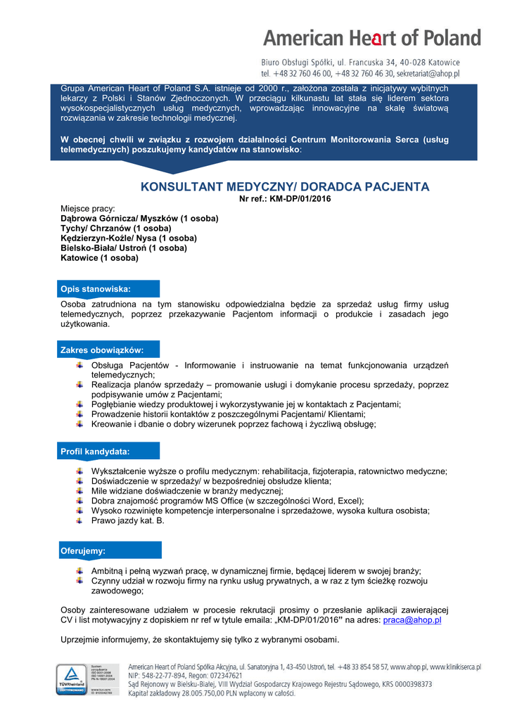 Grupa American Heart of Poland S.A. istnieje od 2000 r., założona została z inicjatywy wybitnych lekarzy z Polski i Stanów Zjednoczonych. W przeciągu kilkunastu lat stała się liderem sektora wysokospecjalistycznych usług medycznych, wprowadzając innowacyjne na skalę światową rozwiązania w zakresie technologii medycznej. W obecnej chwili w związku z rozwojem działalności Centrum Monitorowania Serca (usług telemedycznych) poszukujemy kandydatów na stanowisko: KONSULTANT MEDYCZNY/ DORADCA PACJENTA Nr ref.: KM-DP/01/2016 Miejsce pracy: Dąbrowa Górnicza/ Myszków (1 osoba) Tychy/ Chrzanów (1 osoba) Kędzierzyn-Koźle/ Nysa (1 osoba) Bielsko-Biała/ Ustroń (1 osoba) Katowice (1 osoba) Opis stanowiska: Osoba zatrudniona na tym stanowisku odpowiedzialna będzie za sprzedaż usług firmy usług telemedycznych, poprzez przekazywanie Pacjentom informacji o produkcie i zasadach jego użytkowania. Zakres obowiązków: Obsługa Pacjentów - Informowanie i instruowanie na temat funkcjonowania urządzeń telemedycznych; Realizacja planów sprzedaży – promowanie usługi i domykanie procesu sprzedaży, poprzez podpisywanie umów z Pacjentami; Pogłębianie wiedzy produktowej i wykorzystywanie jej w kontaktach z Pacjentami; Prowadzenie historii kontaktów z poszczególnymi Pacjentami/ Klientami; Kreowanie i dbanie o dobry wizerunek poprzez fachową i życzliwą obsługę; Profil kandydata: Wykształcenie wyższe o profilu medycznym: rehabilitacja, fizjoterapia, ratownictwo medyczne; Doświadczenie w sprzedaży/ w bezpośredniej obsłudze klienta; Mile widziane doświadczenie w branży medycznej; Dobra znajomość programów MS Office (w szczególności Word, Excel); Wysoko rozwinięte kompetencje interpersonalne i sprzedażowe, wysoka kultura osobista; Prawo jazdy kat. B. Oferujemy: Ambitną i pełną wyzwań pracę, w dynamicznej firmie, będącej liderem w swojej branży; Czynny udział w rozwoju firmy na rynku usług prywatnych, a w raz z tym ścieżkę rozwoju zawodowego; Osoby zainteresowane udziałem w procesie rekrutacji prosimy o przesłanie aplikacji zawierającej CV i list motywacyjny z dopiskiem nr ref w tytule emaila: „KM-DP/01/2016” na adres: [email protected] Uprzejmie informujemy, że skontaktujemy się tylko z wybranymi osobami.