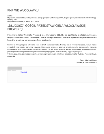 KMP WE WŁOCŁAWKU Źródło: http://www.wloclawek.kujawsko-pomorska.policja.gov.pl/kb4/informacje/63938,Dlugosz-goscil-przedstawiciela-wloclawskiej-p rewencji.html Wygenerowano: Środa, 8 marca 2017, 01:54 „DŁUGOSZ” GOŚCIŁ PRZEDSTAWICIELA WŁOCŁAWSKIEJ PREWENCJI Przedstawicielka Wydziału Prewencji gościła wczoraj (31.03.) na spotkaniu z młodzieżą licealną Długosza we Włocławku. Tematyka cyberprzestępczości oraz szerokie spektrum odpowiedzialności karnej to problemy poruszane podczas spotkania. Internet to dobry przyjaciel człowieka, okno na świat, skarbnica wiedzy. Niestety jest to również narzędzie, którym można wyrządzić innej osobie ogromną krzywdę. Stosowanie przemocy poprzez prześladowanie, zastraszanie, nękanie, wyśmiewanie innych osób z wykorzystaniem internetu czy też sms-a, e-maila, witryny internetowej, forów dyskusyjnych, portali społecznościowych to niestety stosunkowo częste przypadki, którymi muszą „zająć” się policjanci. O takich zagadnieniach i odpowiedzialności karnej przypomniałam młodzieży przedstawicielka Wydziału Prewencji Edyta Olszewska. Autor: Lidia Popielińska Publikacja: Lidia Popielińska Ocena: 0/5 (0) Tweetnij