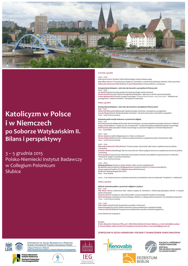 Czwartek, 3 grudnia 16:30 – 17:00 Andrzej Jan Szwarc Dyrektor Polsko-Niemieckiego Instytutu Badawczego, Abp Wiktor Skworc Przewodnicz cy Zespoøu ds. Kontaktów z Konferencj Episkopatu Niemiec: Søowo powitalne Aleksandra Chylewska-Tölle (Søubice), Urszula P kala (Mainz): Wprowadzenie w sympozjum Korespondencja biskupów z 1965 roku i jej znaczenie w perspektywie historycznej I 17:00 – 18:30 Jan Rydel (Kraków): Kontakty polsko-niemieckie po drugiej wojnie wiatowej Severin Gawlitta (Essen): Historia korespondencji biskupów z 1965 roku w wietle najnowszych bada Lothar Quinkenstein (Pozna ): Jerzego Ficowskiego "Wniebowzi cie Miriam z ulicy zim 1942" – Refleksje nad paradygmatem "polsko-niemieckim" z perspektywy ydowskiej Pi tek, 4 grudnia Katolicyzm w Polsce i w Niemczech po Soborze Watyka skim II. Bilans i perspektywy 3 – 5 grudnia 2015 Polsko-Niemiecki Instytut Badawczy w Collegium Polonicum Søubice Korespondencja biskupów z 1965 roku i jej znaczenie w perspektywie historycznej II 9:30 – 10:30 Ulrike Link-Wieczorek (Oldenburg): Pojednanie polsko-niemieckie z perspektywy ewangelickiej Urszula P kala (Mainz): Pojednanie polsko-niemieckie i niemiecko-francuskie w kontek cie europejskim 10:30 – 10:45 Przerwa na kaw Niemiecko-polski transfer kulturowy w przestrzeni religijnej 10:45 – 12:15 Anna Kochanowska-Nieborak (Pozna ): Rola stereotypów w procesie pojednania pomi dzy Niemcami i Polakami Gregor Feindt (Mainz): "Przebaczy , lecz nie zapomnie ". Pami jako podstawa pojednania polsko-niemieckiego Rafaø ytyniec (Eøk): Specyfika transferu kulturowego w przestrzeni religijnej na "Ziemiach Odzyskanych" 12:15 – 13:30 Obiad 13:30 – 14:30 Marek Jakubów (Lublin): Religijni pisarze w Polsce i w Niemczech Szymon Bojdo (Søubice): Polscy i niemieccy publicy ci katoliccy o pojednianiu polsko-niemieckim po 1989 14:30 – 15:00 Przerwa na kaw 15:00 – 16:30 Aleksandra Chylewska-Tölle (Søubice): "Ecclesia semper reformanda" jako motyw wspóøczesnej prozy polskiej i niemieckiej Christian Heidrich (Heidelberg): Nikt nie wraca taki sam. Motyw pielgrzymowania we wspóøczesnej literaturze polskiej i niemieckiej Anna Szyndler (Cz stochowa): Shoah jako temat polsko-niemiecki na przykøadzie recepcji dramatu R. Hochhutha "Namiestnik" (1963) w kontek cie ko cielnym 16:30 – 17:00 Przerwa na kaw 17:00 – 18:30 Dyskusja panelowa: Niemieccy i polscy katolicy wobec wyzwa wspóøczesno ci Bp Matthias Heinrich (Berlin), Wolfgang Iskraut (Cottbus/Frankfurt O.) Tomasz Kycia (Berlin), Georg Langosch (Frankfurt O.), Zbigniew Nosowski (Warszawa) Moderacja: Andrzej Draguøa (Szczecin) 18:30 – 20:00 Kolacja 20:00 – 21:00 Impulsy duchowe. Spotkanie ekumeniczne (Katolickie Centrum Studenckie "Parakletos" w Søubicach) Sobota, 5 grudnia Zbli enie niemiecko-polskie w przestrzeni religijnej w praktyce 9:30 – 11:00 Abp Wiktor Skworc (Katowice): Rola i zadania Zespoøu ds. Kontaktów z Konferencj Episkopatu Niemiec w relacjach polsko-niemieckich Jörg Lüer (Berlin): Fundacja im. Maximiliana Kolbe w procesie pojednania polsko-niemieckiego Manfred Deselaers (O wi cim): Centrum Dialogu i Modlitwy w dialogu polsko-niemieckim i chrze cija sko- ydowskim 11:00 – 11:30 Przerwa na kaw 11:30 – 13:00 Adam Kalbarczyk (Pozna ): Duszpasterstwo polskie w Niemczech Andrzej Draguøa (Szczecin): Polsko-niemiecka wymiana akademicka w dziedzinie teologii Tadeusz Ku micki (Søubice): Duszpasterstwo akademickie na polsko-niemieckim pograniczu 13:00 Zako czenie sympozjum Kontakt: dr hab. Aleksandra Chylewska-Tölle, prof. UAM, Polsko-Niemiecki Instytut Badawczy, e-mail: [email protected] dr Urszula P kala, Leibniz-Institut für Europäische Geschichte (IEG), e-mail: [email protected] SYMPOZJUM W J ZYKU NIEMIECKIM I POLSKIM Z TèUMACZENIEM SYMULTANICZNYM